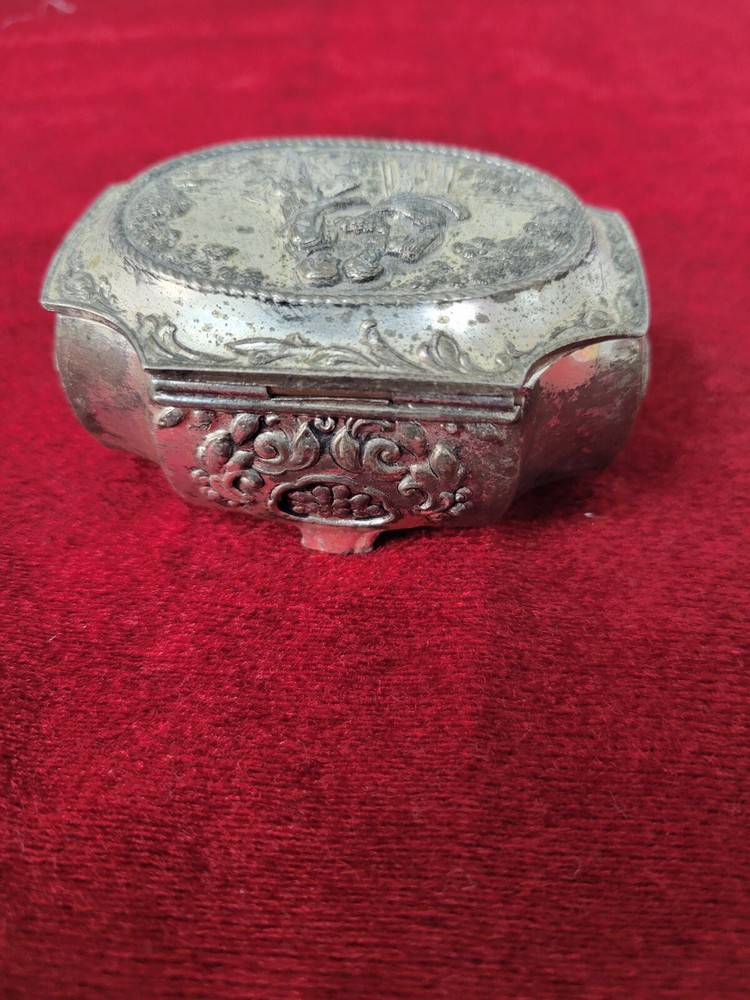 Vintage silverplate (?) trinket box with red velvet interior. Victorian style couple on the top. Top has some wear due to age and use. Interior is in very good condition. Hinge on lid is very good. 3" wide at the widest point and 2" across. Item will ship within one business day of completed sale. I DO NOT ship media mail. All items will be securely packaged and will ship USPS Ground Advantage, Priority mail, UPS or Fedex depending on weight and size. I do offer a 30-day money back guarantee on almost every item I sell. If there are issues with your item, please return it for a refund. Refund will be issued upon return of item. Some restrictions may apply. It is always appreciated if you contact me before starting a return so that I can try and assist without the hassle of a return.