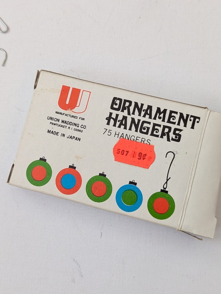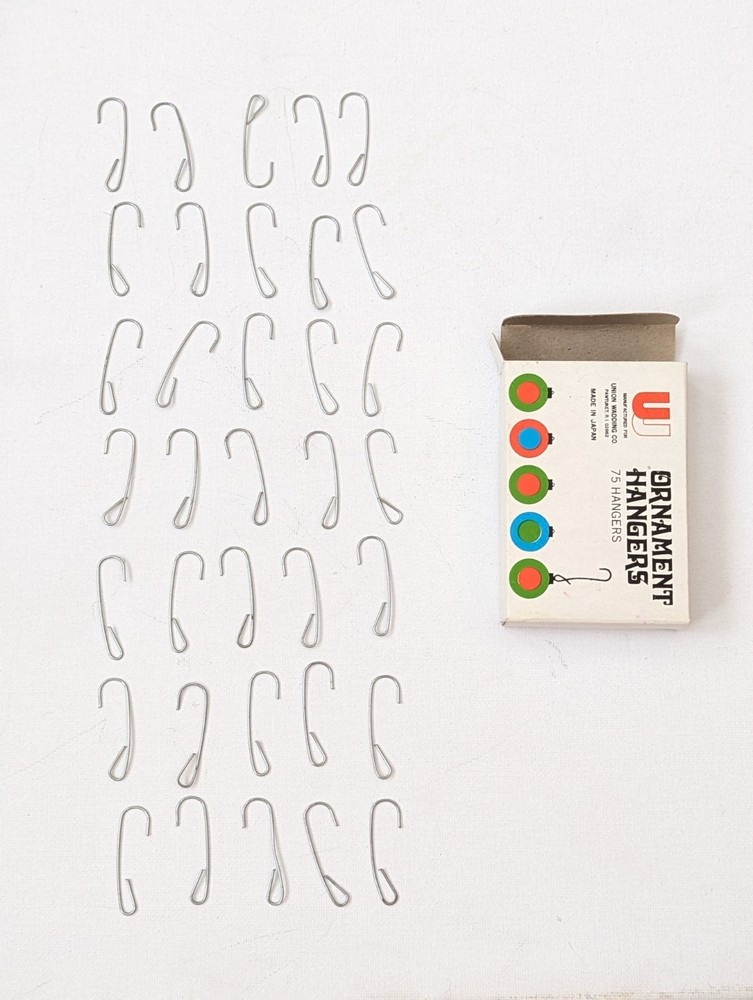 Vintage Japan Union Wadding Christmas Tree Ornament Hangers -35 Hooks in Box **Box is in very good condition. ONLY 35 hooks in the box. Each hook measures approx 1.5 inches. **SEE PHOTOS! Shipped quickly and carefully from Kansas! From a pet-free & smoke-free home. Thank you for looking 😊 ------------------------