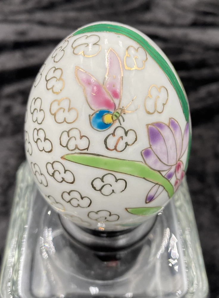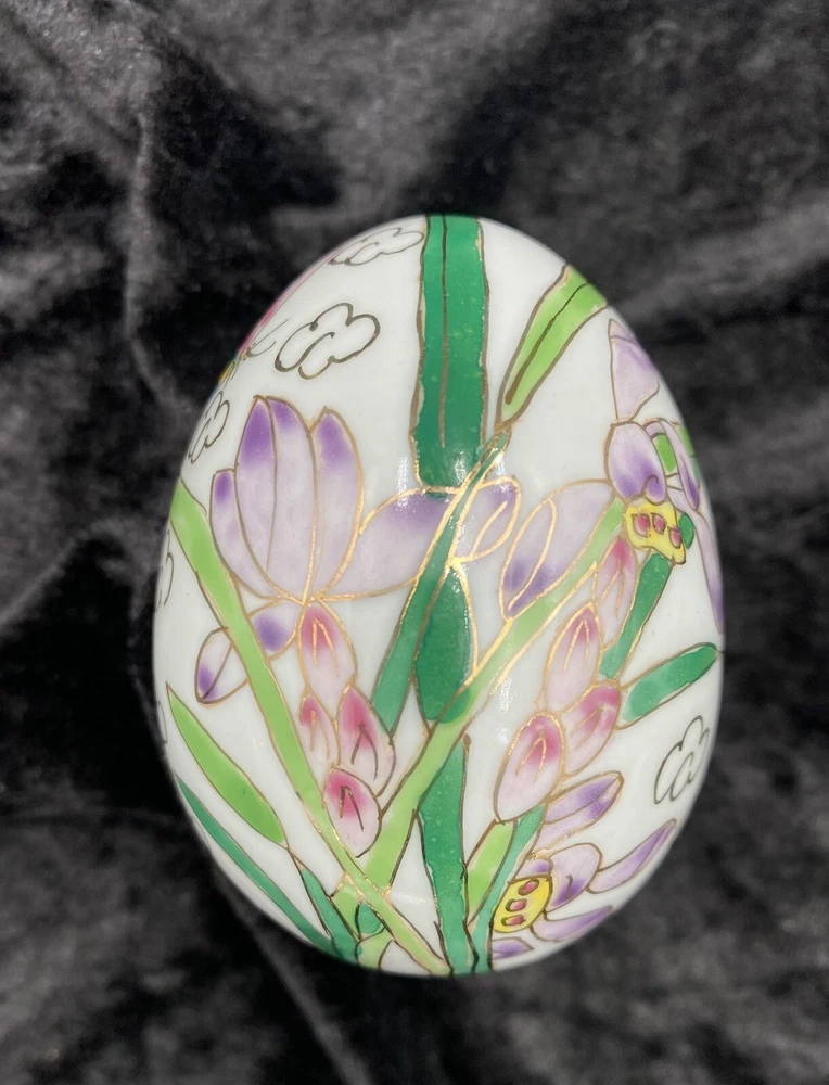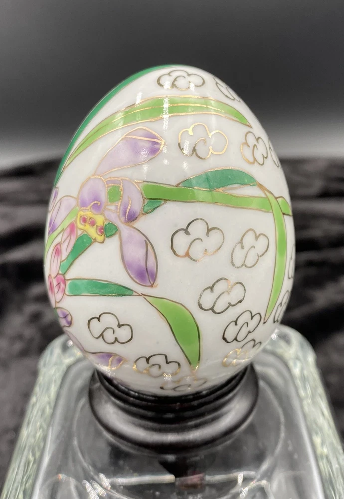 This vintage Japanese porcelain egg is a beautiful addition to any collection. The egg is hand-painted with delicate purple irises, green leaves, and a lovely floating butterfy, all surrounded by, and highlighted with, gold gilt. The egg stands at 2.7 inches tall and measures 2.1 inches in width. The egg comes with a wooden three-footed stand, adding to its charm and ease of display. Its weight is 3.2 ounces with the stand, making it easy to move and display in any room of your home. This is a beautiful egg in excellent condition. There are no chips, cracks or signs of wear. I have another egg of similar design, but with pink lotus flowers. If you would like both, I am happy to combine shipping and give you the savings. Please see my listing at 2cuddlebugs24. Thank you!