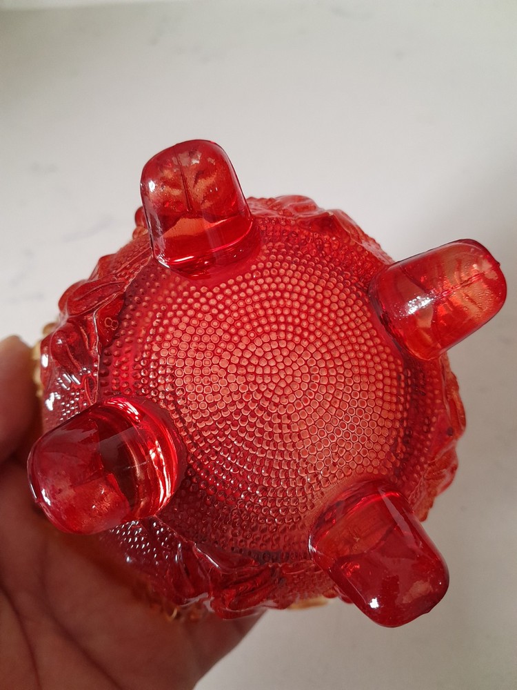 This vintage Jeanette candy dish is a round red glass compote with a lid. It is American-made, dating back to the 1960s. The pressed glass technique gives it a unique appearance, and it has a capacity of 1 cup. Its amberina color adds to its vintage appeal, making it a charming addition to any collection. Some color wear on lid