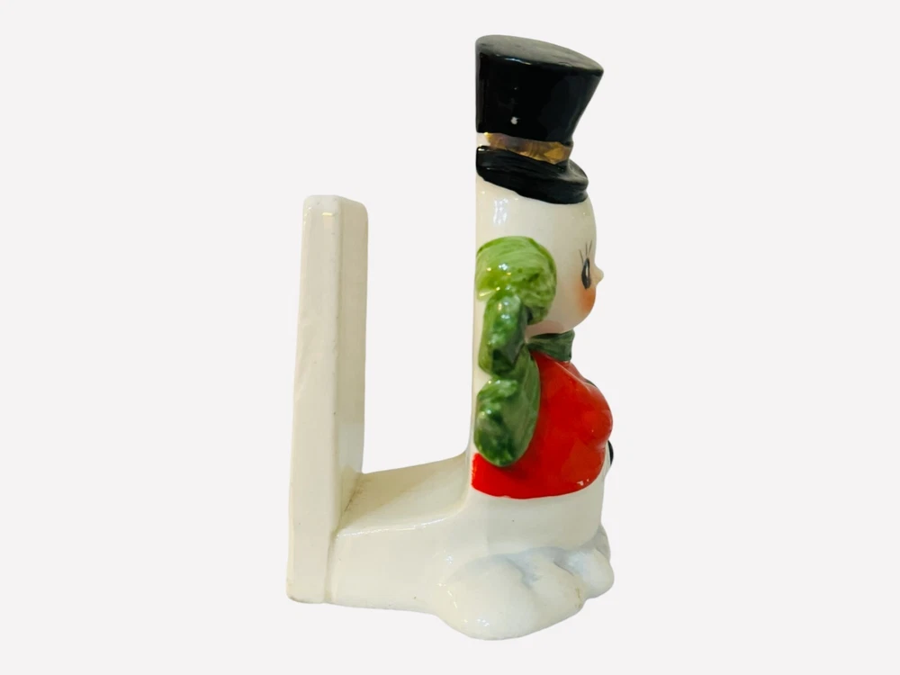 This charming little fellow is sure to warm your heart! His sweet face, with those iconic coal-black eyes, long lashes, and rosy cheeks, radiates joy. He wears a festive black hat decorated with holly berries and holiday greenery, along with a vibrant red coat, pine green scarf, earmuffs, and matching mittens. In his hands, he holds a beautifully wrapped Christmas present, complete with a gold bow, while standing on a snow drift. Standing approximately 4 ½” inches tall, this vintage piece is in excellent condition with no chips or cracks. There is only minimal age-related wear, including a few tiny specks of paint wear on his wrist, coat, and hat (glares are from the camera). He retains his original black Josef Originals and Japan tag, adding to his collectible charm. The snowmen made by Josef Originals have got to be some of the cutest!!