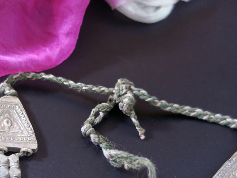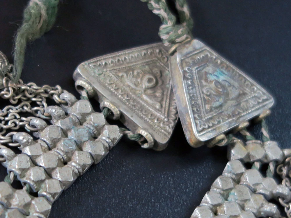 This is very-old necklace was handmade during the early to mid-1900's in Kashmir along the Old Silk Road of Central Asia. It is old vintage tribal jewelry, not a new reproduction. More measurements and relevant info are listed at the end of this description. This style of necklace is a traditional one, having been worn in Kashmir for generations - especially in the romantic Lake Dal region. The distinctive, large pendant in the center has incised floral designs with 2 vibrant red-beads to ward off the evil-eye. Long charm-dangles hang below, swaying with movement. It was very sturdily made, and does not bend. Lots of bold 3-lobed spacer beads extend up the sides, with more charm-dangles hanging freely below. Ornate cone-ends gather the necklace together near the back. There are more-recent ties for adjusting the length. This necklace is in excellent, collectible condition, with a rich age-patina and very mild wear-patterns. Patina reflects the light when photographed, so items often look brighter in images than they really are. Perfect for collectors of old Kashmiri jewelry, as well as for festivals, dance, theater and making a dramatic statement. MEASUREMENTS: Dimensions of Center Pendant = 6 inches long x 4 inches wide Length = Adjustable with ties Weight = 8.6 oz TM image library = 5-7-2025 Please read this about my old/vintage tribal-jewelry beforehand: Because of their age and distinguished history, old tribal and vintage pieces may have some of their dangles/charms/beads missing, replaced, damaged, or refurbished, along with other flaws, defects, and/or debris. Sharp and/or irregular edges are also possible. Because they were handmade, they are rarely symmetrical. Please note that age-patina reflects the light when photographed, so items look brighter in images than they really are. Sold as-is. Not for use by children. Returns gladly accepted within 30 days.