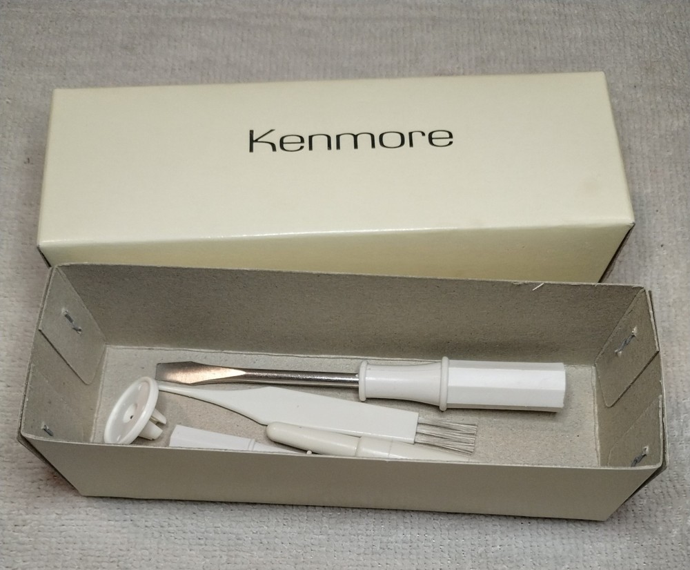 These are vintage, barely used sewing machine tools/accessories with vintage cardboard box. This vintage Kenmore sewing machine repair kit includes a screwdriver set specifically designed for sewing machine maintenance and repair. Perfect for those looking to fix or adjust their sewing machine themselves, this set provides the necessary tools to keep your machine in top condition. With a focus on sewing, this kit is ideal for crafters and seamstresses looking to keep their vintage Kenmore sewing machine in good working order.