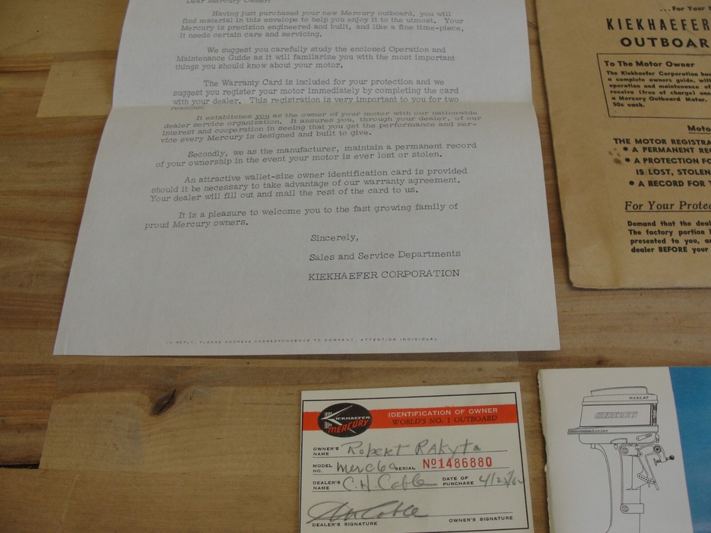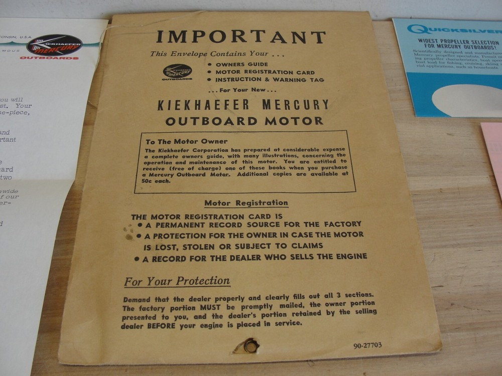 This is a vintage lot of paperwork for a Kiekhaefer Mercury Outboard motor . Thanks for looking...