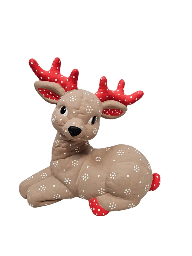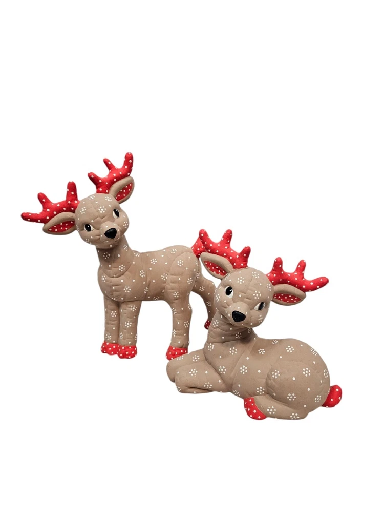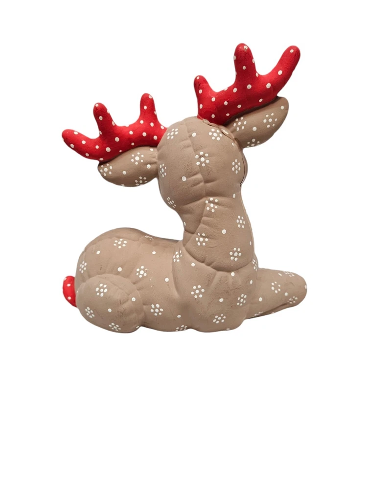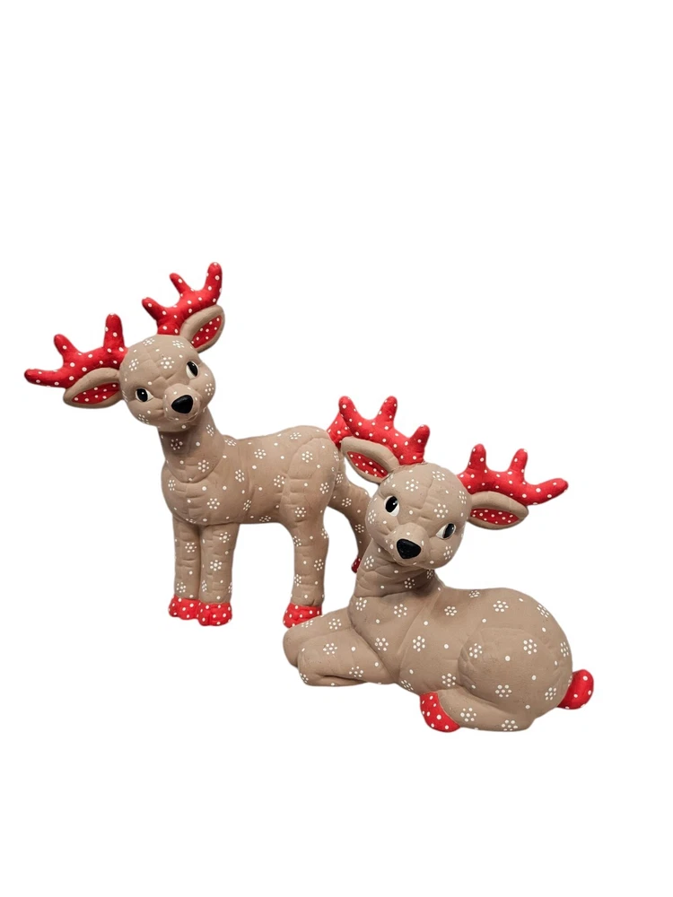 Vintage Kimple Mold Ceramic Hobbyist Reindeer Snowflake Hand Painted Set of 2 In excellent condition Vintage Kimple Mold Ceramic Hobbyist Reindeer Snowflake Hand Painted Set of 2. Features vintage 80s Kimple mold hobbyist hand painted reindeer set of 2, adorable snowflake painted reindeer by a careful DIY artist (unsigned), charming winter holiday decor, Christmas reindeer, unglazed ceramic. Measurements standing Reindeer height 11" length 11" depth 4" laying Reindeer height 8" length 8" depth 4" Fabric ceramic This is a pre-owned item that may show signs of wear. In excellent condition, no flaws. The reindeer laying down has a flaw on the paint - please see pictures for further details.