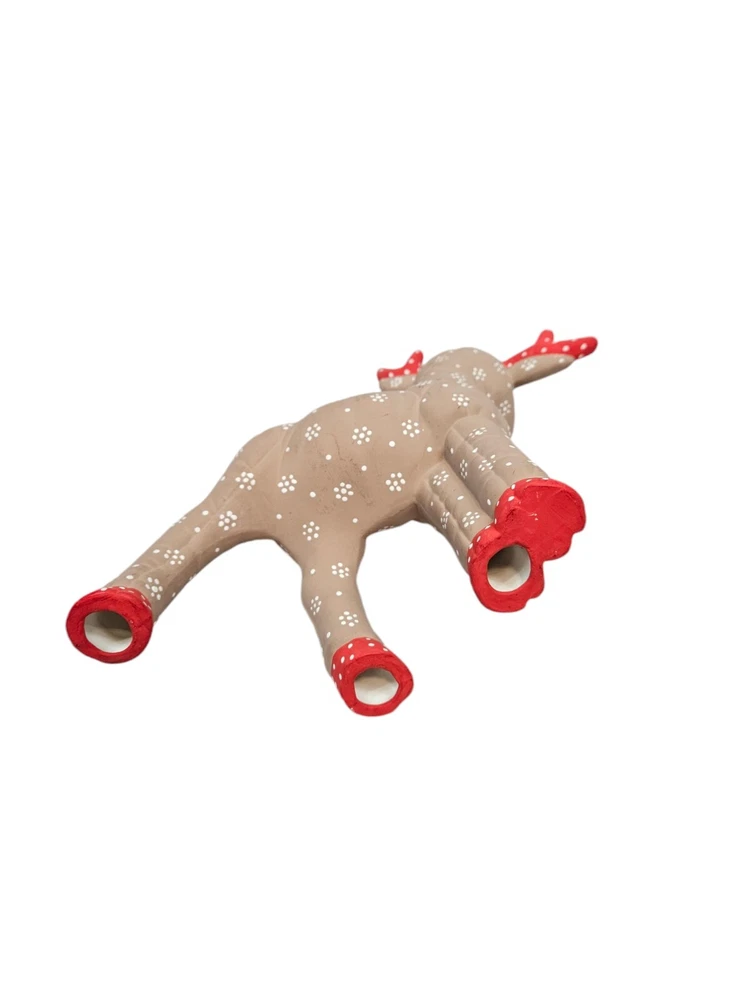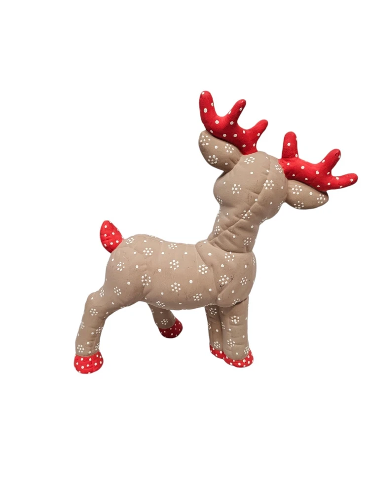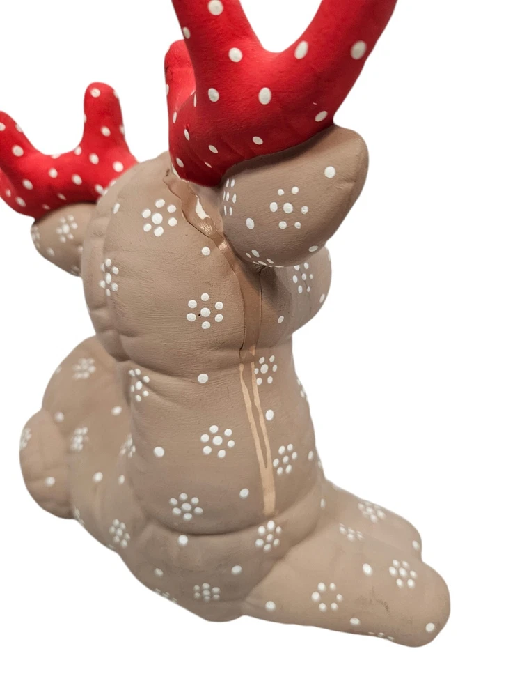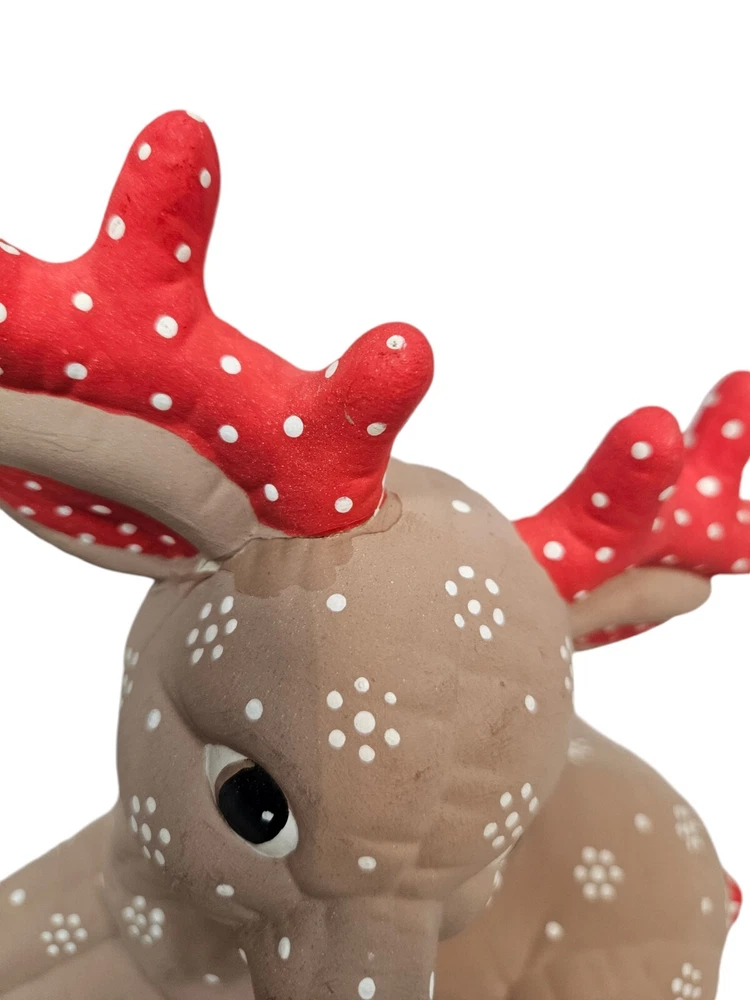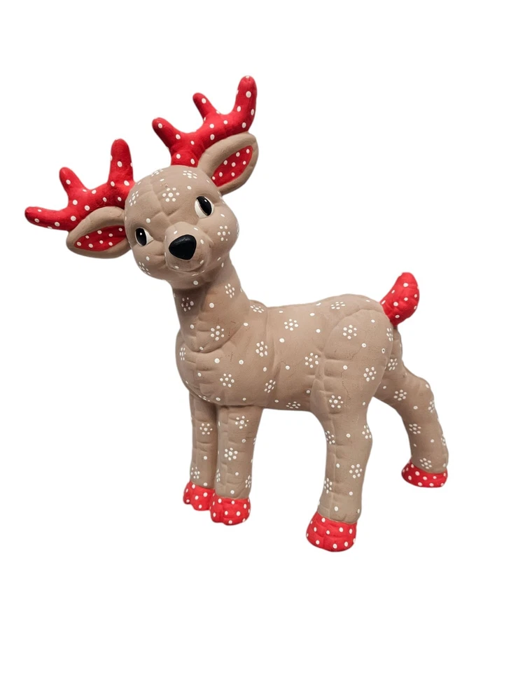 Vintage Kimple Mold Ceramic Hobbyist Reindeer Snowflake Hand Painted Set of 2 In excellent condition Vintage Kimple Mold Ceramic Hobbyist Reindeer Snowflake Hand Painted Set of 2. Features vintage 80s Kimple mold hobbyist hand painted reindeer set of 2, adorable snowflake painted reindeer by a careful DIY artist (unsigned), charming winter holiday decor, Christmas reindeer, unglazed ceramic. Measurements standing Reindeer height 11" length 11" depth 4" laying Reindeer height 8" length 8" depth 4" Fabric ceramic This is a pre-owned item that may show signs of wear. In excellent condition, no flaws. The reindeer laying down has a flaw on the paint - please see pictures for further details.