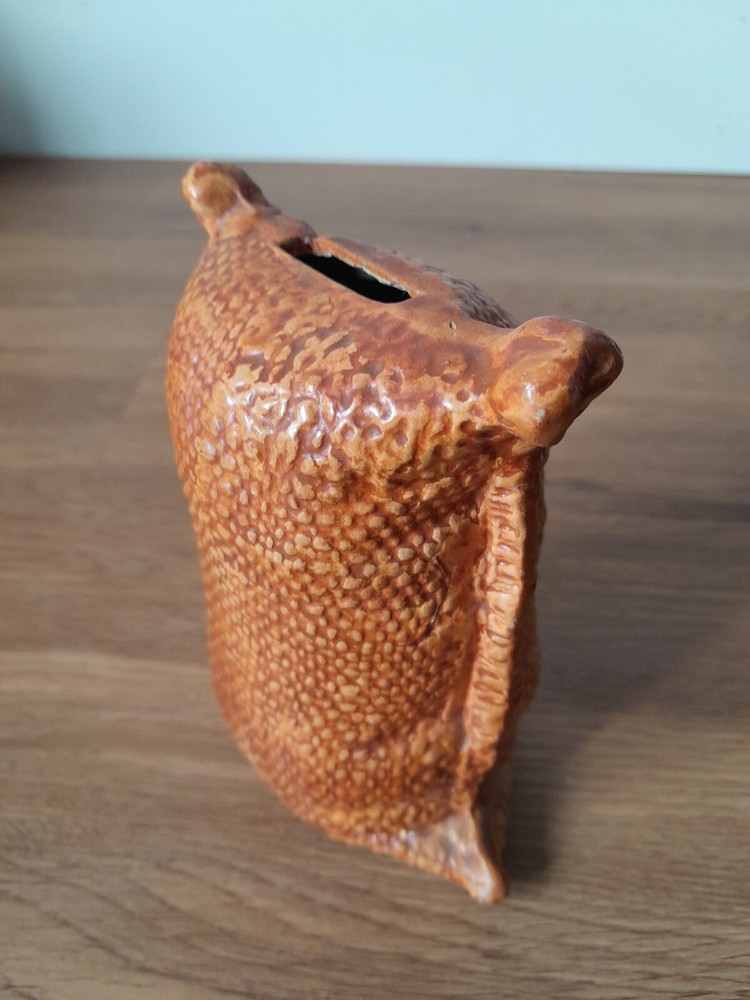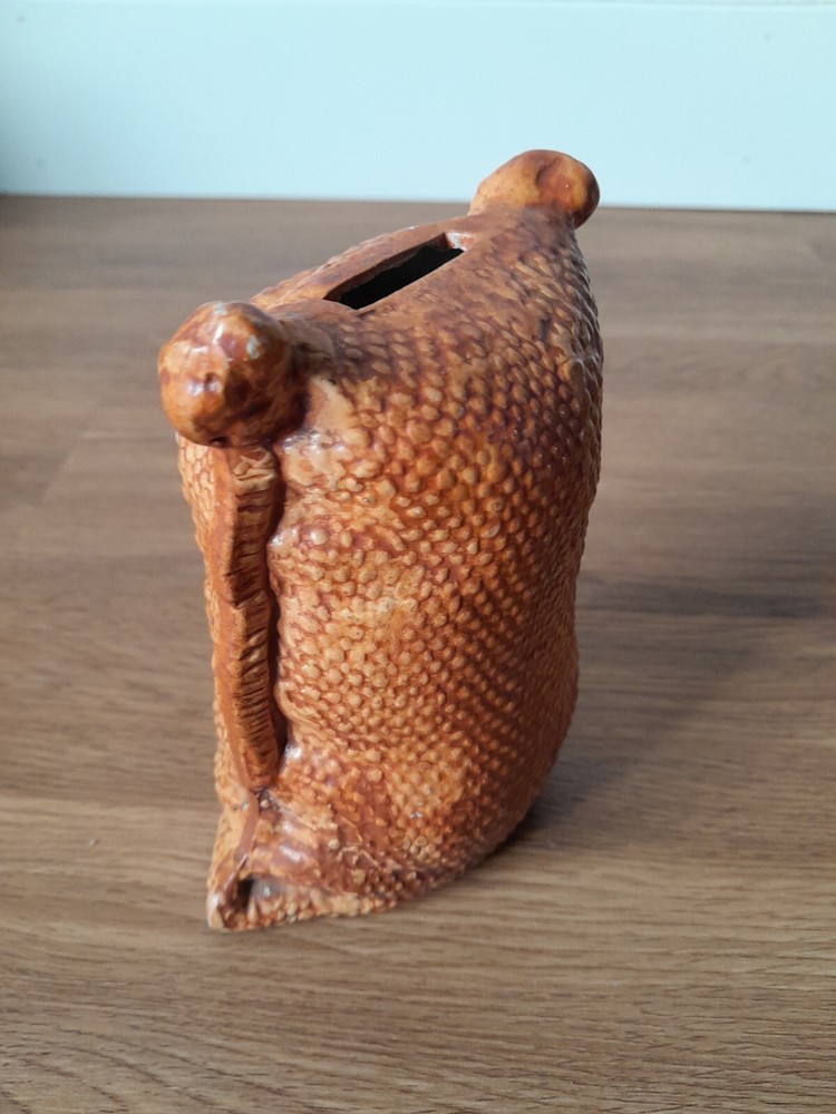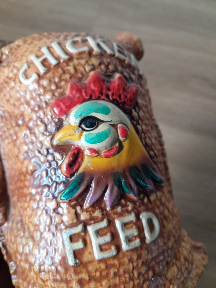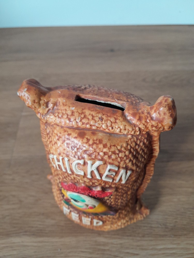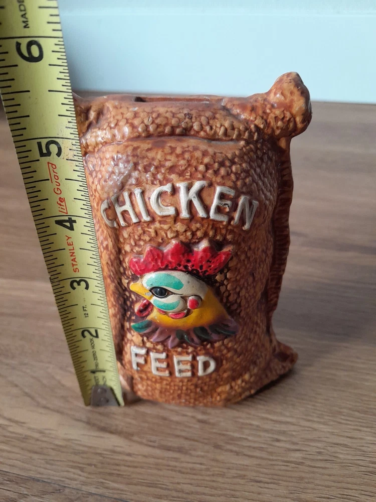 This vintage ceramic bank is a charming addition to any collection. With a kitschy rooster head and the word "Chicken Feed" written in bold letters, it's sure to catch the eye of anyone who sees it. Made of durable ceramic material, this bank is built to last and will make a great addition to your decorative still banks collection. The origin and country of manufacture are unknown, adding to the mystery and allure of this piece. Whether you're a collector or just looking for a unique storage solution, this bank is sure to delight. Missing stopper