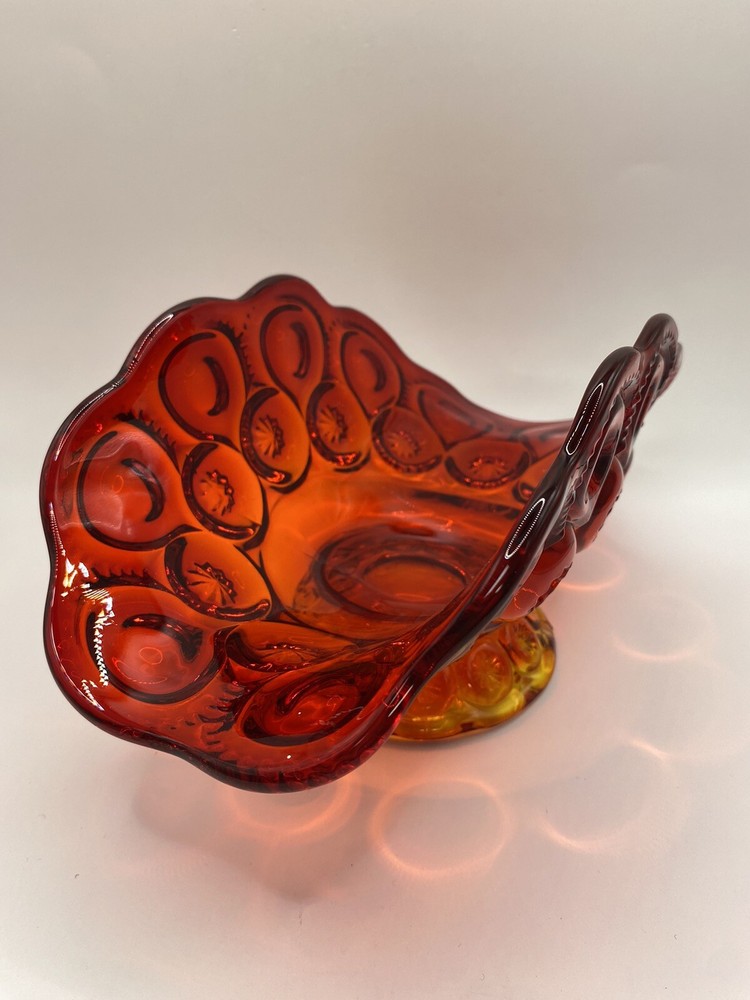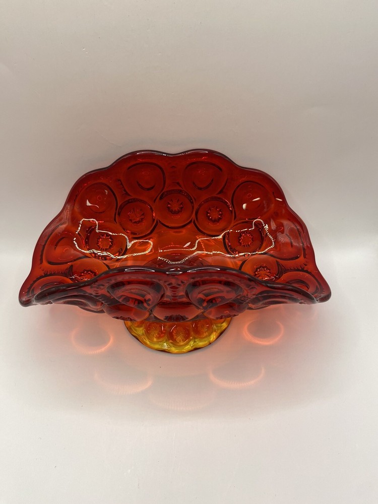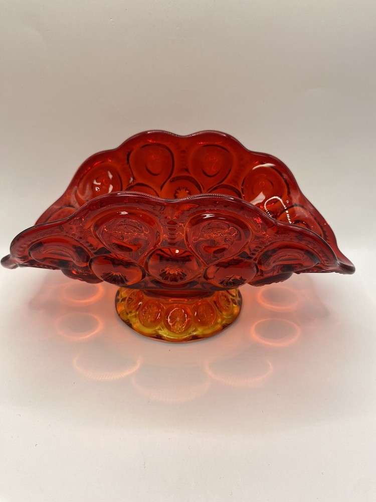 This is a vintage LE Smith Moon and Stars banana boat glass ruffle vase compote in a red color. The oval-shaped item is made of glossy glass with a moon and stars pattern and measures 9 inches in length, 41/2 inches in height, and 5 inches in width. It features a unique design and is a collectible piece from the brand LE Smith. The item is relatively lightweight, weighing 1 pound and 11.1 ounces.