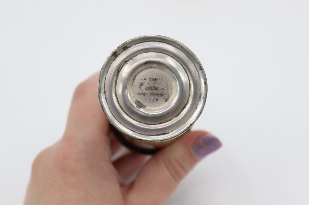 Vintage La Pierre sterling silver salt and pepper shakers. They are weighted reinforced and are labelled #25A. The shakers have screw on caps. They were made between 1900-1940. Great for collectors, decoration or for use! In good vintage condition. Shows signs of wear from age and use, such as discoloration, fading, scratches and other signs of wear. They measure 5" tall. Message me with any questions!
