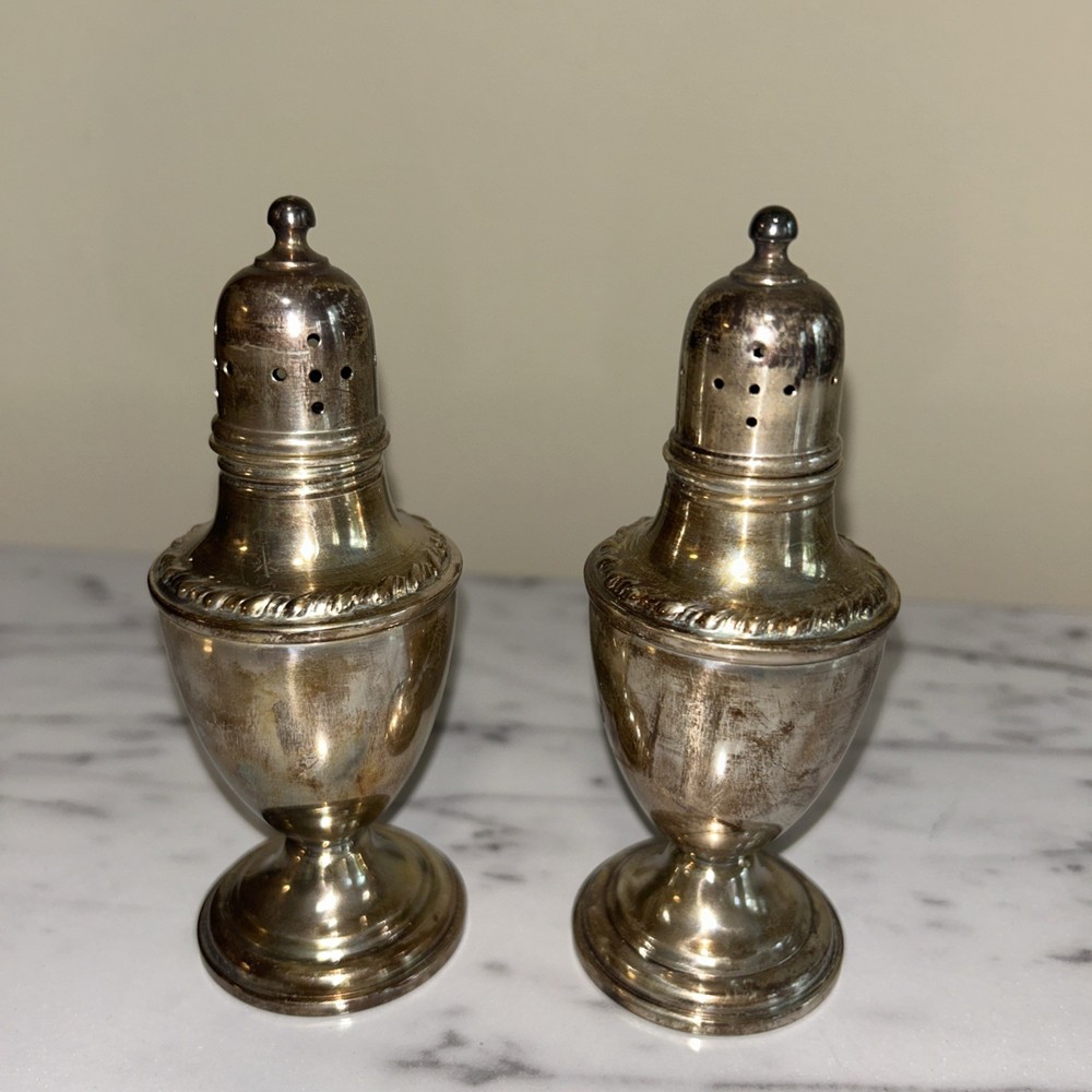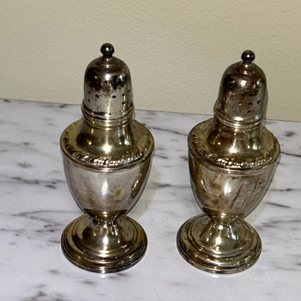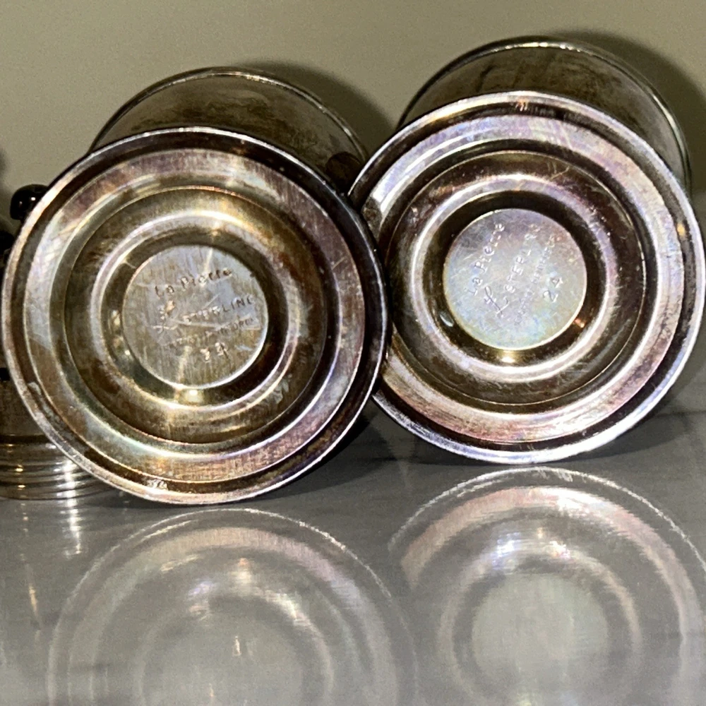 The Vintage La Pierre Sterling Silver Salt and Pepper Shakers are a set of two Victorian-style shakers made from high-quality sterling silver. The shakers are designed to be weighted and reinforced, ensuring durability and stability on the table. With the elegant Le Pierre brand and intricately crafted composition, these shakers are both functional and decorative, making them a charming addition to any dining room or kitchen. Ideal for collectors of silver antiques or those looking to add a touch of vintage charm to their home. Unpolished Patina with very gentle tarnish and perfect structural integrity. Approximately 4 1/2” x 1 3/4”