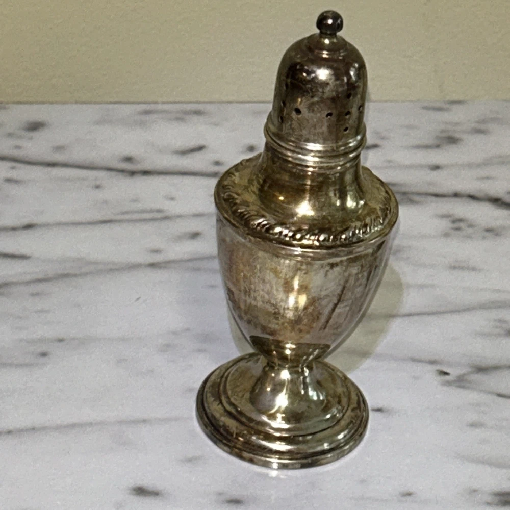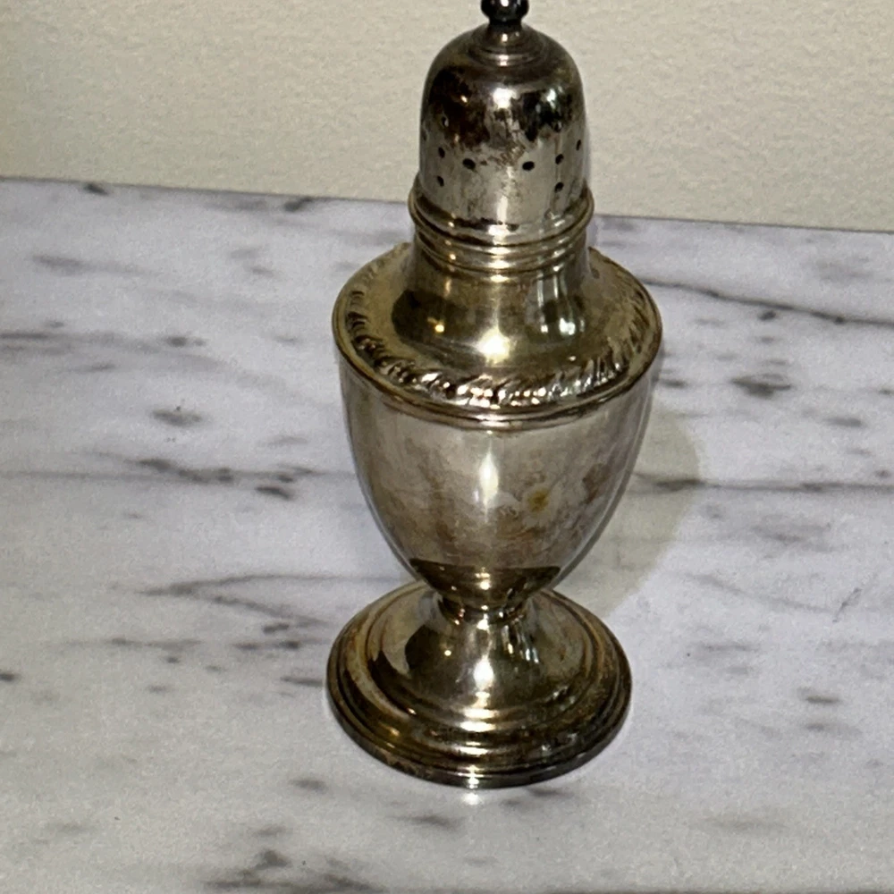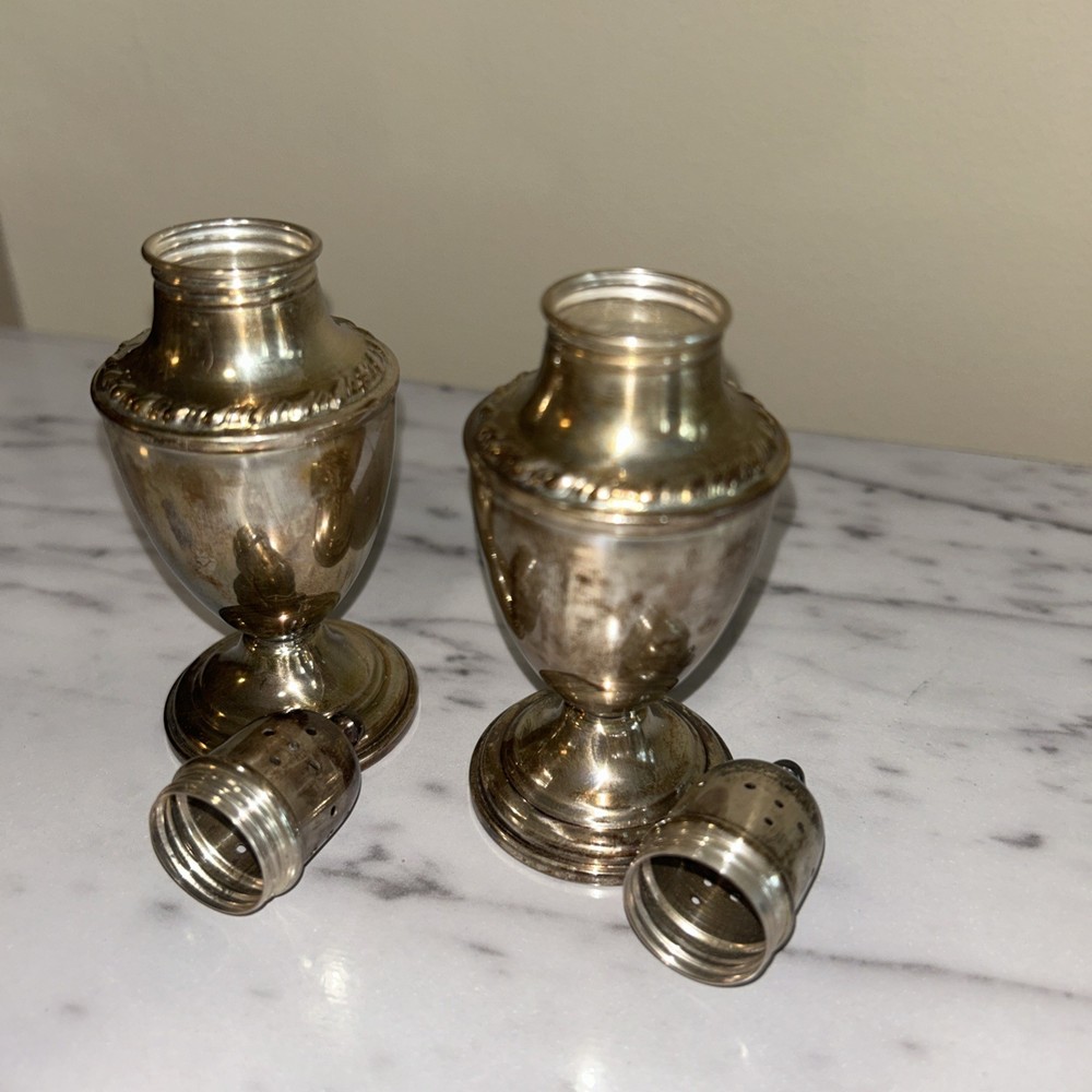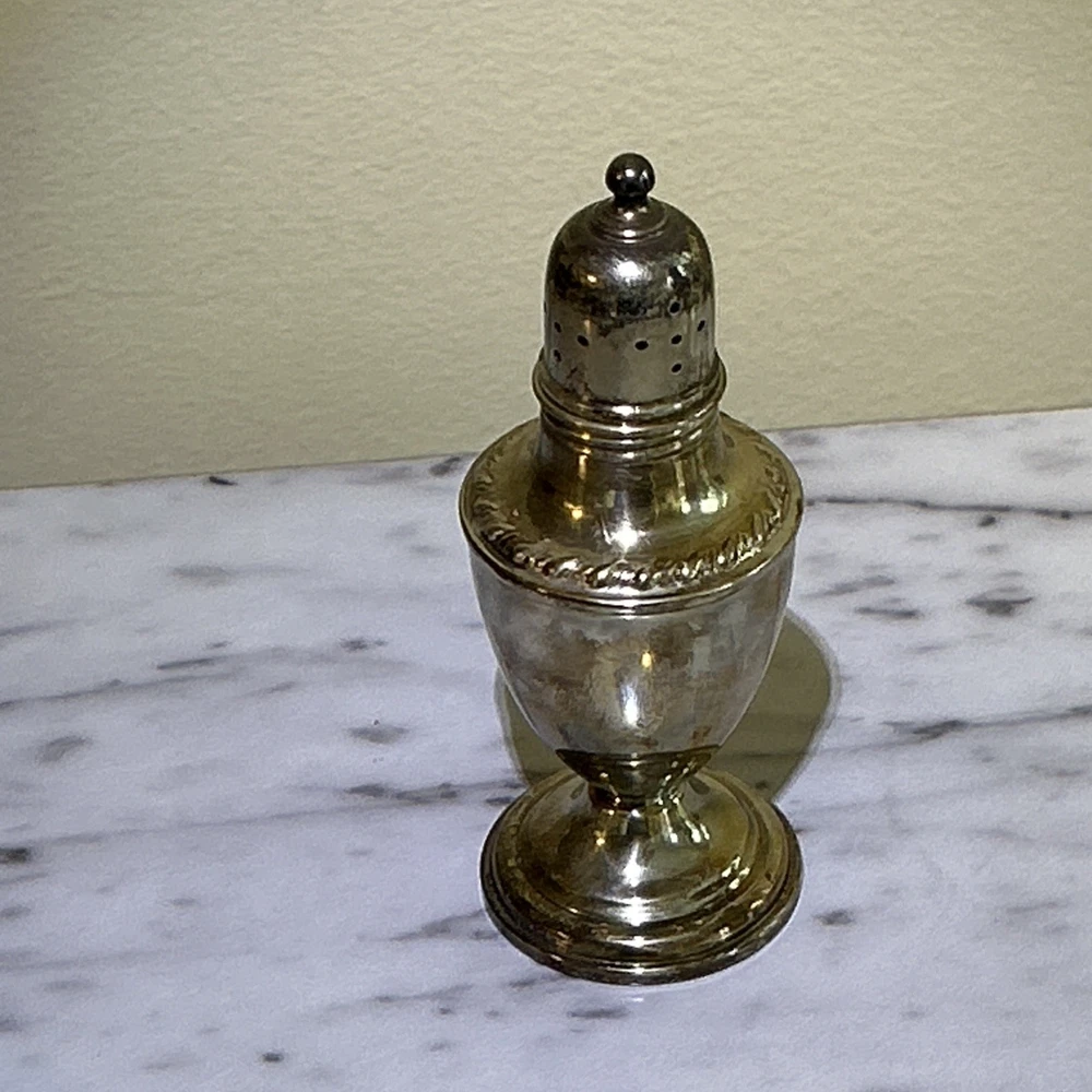 The Vintage La Pierre Sterling Silver Salt and Pepper Shakers are a set of two Victorian-style shakers made from high-quality sterling silver. The shakers are designed to be weighted and reinforced, ensuring durability and stability on the table. With the elegant Le Pierre brand and intricately crafted composition, these shakers are both functional and decorative, making them a charming addition to any dining room or kitchen. Ideal for collectors of silver antiques or those looking to add a touch of vintage charm to their home. Unpolished Patina with very gentle tarnish and perfect structural integrity. Approximately 4 1/2” x 1 3/4”