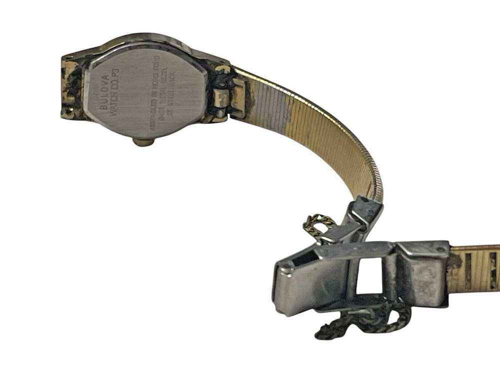 This vintage Bulova Quartz wristwatch is a timeless piece for any collection. With a gold plated case and fold over clasp, this watch is both elegant and practical. The geometric dial with self-winding movement makes it a versatile addition to any outfit. The watch is 5.76-6 in (146.3-152.4 mm) in size and has a 6.35mm band width. It features a solid caseback and base metal bezel type. The watch is designed for women and has a classic, dress/formal, and casual style. It is a Bulova Quartz model with reference numbers COP3 and COP4. This watch is a vintage piece from Japan and does not come with service records, manual/booklet, or seller warranty. needs repair good for parts
