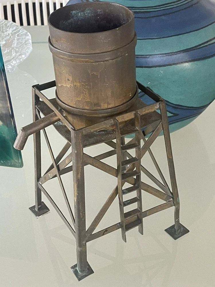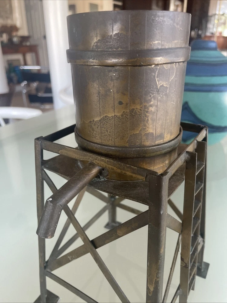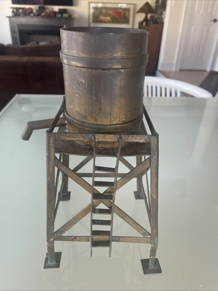 This vintage large scale metal toy railroad water tower is a must-have for any collector of railroadiana and trains. Measuring at 11" x 7", it is a unique piece that is sure to catch the eye of any enthusiast. Made in the United States, this water tower is a great addition to any collection. Excellent vintage condition! Its intricate details and vintage charm make it a rare find, perfect for those who appreciate the history and nostalgia of railroad toys. Add it to your collection today and enjoy the beauty and craftsmanship of a bygone era.