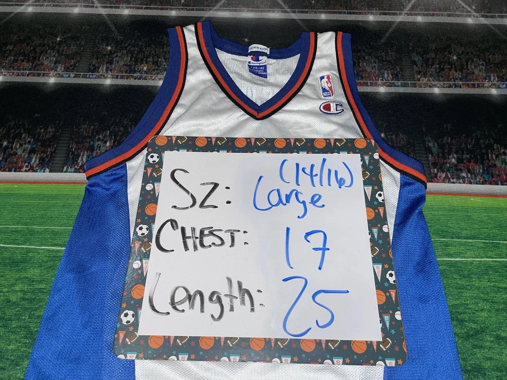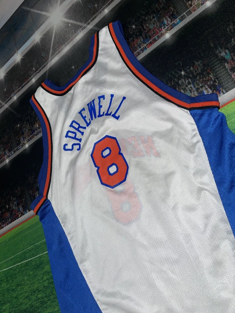 This vintage Champion jersey features Latrell Sprewell's number 8 for the New York Knicks in white. The jersey is officially licensed by the National Basketball Association (NBA) and is perfect for any basketball fan. It is made for boys in size large and is ideal for regular season games. The jersey is a great addition to any sports memorabilia collection and is perfect for wearing to games or displaying in a fan cave. Note: lite spot