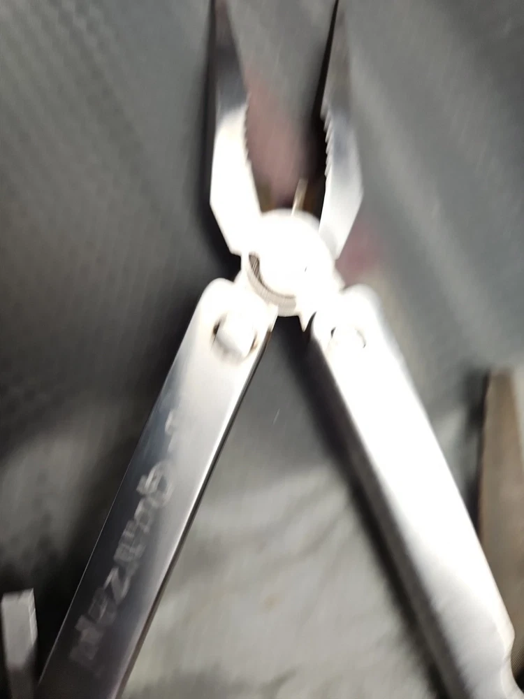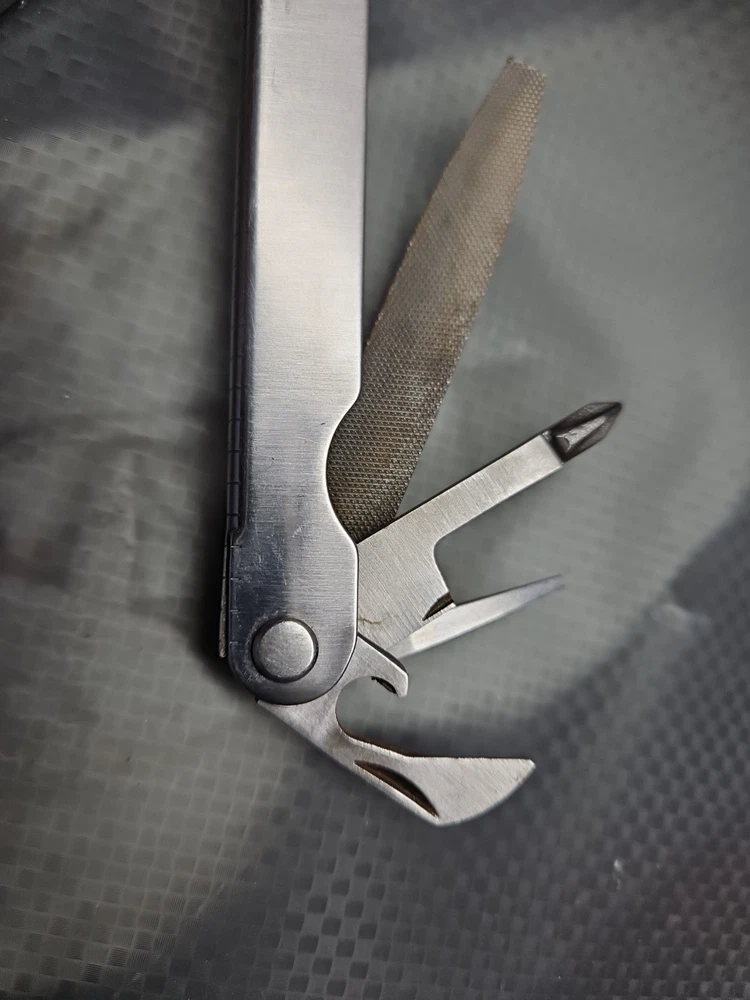 The Vintage Original Leatherman TM 1325473 Multi Tool is a versatile tool with a stainless steel construction and corrosion-resistant features. It includes 10 tools such as pliers, knives, wire cutters, rulers, screwdrivers, and more, all neatly packed in a 4-inch closed length design. The blade is straight edge and 3 inches long, making it ideal for various tasks in camping, hiking, and other outdoor activities. There are owners marks on tool. See photos.