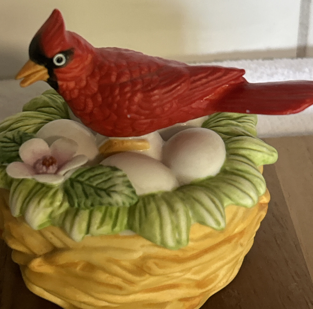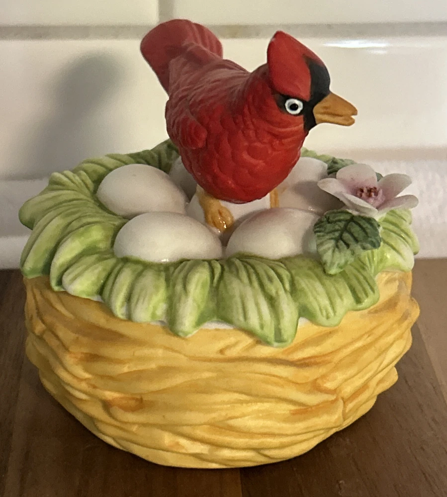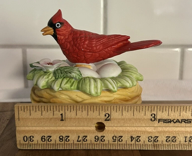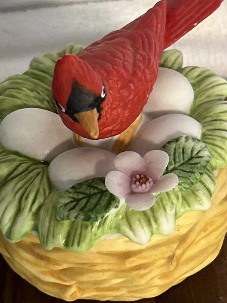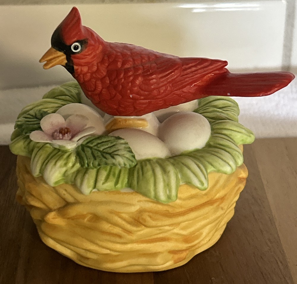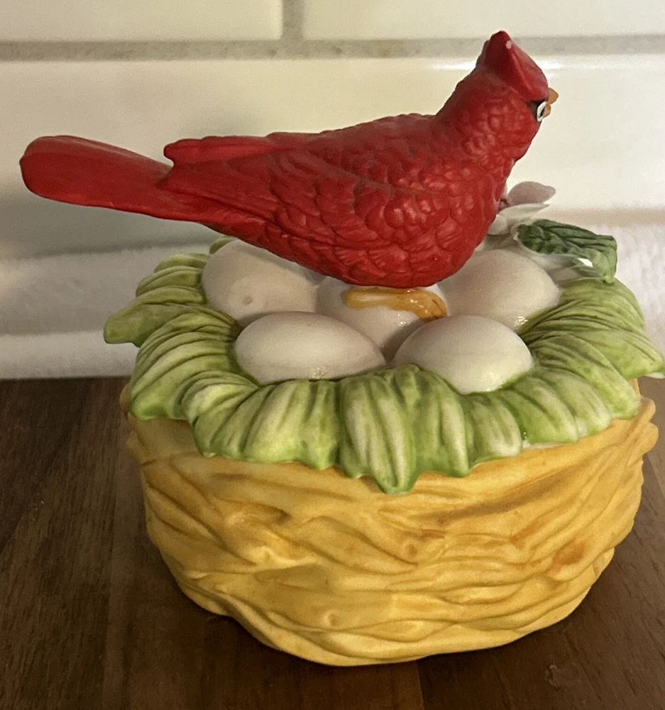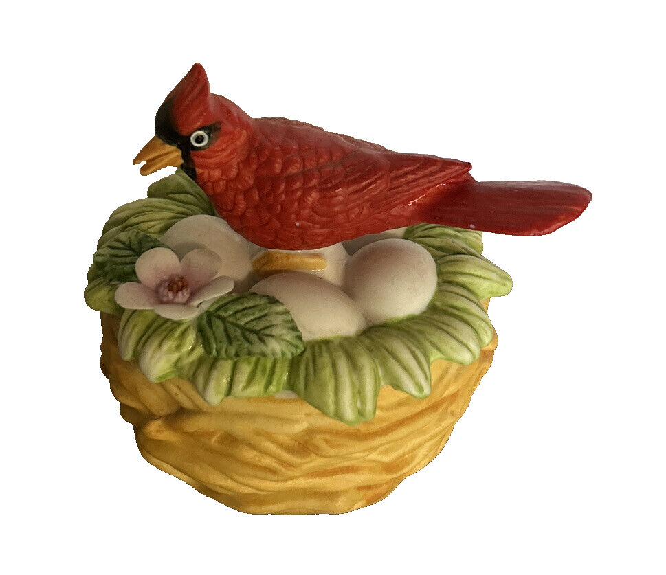 This vintage Lefton porcelain trinket box features a red cardinal bird nesting on eggs, surrounded by a beautiful and colorful design. Made in Japan in the 1970's, this small round trinket box is perfect for storing earrings, rings or any other small items. This sweet trinket box measures 3" inches tall and 2.5" inches in length. The hand-painted 3D effect and matte finish make it a unique and original addition to any vintage collection of either trinket boxes or porcelain birds. This will make a wonderful anytime gift for anyone who loves vintage items. Vintage Cardinal Bird on Nest Round Porcelain Trinket Box ~ Lefton (c) 1970's is in great vintage preowned condition, however it does show some tiny paint loss in a couple of places. However, there are NO chips, cracks or repairs. Please review all pictures for proper assessment of its vintage preowned condition.