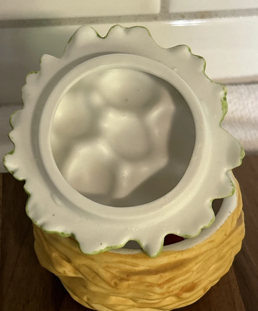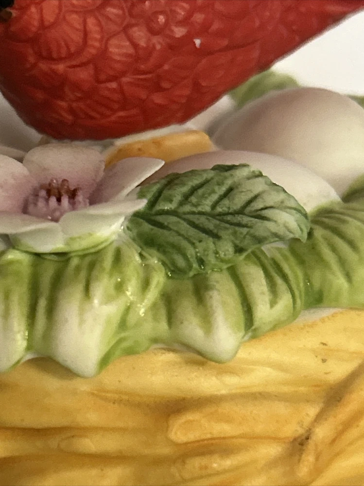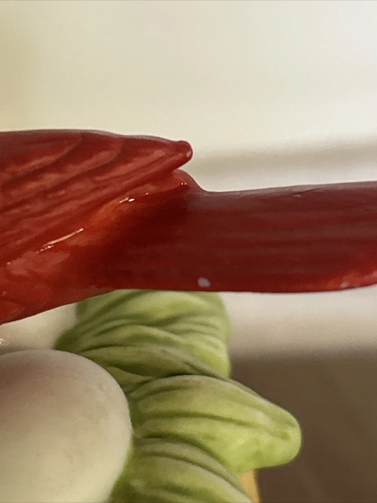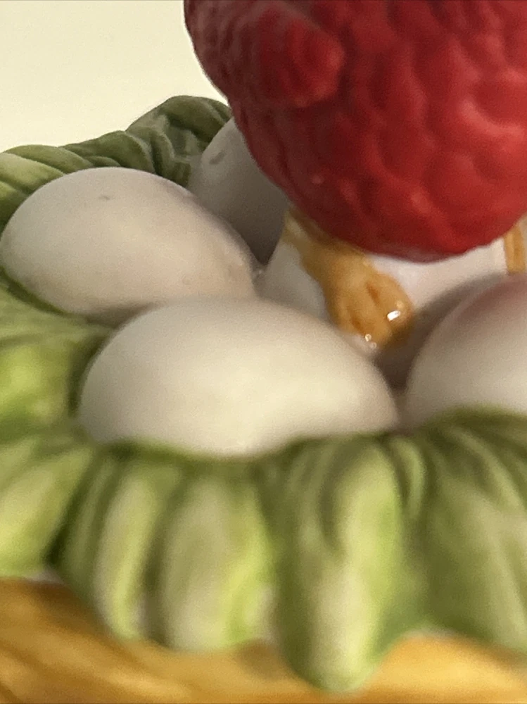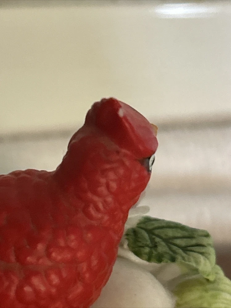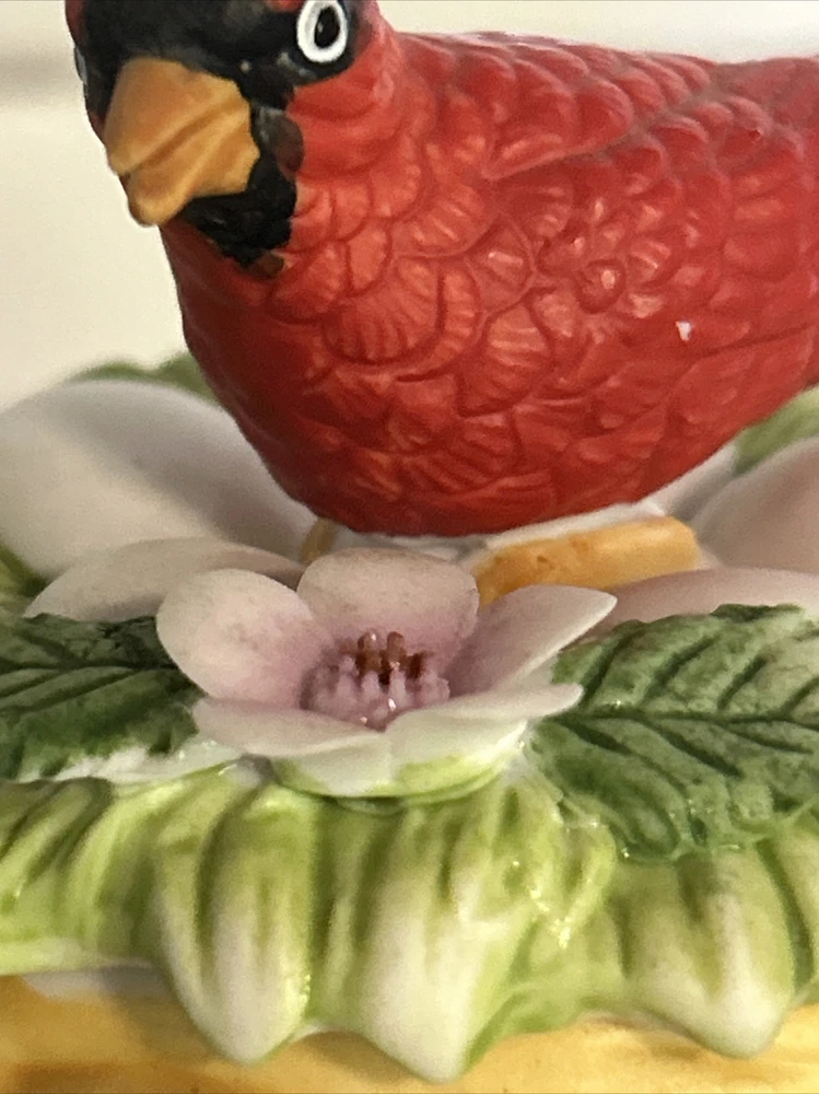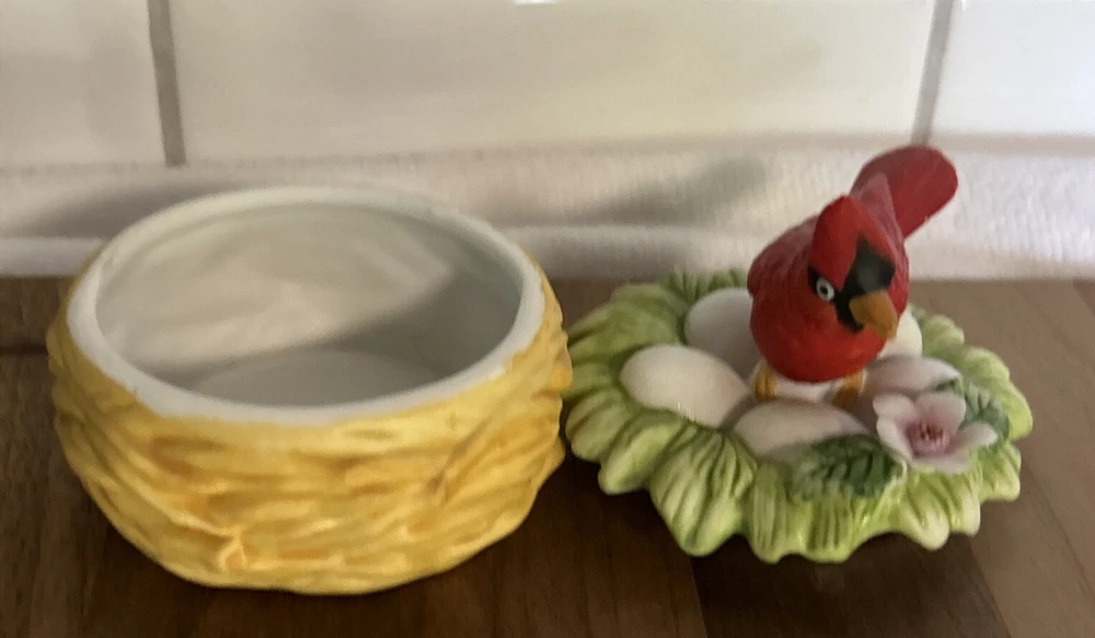 This vintage Lefton porcelain trinket box features a red cardinal bird nesting on eggs, surrounded by a beautiful and colorful design. Made in Japan in the 1970's, this small round trinket box is perfect for storing earrings, rings or any other small items. This sweet trinket box measures 3" inches tall and 2.5" inches in length. The hand-painted 3D effect and matte finish make it a unique and original addition to any vintage collection of either trinket boxes or porcelain birds. This will make a wonderful anytime gift for anyone who loves vintage items. Vintage Cardinal Bird on Nest Round Porcelain Trinket Box ~ Lefton (c) 1970's is in great vintage preowned condition, however it does show some tiny paint loss in a couple of places. However, there are NO chips, cracks or repairs. Please review all pictures for proper assessment of its vintage preowned condition.