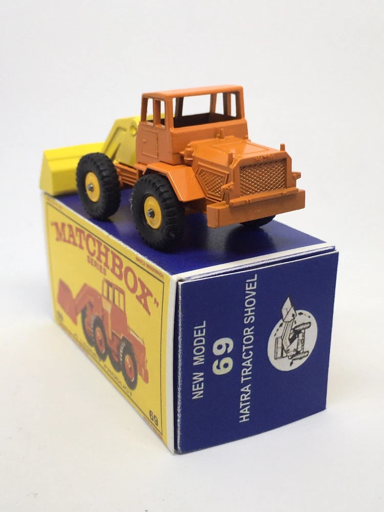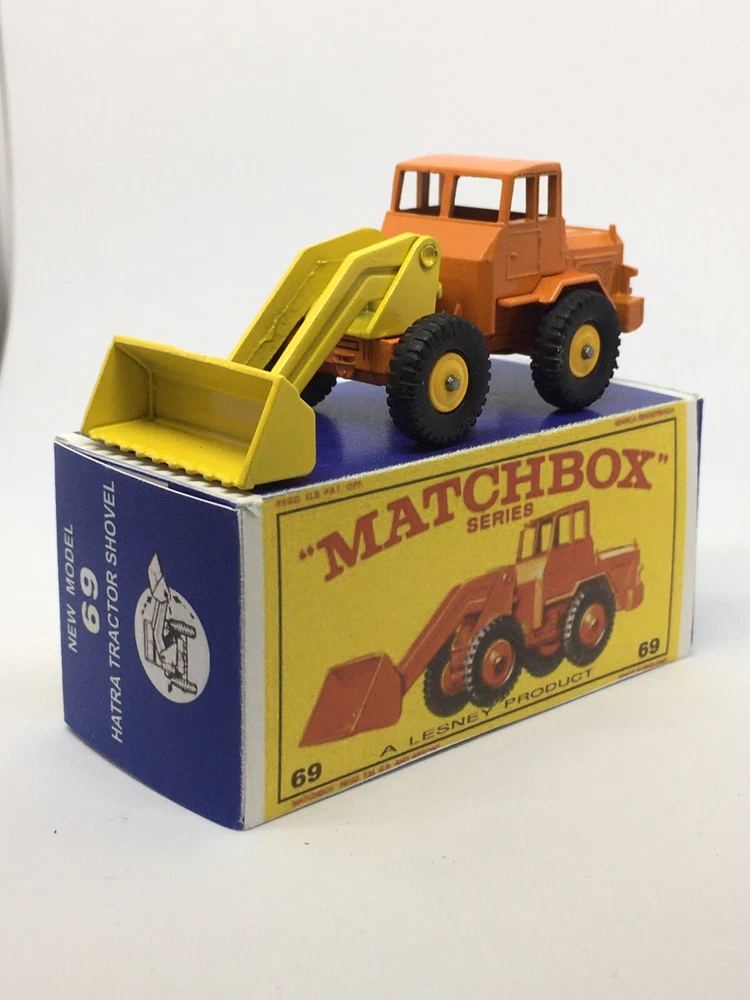 Vintage Lesney Matchbox 69 Hatra Shovel. Rare two colors Transitional. RESTORED, NOT ORIGINAL. Fixed shovel. I restored the vehicle to a high standard with a new displayable storage box. These models and packaging are not original. Please look at the pictures carefully as they are part of the description. Please ask questions before bidding. I combine shipping with multiple orders. These are custom models so I do not except returns. This is a hobby and the vehicle was a used played with toy now restored.