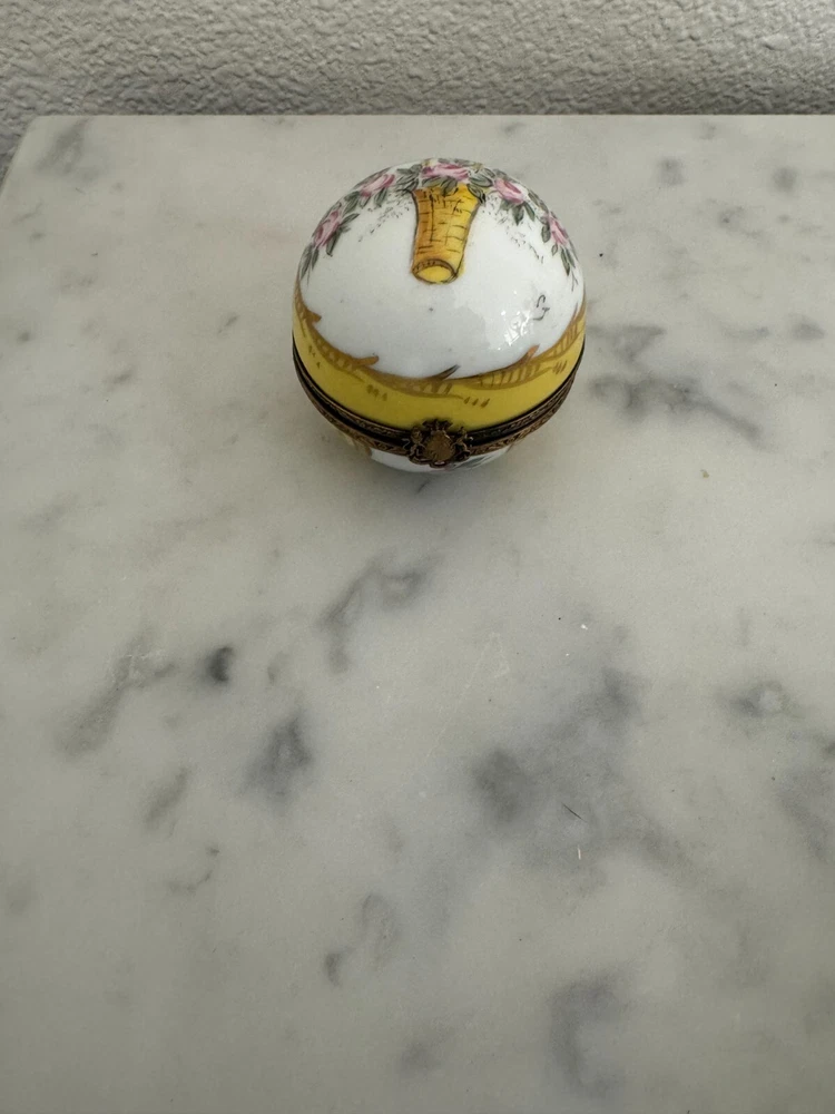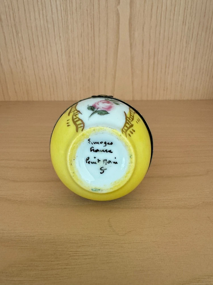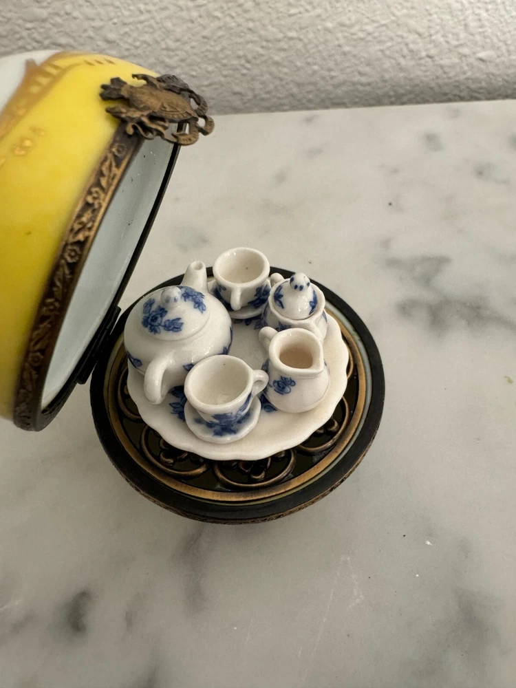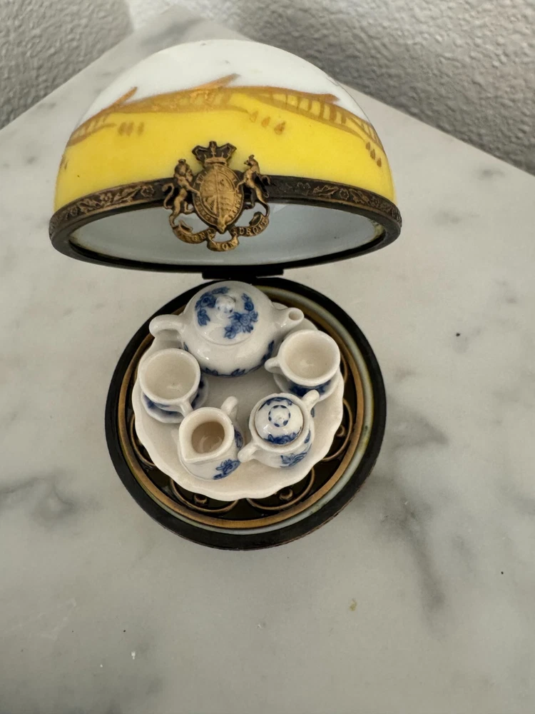 Vintage Limoges Porcelain Trinket Box with Miniature Tea Set - Hand painted with Gold detailing and Pink Roses - Signed Peint Main Limoges France Features: Hand painted with yellow and gold detailing and pink roses A basket with bow and pink roses is on top and a pink rose on front Miniature tea set inside painted with blue and white design Signed "Peint Main Limoges France" Round shape Excellent vintage condition Dimensions: Approximate 2.5" x 2.5" A true collectors item! Hand painted with elegant gold detailing and, a beautifully crafted basket with a delicate bow and pink roses, making it a standout piece. The brass closure is a crest featuring a crown, lion, and what looks to be a griffin. Inside, a miniature tea set, beautifully showcased in this small treasure. The box is signed "Peint Main Limoges France," indicating its authenticity. Perfect for collectors, this charming piece would make a wonderful addition to any collection or a lovely gift for someone special.