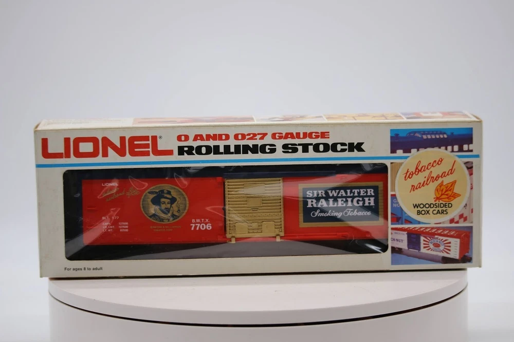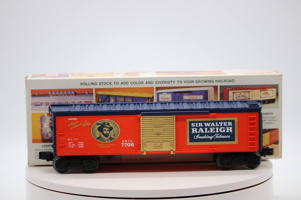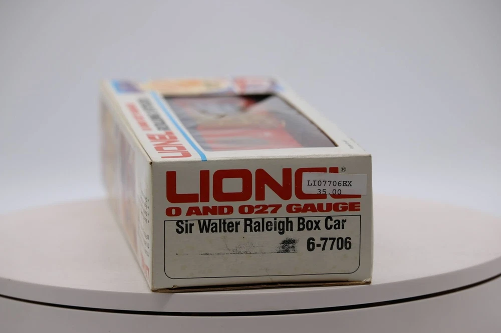 Vintage Lionel 6-7706 Sir Walter Raleigh Box Car Look closely at the pictures to see further details. We ships USPS PLEASE see photos for detailed condition!! . PLEASE LOOK AT THE PHOTOS CAREFULLY BEFORE PURCHASING!! If you are purchasing more than one item from us and would like combined shipping, PLEASE request an adjusted invoice from us while still in the cart and BEFORE paying. Ebay does not usually calculate combined shipping accurately and you might get overcharged. Please be aware that when we photograph items, we use lighting that will show the details well. Although we try to present the product as accurately as possible, the lighting may affect the overall look of the item by appearing lighter/darker or possibly a different hue than the actual item. Depending on the type of lighting you have in your home, there may be some differences between the photos and the actual item. If this is a concern of yours, please feel free to request additional photos made in natural lighting or ask for a more detailed description of the item PRIOR TO PURCHASE! PLEASE NOTE: We greatly appreciate your interest in our item for sale. We look forward to a pleasant, quick and satisfying transaction for everybody, so please note the following information before bidding. Thank you! ITEM DESCRIPTIONS: * We will try to describe items well and provide plenty of photos. Please review these carefully before bidding or purchasing. * Only the items pictured and described are what you will receive when purchased. * We will occasionally offer an item clearly marked "AS-IS". This means that we are not sure if it works because we are unable to test it for whatever reason. We will offer these at a discounted price then a similar "working" item. It is possible that these items will work fine, but it also is possible that these items are more useful for their parts. Please only bid on or purchase these items if you are well aware of this, as we will only provide refunds of actual item price (no shipping cost refunds) for these items. * If you have any questions that aren't addressed by the descriptions or photos, please feel free to ask before you bid. * There may be pieces that are missing or broken including, but not limited to, couplers, brake wheels, steps, ladders, railings, etc. May need detailed cleaning SHIPPING: * We usually do not offer shipping to international addresses, but ARE WILLING TO TAKE CONSIDERATIONS. * We try to pack items as carefully as possible, but damage may occur during shipping. If you receive an item that was damaged in shipping, please contact us and we will work with you to resolve the problem. * We will combine shipping costs for all items the same buyer purchases from us within 2 days. Please wait to pay for items until you're done shopping with us. Please contact us if you're expecting to buy more items from us, or to have us adjust the shipping costs. * We will usually ship items out within 24 hours of payment being received Sunday through Friday at noon. We will notify the buyer if there will be a delay in shipping for some reason. Please allow additional time for holidays and weekends when the post office is closed. If payment is received after noon (EST) on Friday, the item might not be shipped until the following Monday. * We do try to recycle shipping materials as much as possible. RETURNS: We abide by eBay's Money Back Guarantee. We definitely want our customers to be happy with their purchase! You may return an item within 30 days of receiving it with the following guidelines: * If the item is defective or damaged (unless we clearly marked the listing "AS-IS"), the buyer will receive a full refund after the buyer returns it and it is received by us. Customers who falsely claim their item is defective, damaged, or not as described in order to receive a full refund and free return shipping will be permanently blocked from making future purchases from us. * If the item is as described (including "AS-IS" items) and the buyer decides for any other reason than defective/damaged to return it, only the actual price of the item will be refunded once it has been returned and it is received by us. The buyer will be asked to pay all original and return shipping charges. This includes all reasons other than defective/damaged, including wrong size, wrong type, changed mind, etc. All "AS-IS" items will fall into this category of return. Please make sure the item is what you want before purchasing it. * Please contact us before initiating a refund request. FEEDBACK: We always leave feedback at the end of transaction. We consider the transaction to be over when we receive feedback from the buyer confirming the item arrived satisfactorily. If you are unsatisfied with your purchase please contact us before leaving neutral or negative feedback. WE APPRECIATE POSITIVE FEEDBACK IF YOU ARE SATISFIED WITH YOUR PURCHASE! THANK YOU FOR YOUR INTEREST IN THIS ITEM!
