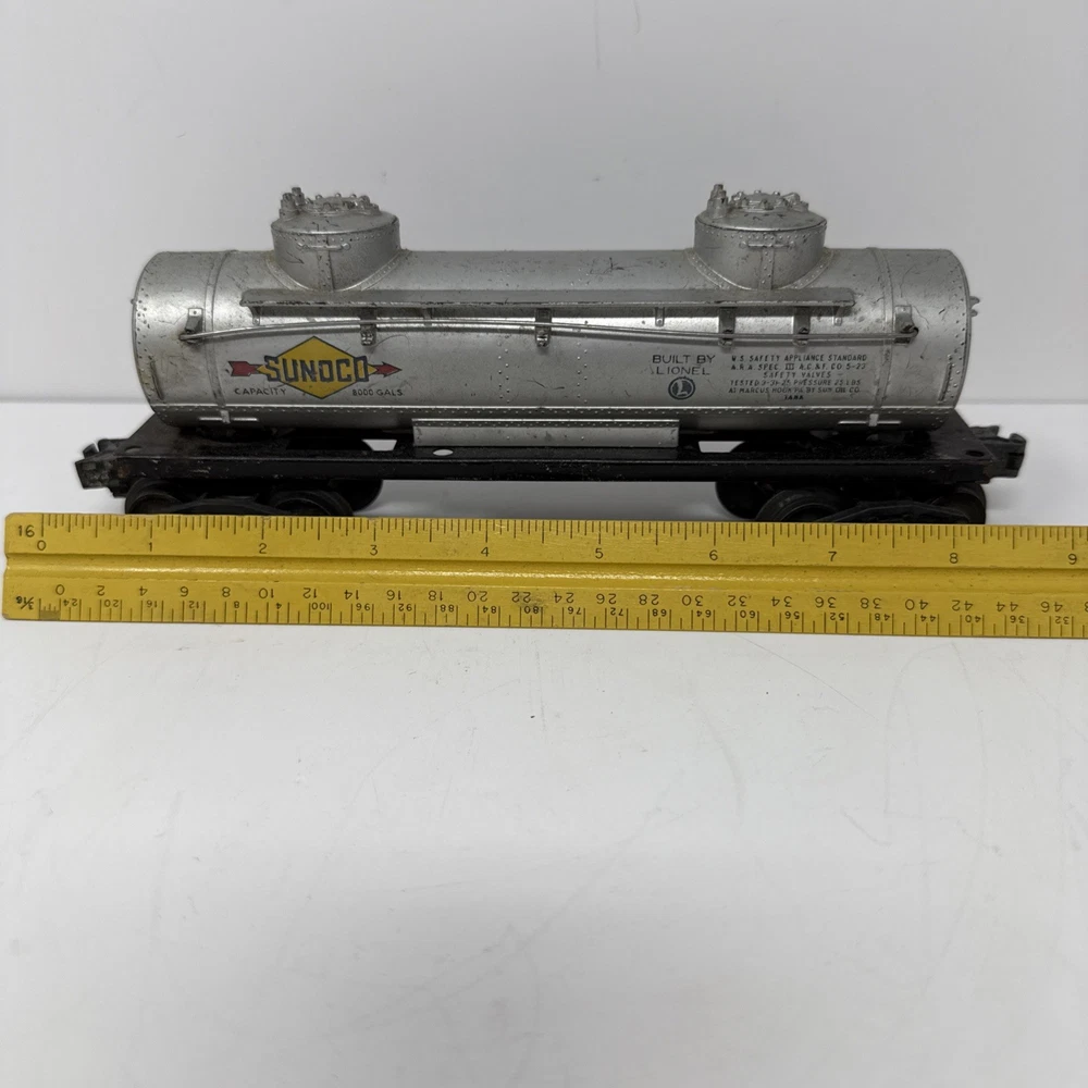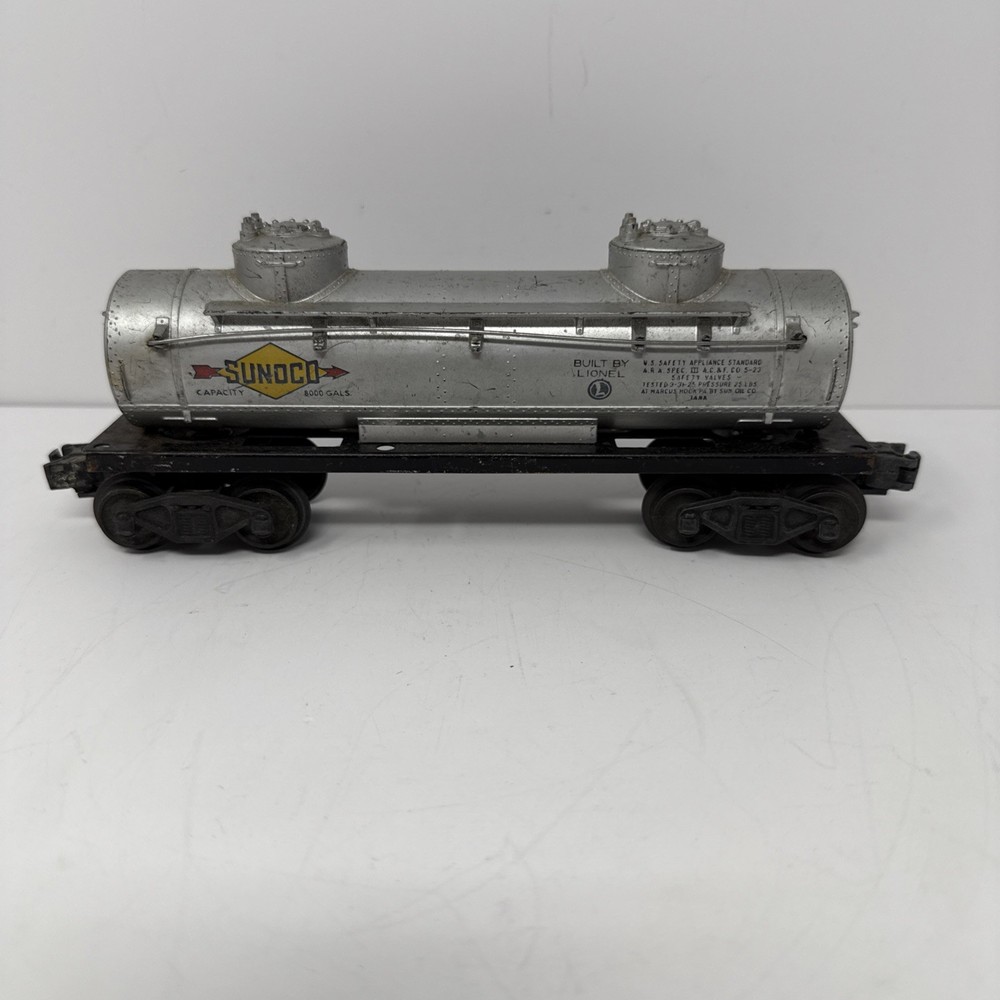 The Lionel Vintage Post-War Trains Sunoco 2 Dome Tank Car in silver color is a classic model train accessory that captures the theme of transportation during the post-war era. Made by the renowned brand Lionel, this Tank Car is designed in 0/027 gauge, making it compatible with standard model railroads. While this vintage piece is missing its original box, it still holds sentimental value for collectors of model train memorabilia. Perfect for enthusiasts looking to enhance their train layout with a piece of history. Please refer to photos for size and condition!