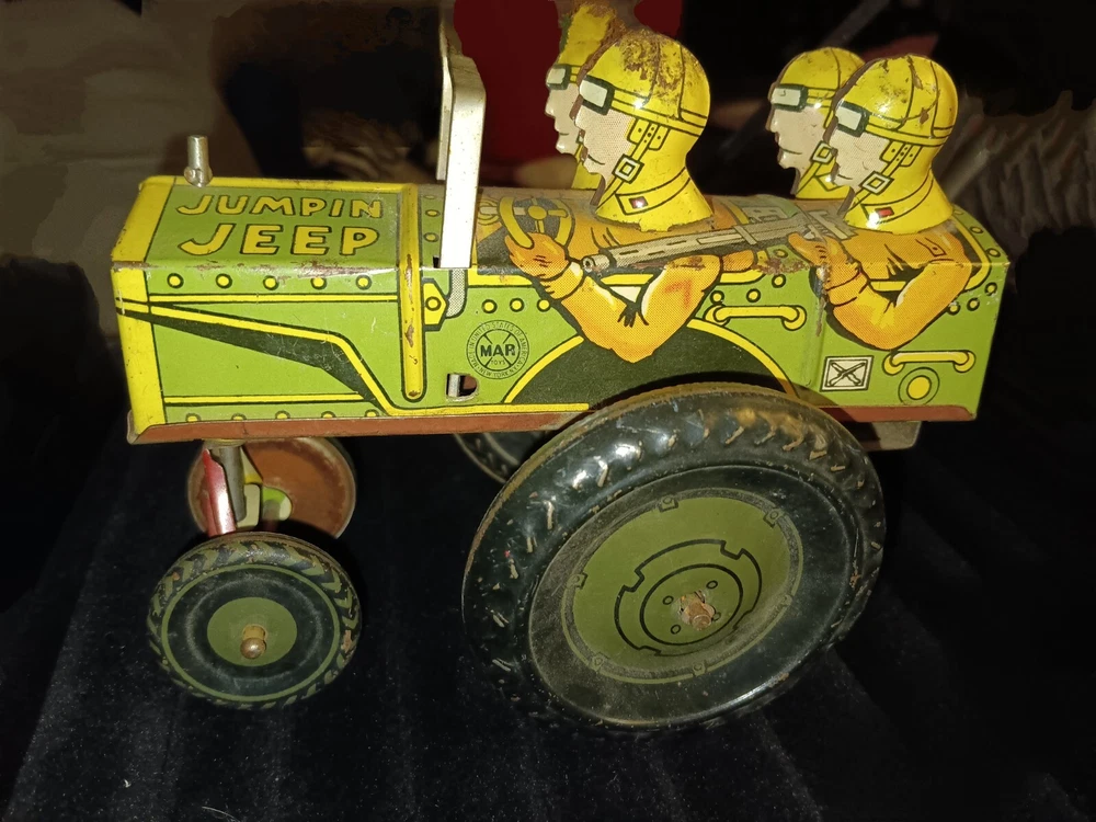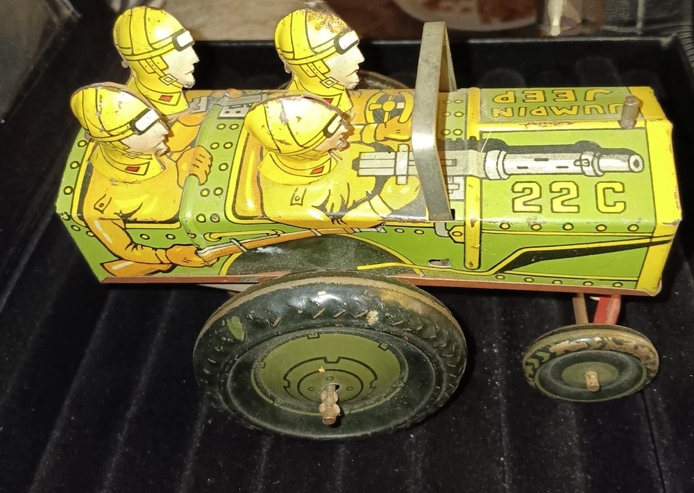 This vintage Louis Marx 1940s Toys Jumping Jeep Wind-up Tin Toy, 575-E Rare is a must-have for collectors and enthusiasts of vintage toys. This rare piece features a Jeep with Army Men character family and is made in the United States. It is a tin wind-up toy that is perfect for those who are 17 years and up, and it comes from a brand that is highly regarded in the world of vintage toys.The featured refinements of this toy include a wind-up mechanism that adds an extra level of charm and nostalgia to the piece. It is perfect for those who love vintage toys and want to add a rare item to their collection. This toy is sure to be a conversation starter and a cherished possession for years to come.