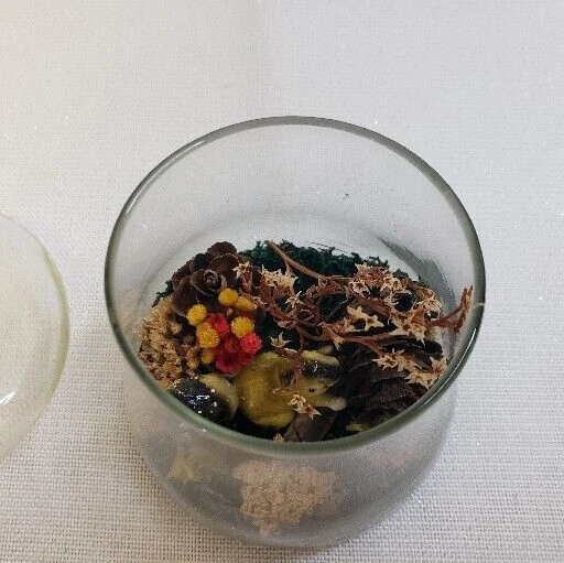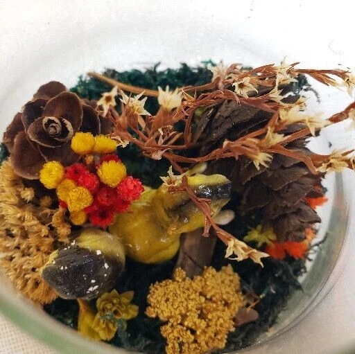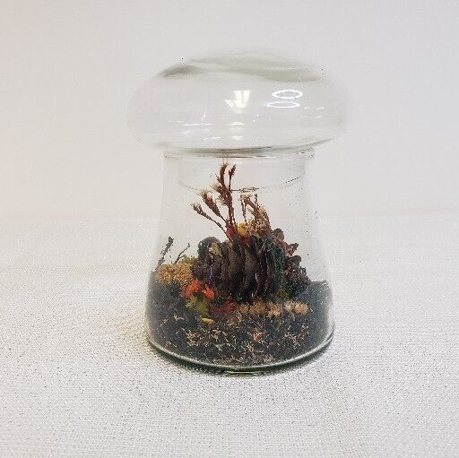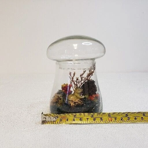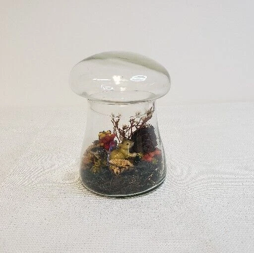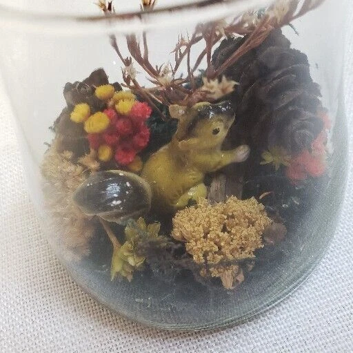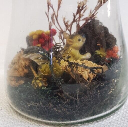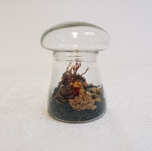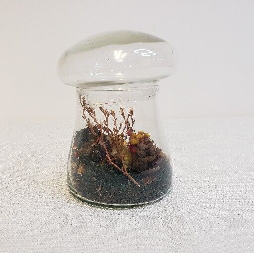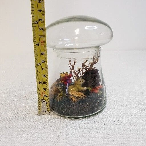 No chips or cracks, beautiful condition. Woodland themed glass mushroom. Please view all photos for condition and measurements. If you have questions or would like more photos, I'm happy to help. Pictures are part of the description. Vintage Glass Mushroom Jar Terrarium Dried Flowers Squirrel Pinecone MCM. Listing and template services provided by inkFrog
