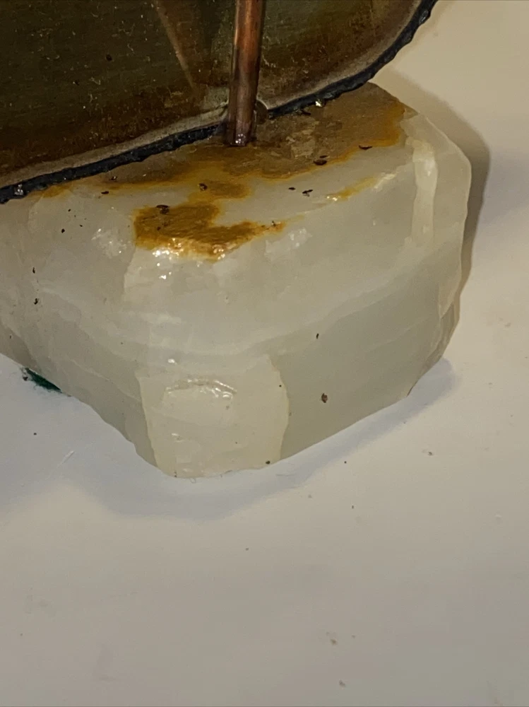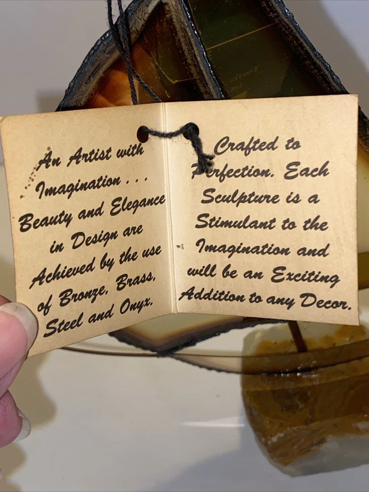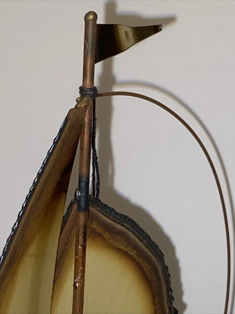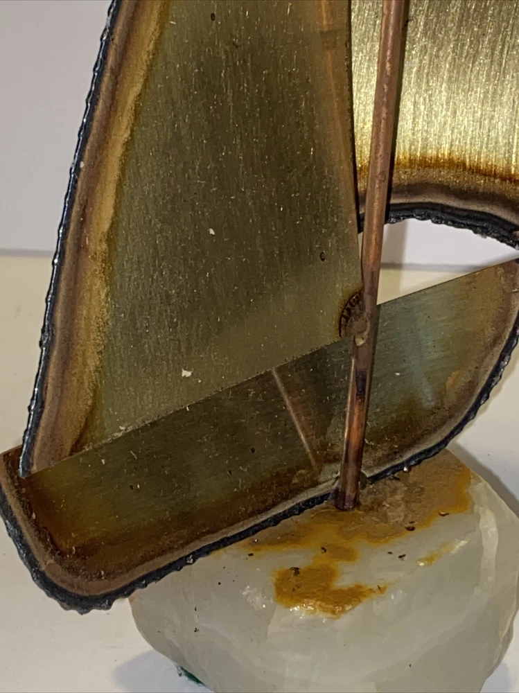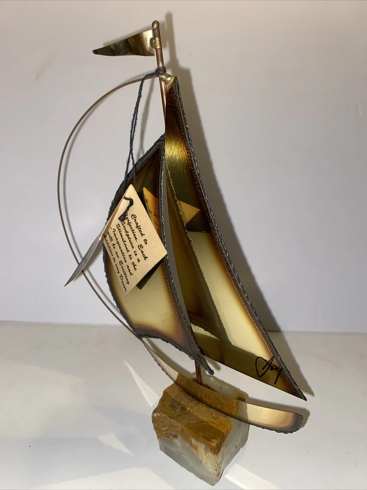 This vintage mid-century modern figurine and statue set features a bronze color metal sculpture of a sailboat, hand-signed by the artist Mario Jason. The piece is an original, created after 1940 and showcases a nautical style that is perfect for any collection or display. The sculpture is made of brass and onyx, adding to its unique and valuable materials.