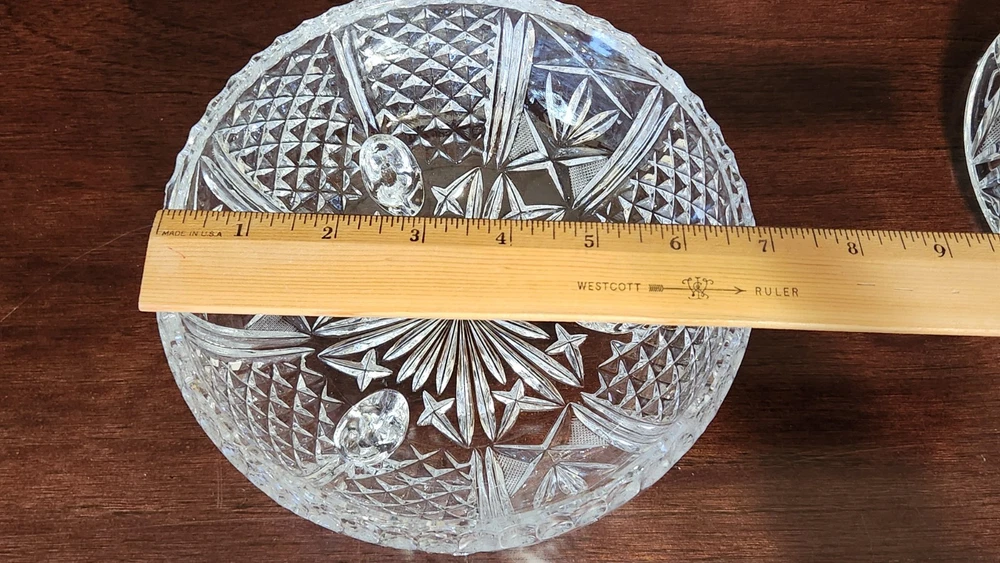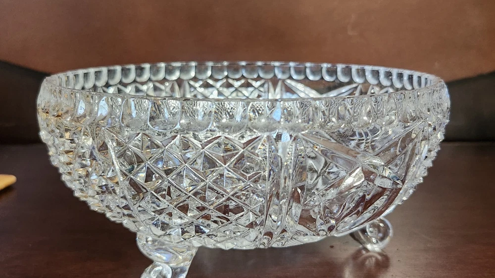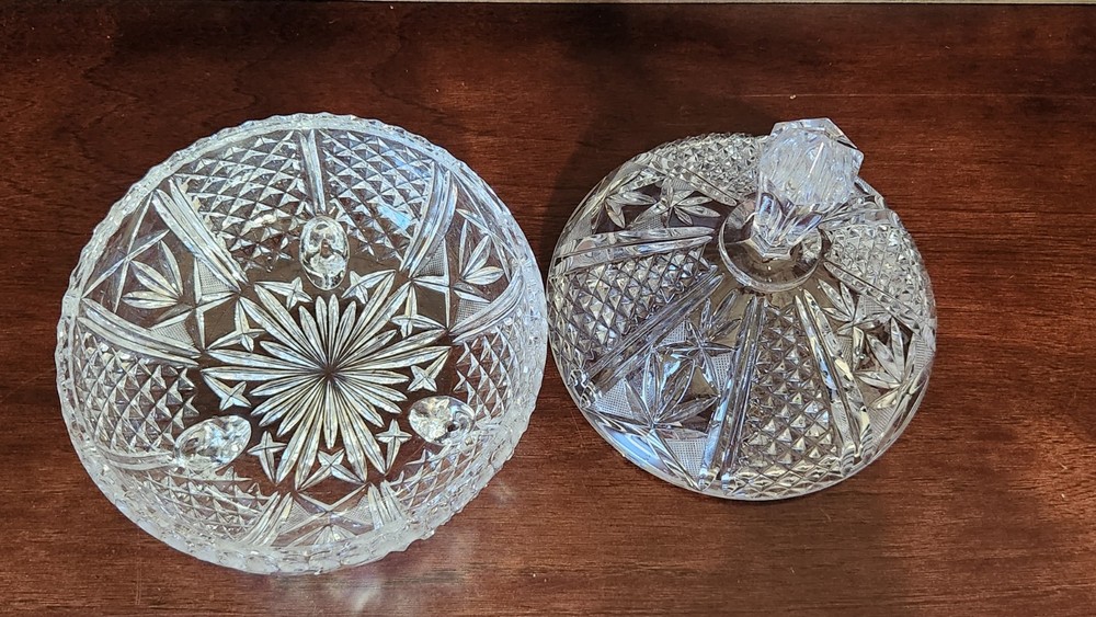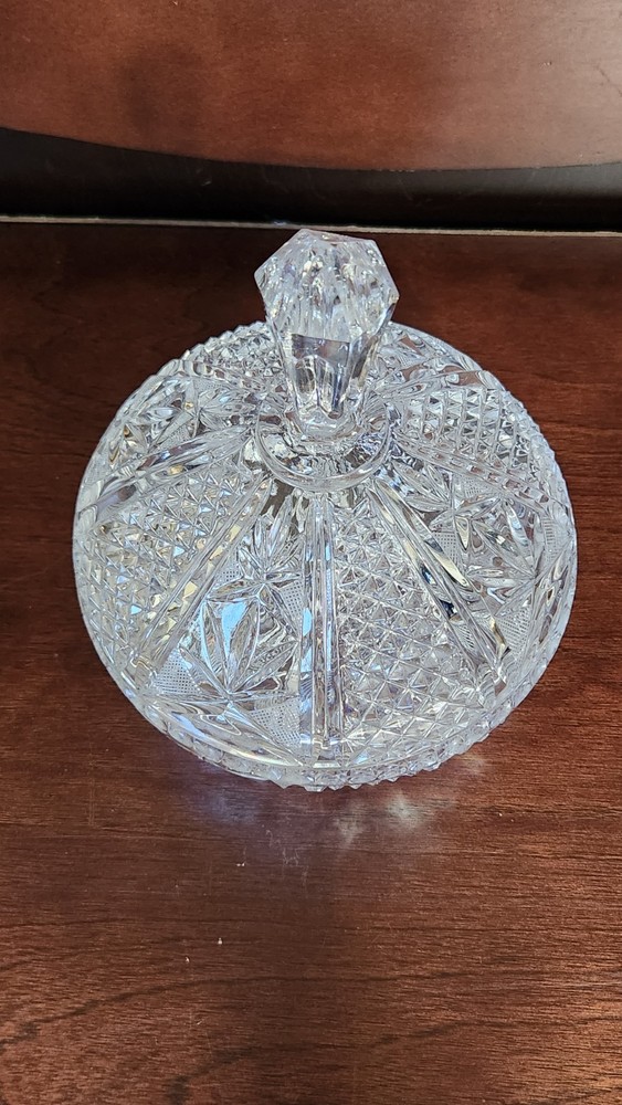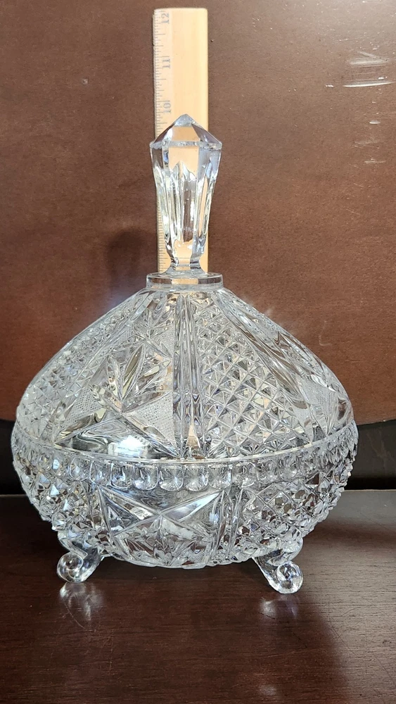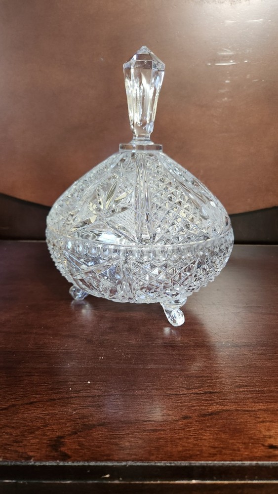 This vintage MCM round cut lead crystal candy dish is a stunning piece that will add a touch of elegance to any home decor. The dish has three feet and a lid, making it perfect for displaying candy or other small treats. The clear crystal material and cut glass production style showcase a beautiful design that is true to the mid-century modern style. The dish is an original piece from the 1960s and is in excellent condition. It has one compartment and is 10 inches in height and 7 inches in width, weighing 4lbs. This unmarked antique dish is a must-have for collectors and those who appreciate unique and timeless pieces.