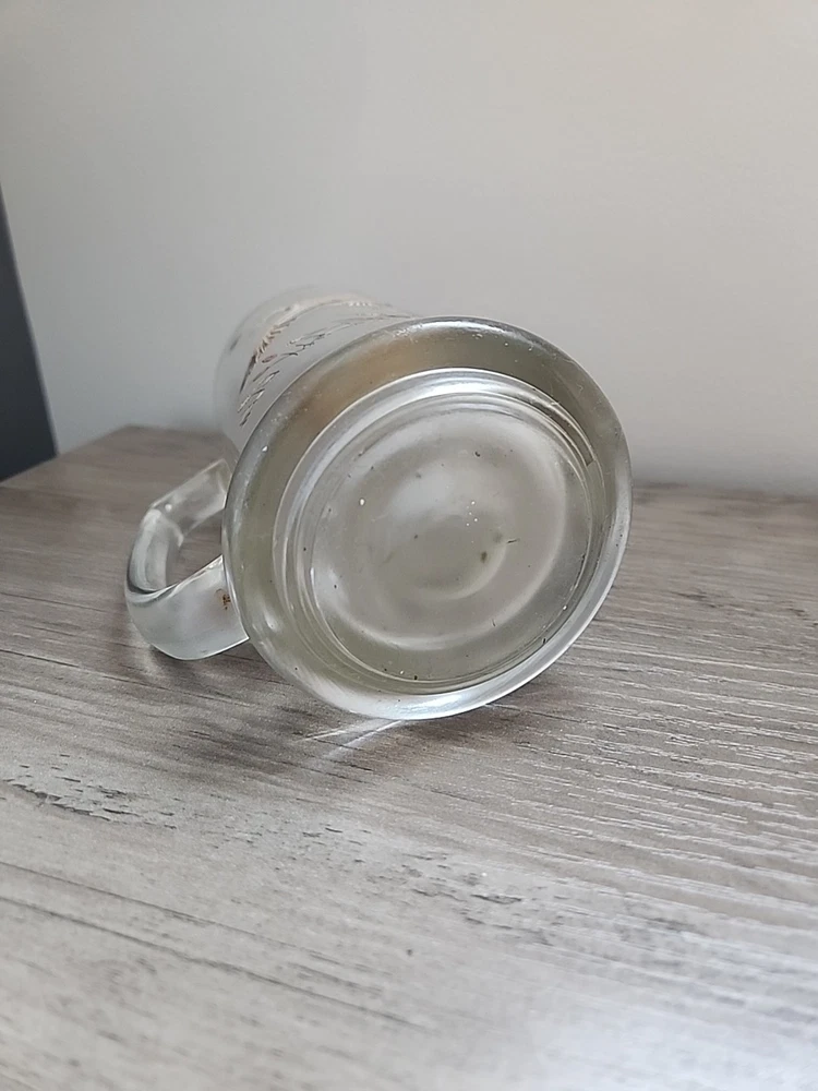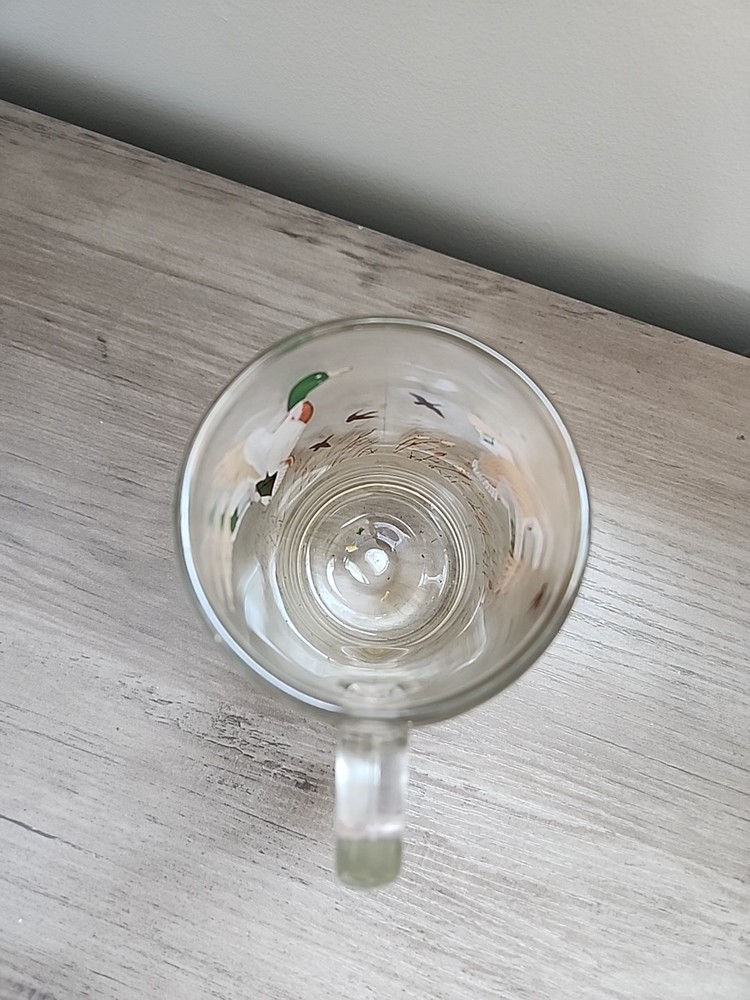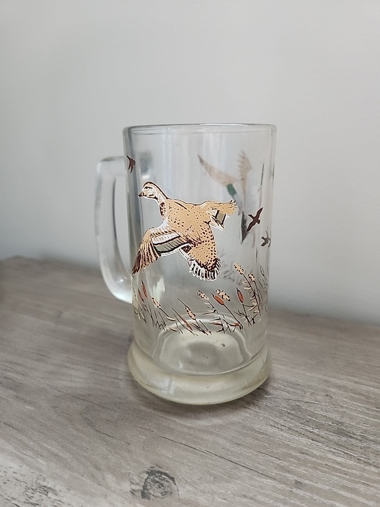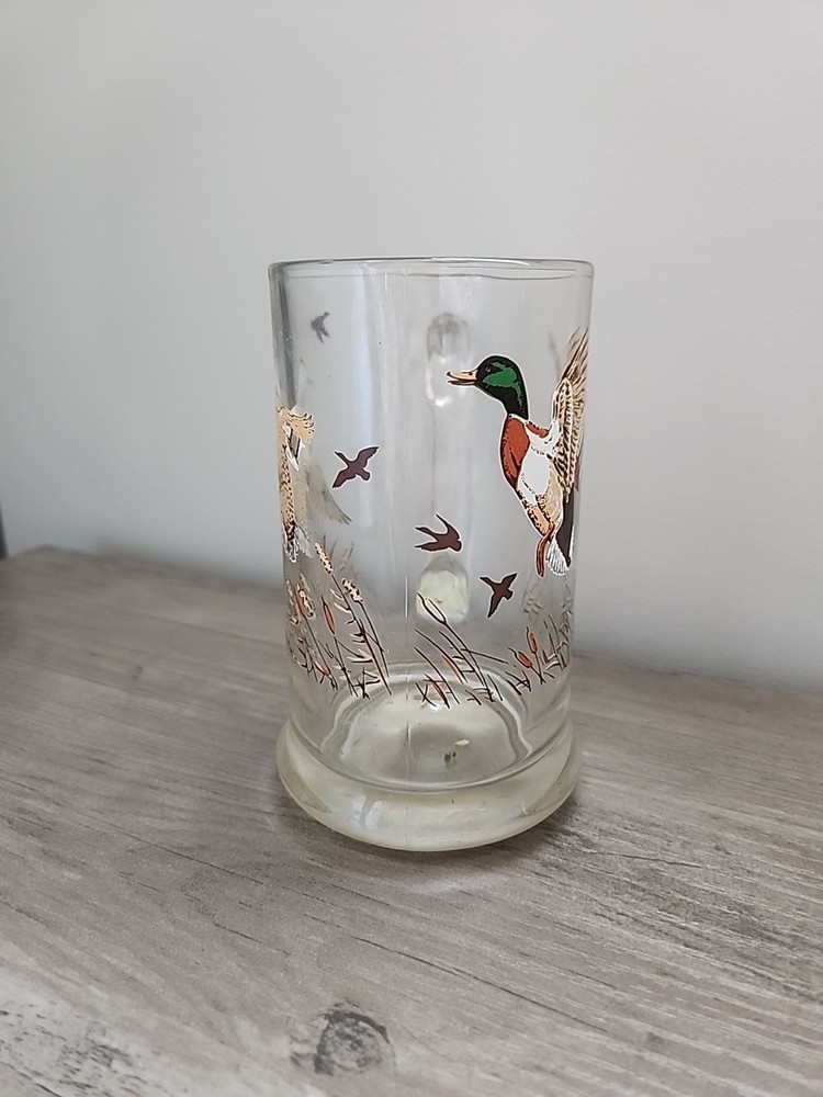 This rare Libby beer mug stein features a unique design with mallard and ducks, making it a sought-after vintage drinkware item. The round glass beer mug stands at 5 1/2" tall and is decorated with a clear color, making it perfect for all occasions. The set includes one beer stein, with a theme centered around ducks, adding a charming touch to any collection of dinnerware or serveware.