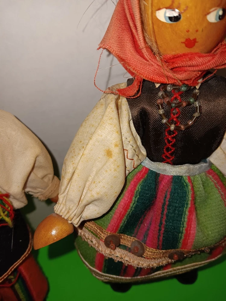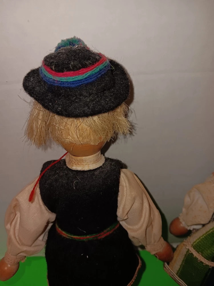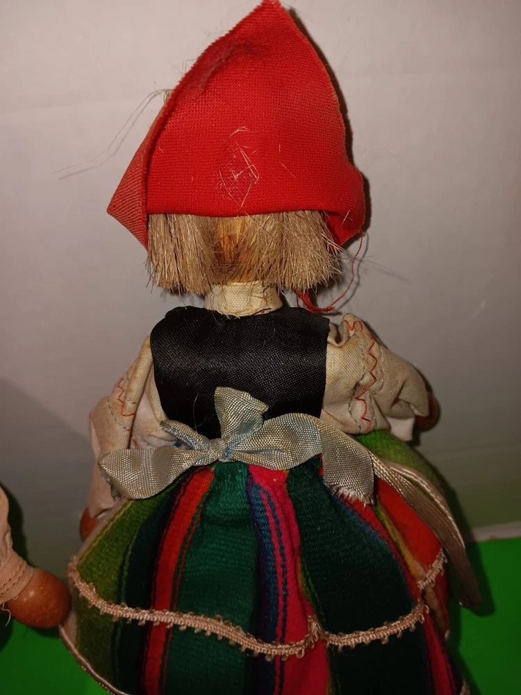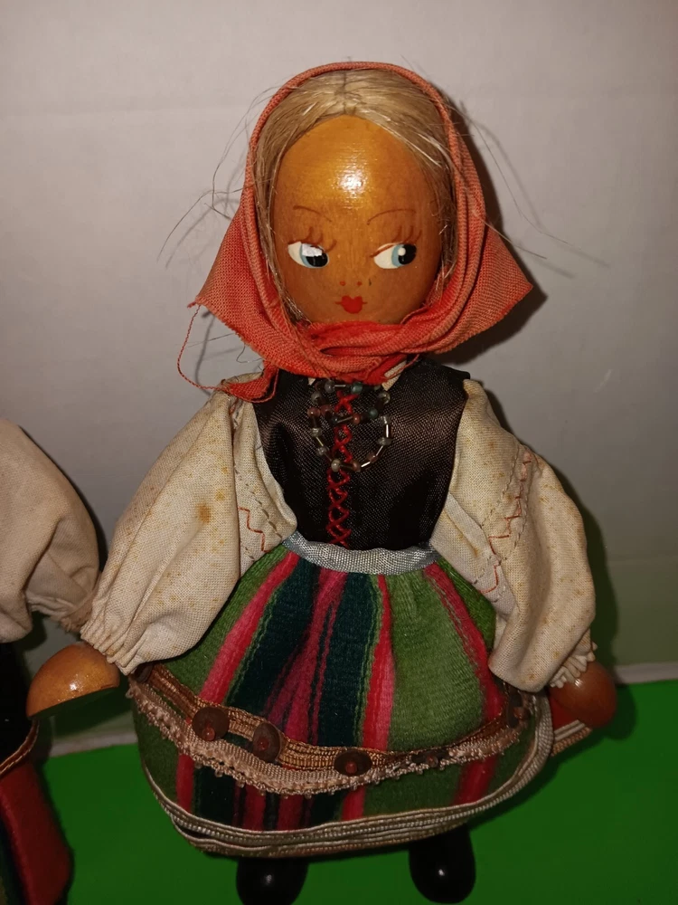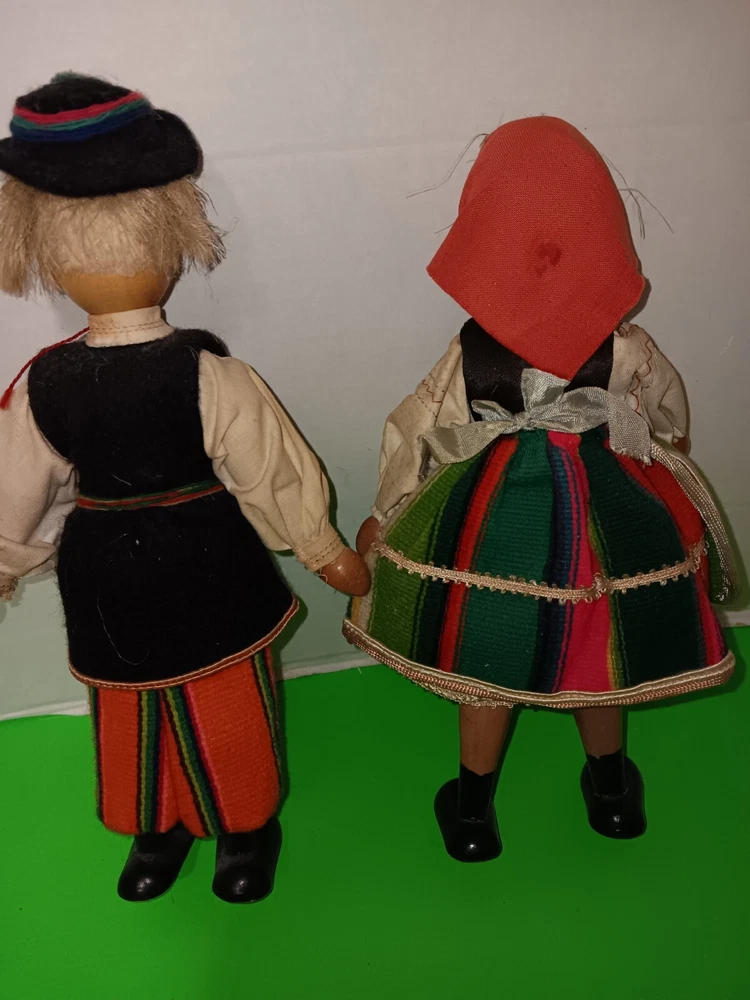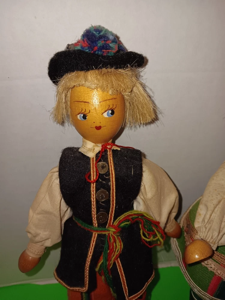 Here's a sweet couple of Polish wood peg dolls. They stand 9" tall. Overall, they are in good condition. There's a couple of light spots on the woman's sleeve. Not bad they are probably from age. Their clothing is colorful and very detailed. Please check out the pictures, you will enjoy adding this lovely pair to your collection. Buyer pays shipping. Thanks!