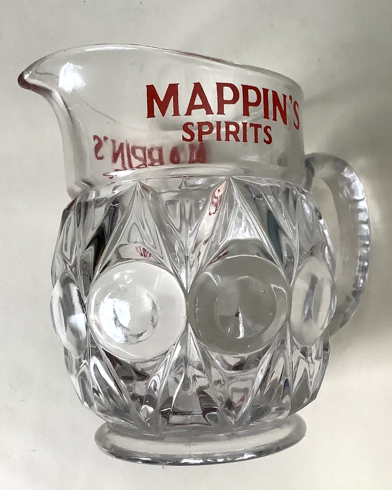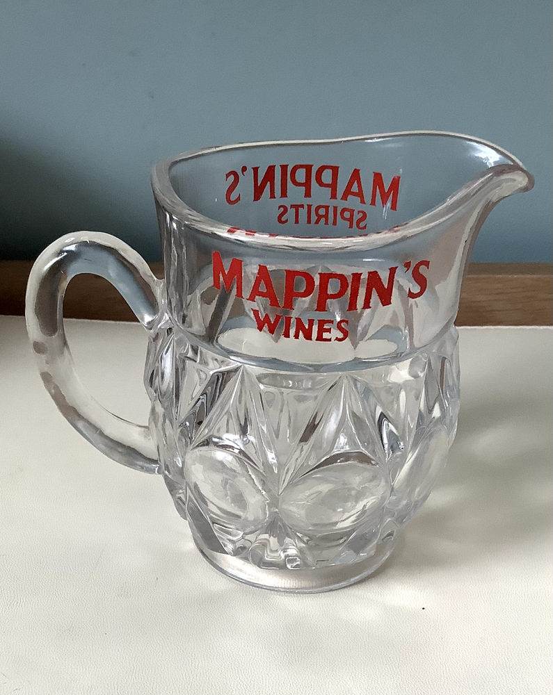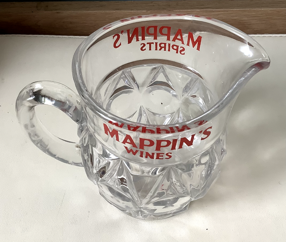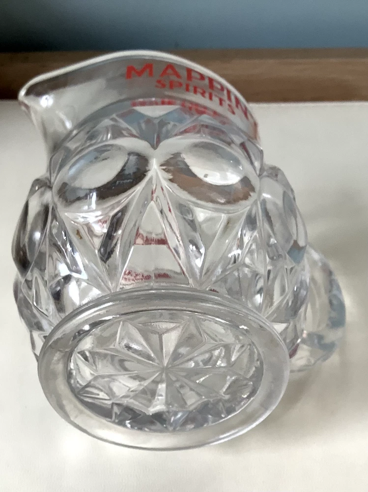 Lovely rare vintage glass water jug for wine / whiskey or spirits. Mappin’s name printed in red on clear glass ( Rotherham) Approx size of jug - height 12cm and width including handle approx 13 cm Top diameter approx 8 cm. Photo description actual water jug for sale and shows condition - very good. Will be packaged well in outer box and sent UK 48 hours tracked postage and for international purchase via global shipping service. I have other collectable brewerania on my site. Any questions please contact me on E Bay. Thank you I