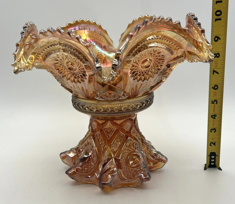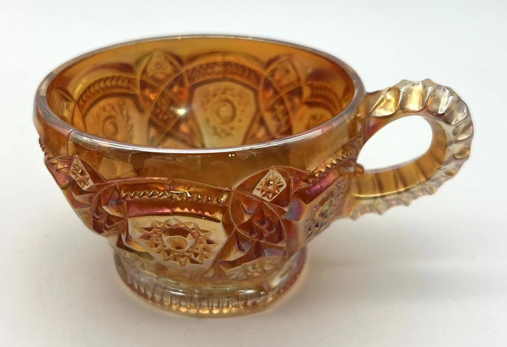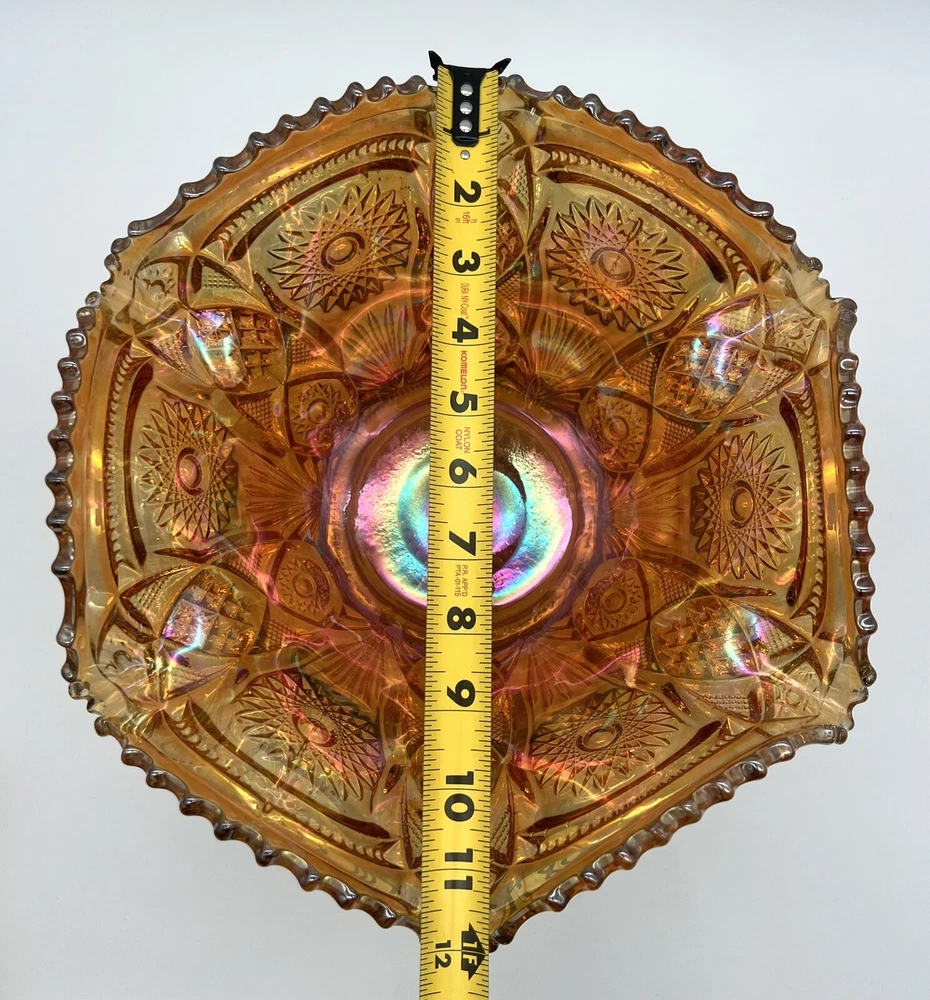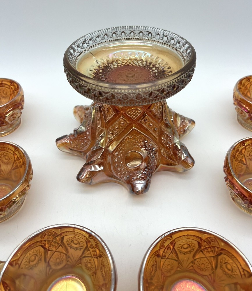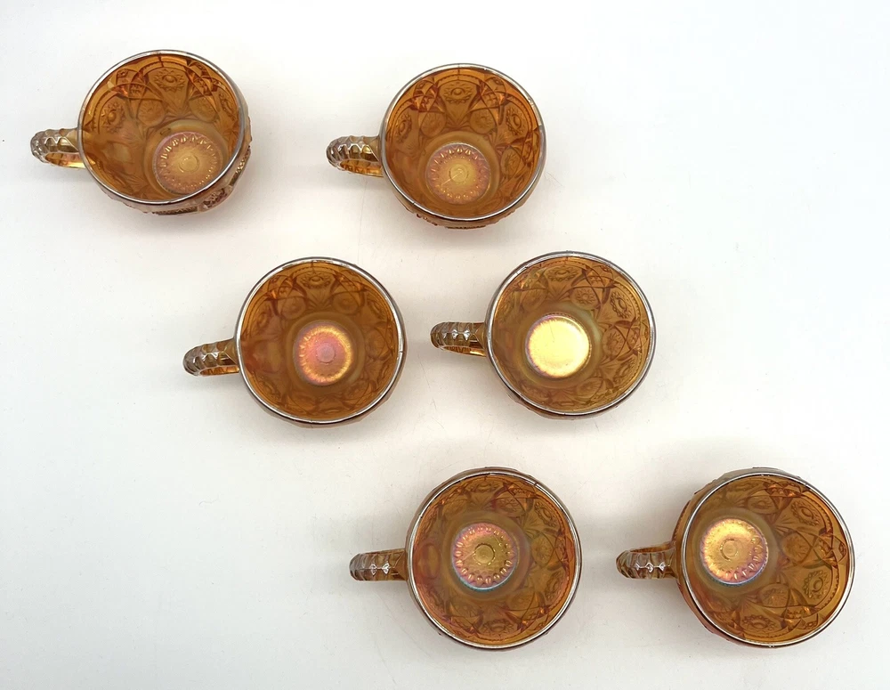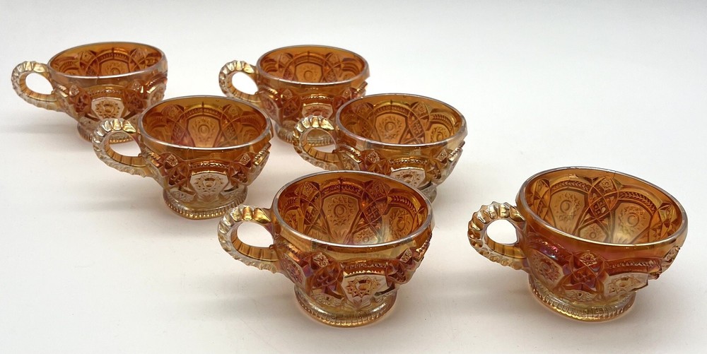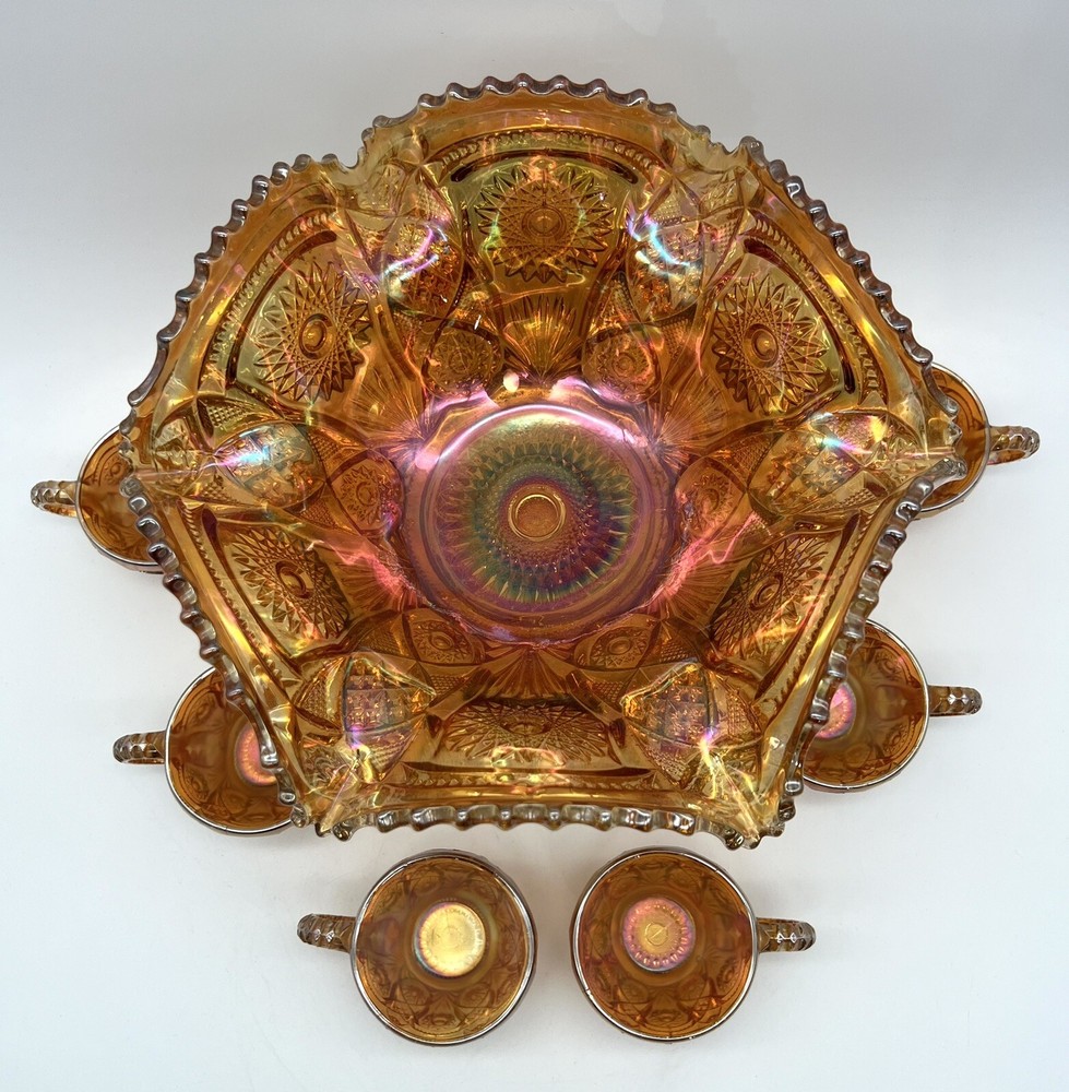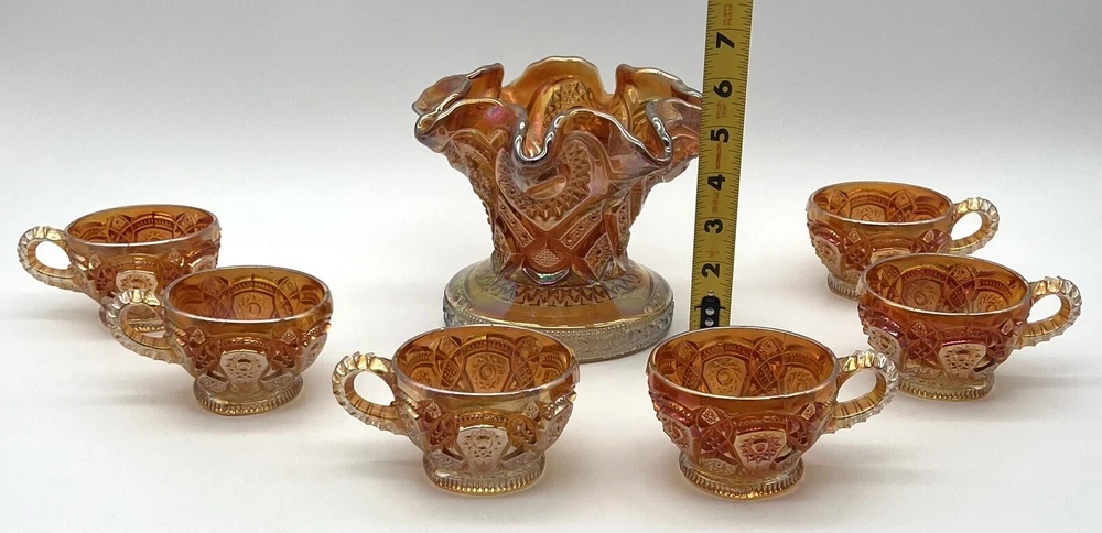 This vintage glassware set is a stunning addition to any collection. The marigold carnival design is beautifully crafted on eight pieces, including a punch bowl, six cups, and a base bowl. The set is perfect for all occasions and is sure to impress your guests. The glass material is durable and the set is designed to last for years. The round shape of the bowl and cups make them easy to hold and serve. The set is ideal for adults and is perfect for a service of six. Add this gorgeous marigold carnival glassware set to your home today. Please check all photos carefully before purchasing,photos are part of the description,what you see is what you get. 20