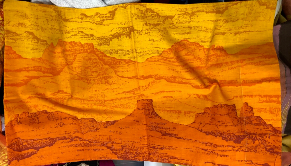 Vtg Marlborough Fitted Bed Sheet TWIN + 2 Pillowcases Mesa Desert Canyon Sunset FITTED TWIN SHEET: Length: 74" + 5.5" drop on each side (Roughly 85" total) Width: 39.5" + 5.5" drop on each side (Roughly 50" total) PILLOW CASES: 30" x 20" Nice with no stains, rips or holes. Elastic still stretches fine.