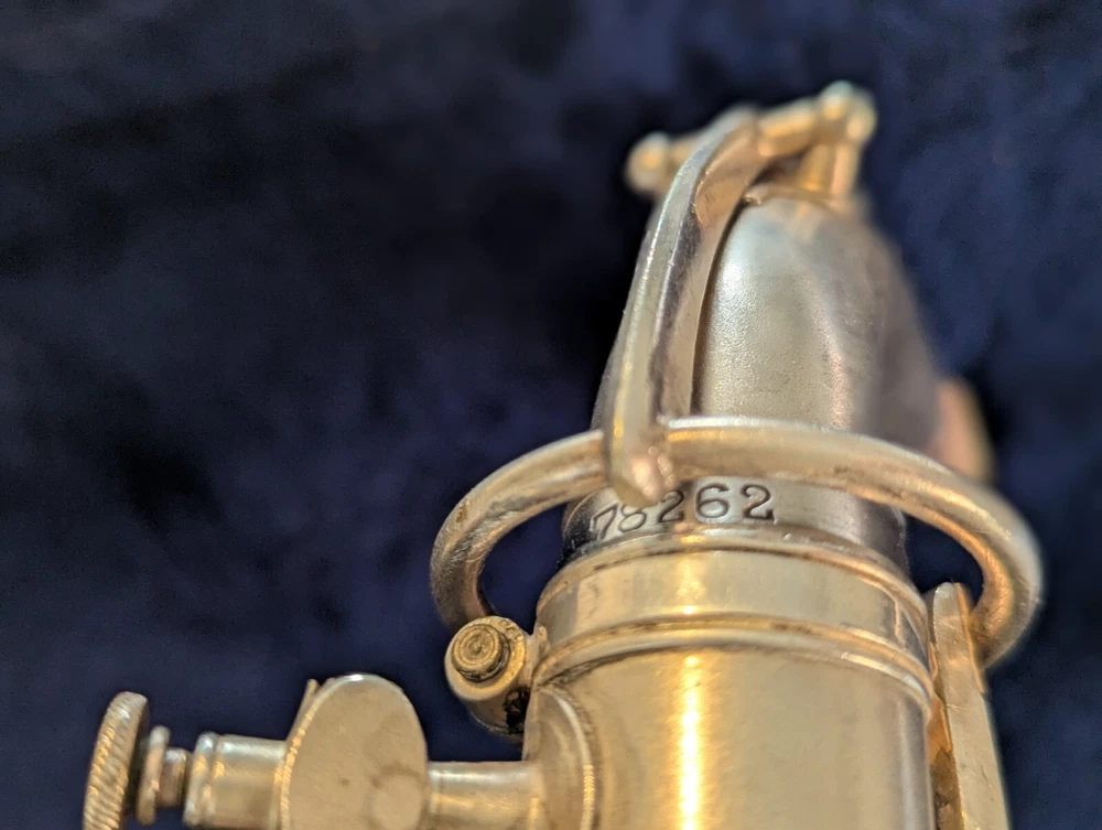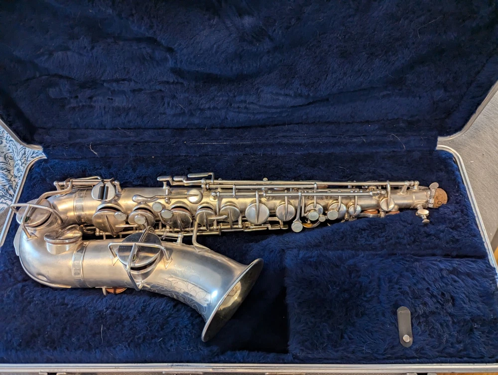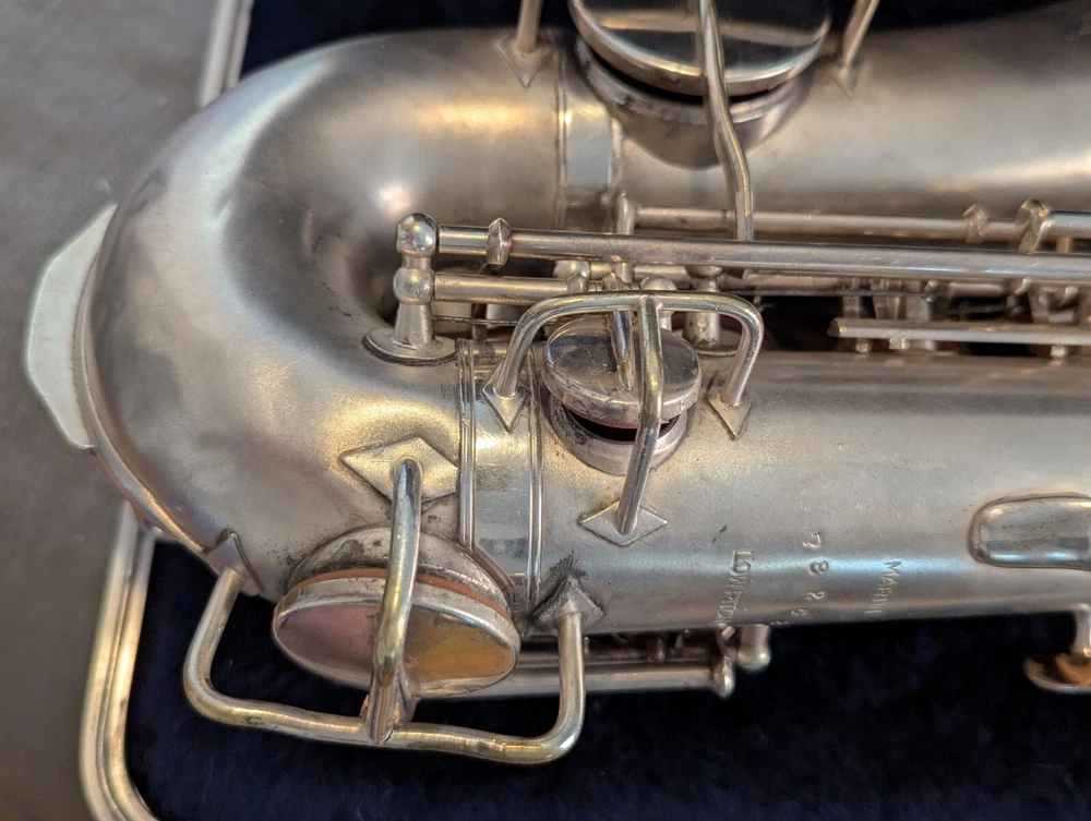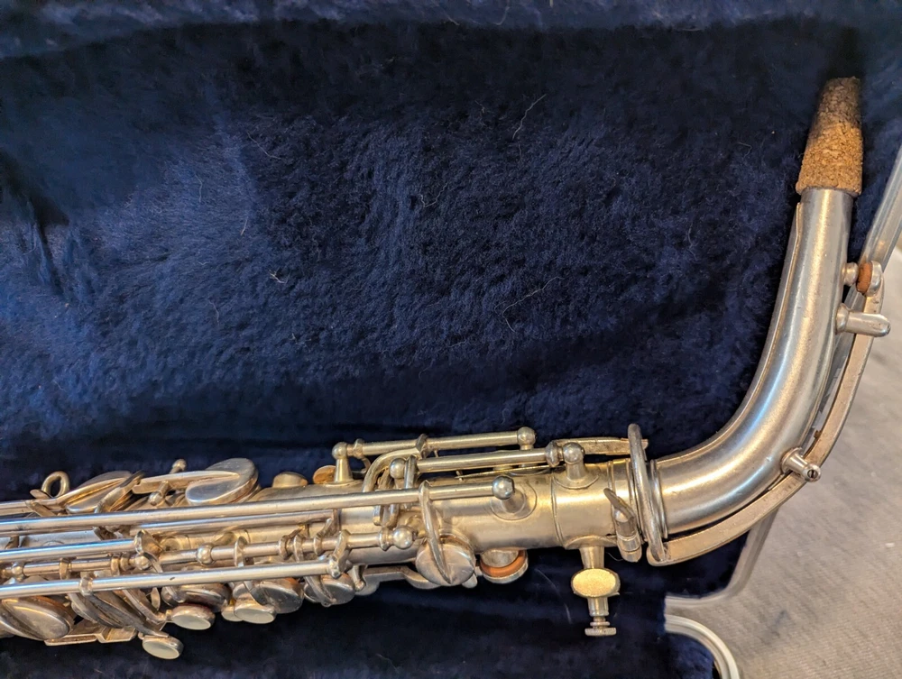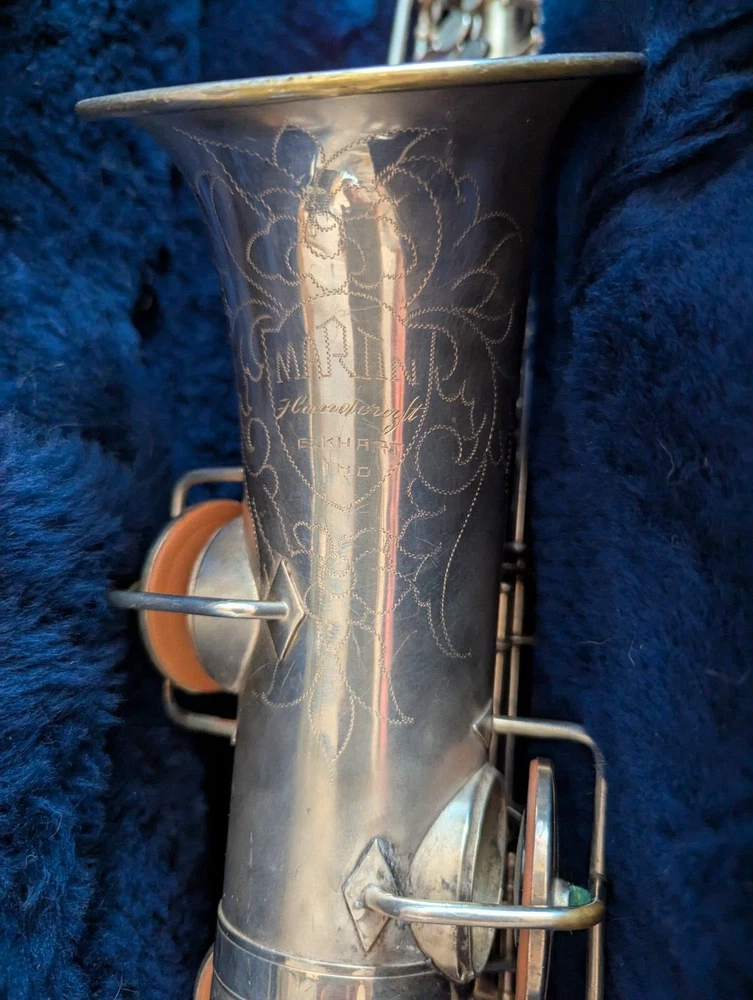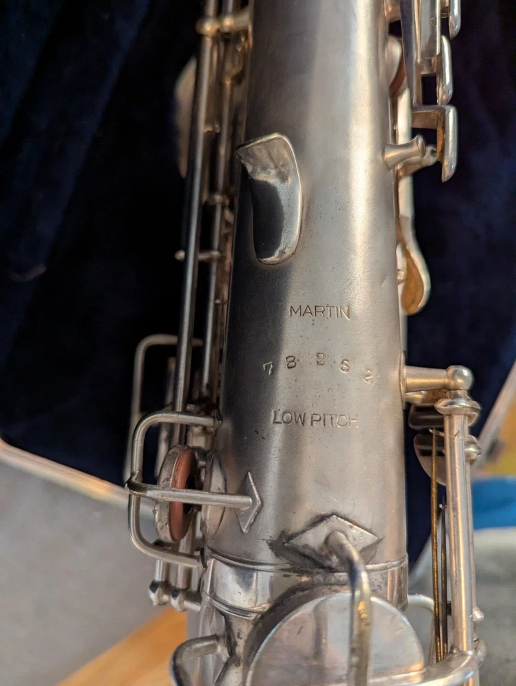 Here is a great vintage alto saxophone made by the folks at Martin. The serial number is 78262 placing its manufacture year at about 1927. Matching number on neck and body. The instrument is in overall good condition. The silver plate is in excellent condition, no real wear on touch points. Gold wash inside the bell. There's a bit of tarnish here and there which is typical of an instrument of this age. Otherwise, there are a few small dents & pings namely on the elbow and one on the back between the pinky G# key & side Bb tone hole. Some of the key guard feet & braces have been re-soldered. Everything works smoothly and quietly, (even the rollers roll), and the instrument plays just fine top to bottom. That said, it's always a good idea to get an instrument fine tuned after shipment. Felted & corked as needed. The pads are new with plastic resonators, replaced & fitted less than a year ago. It has nice sweet but smoky/dark Martin sound. The included hard-shell case is from Conn and is in great condition. The 2 latches work fine, soft clean fuzzy interior and no stank odor. The usual little accessory box. It also comes with a vintage string neck strap and a cute champagne cork neck plug which helps the sax sit snugly inside the case without sliding around. No mouthpiece, cap or ligature is included. This auction is for the sax, neck strap, & case - just what you see in the photos. No other accessories are included. I have made every attempt to describe this item as accurately as possible, but feel free to ask any other questions prior to bidding. Please see photos as part of the description, I am happy to provide more upon request. Shipping is via FedEx Ground\Home or UPS Ground and cost will vary depending on location. Local pickup in NYC is okay too. Sold as-is. No returns please.