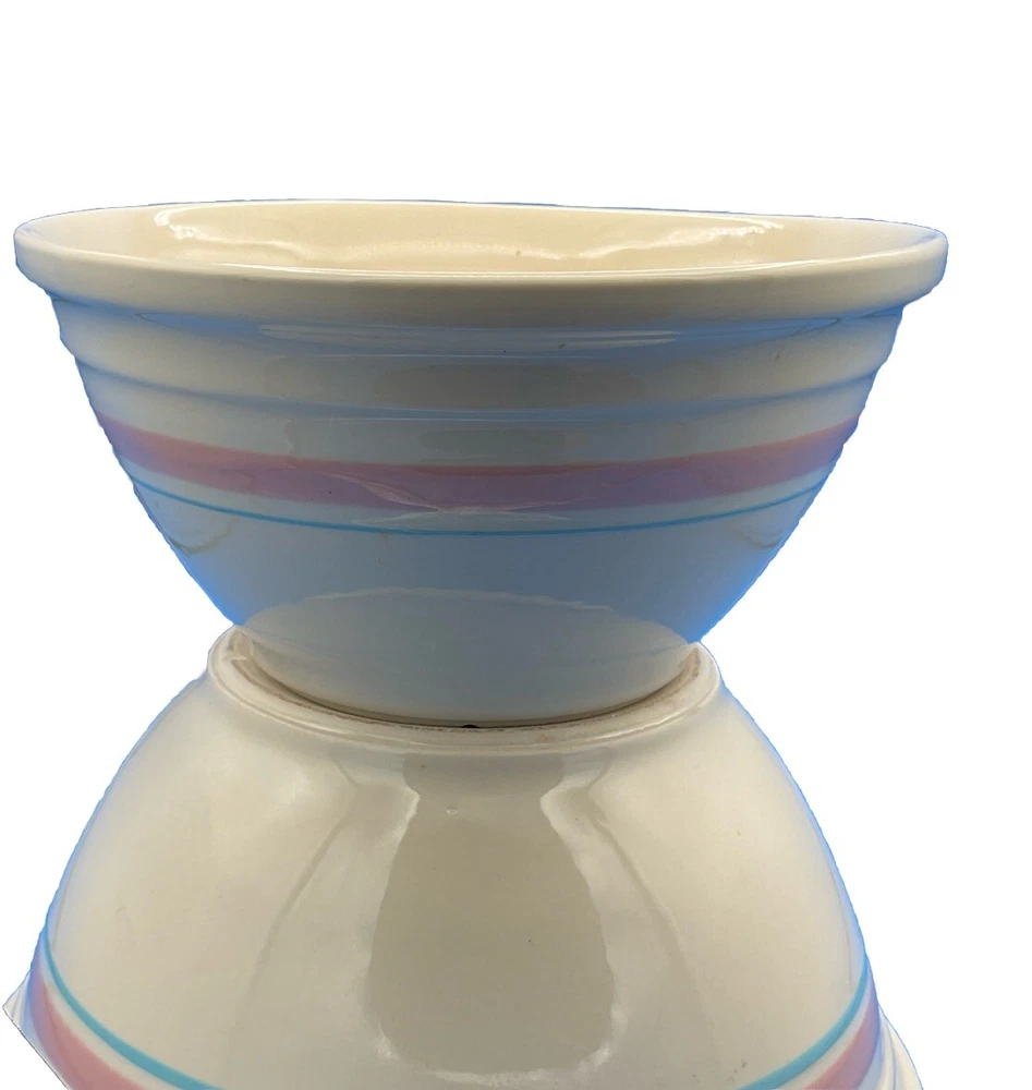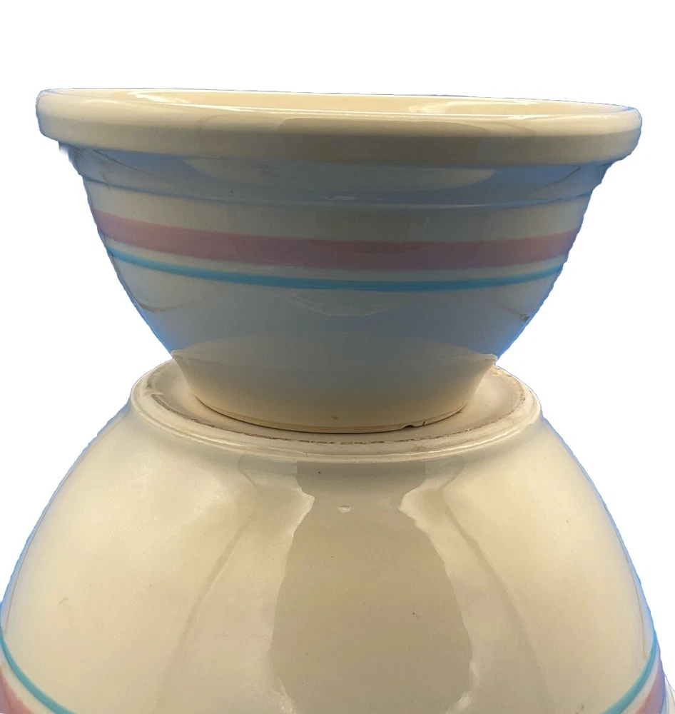 3 piece set of vintage McCoy Memories Roseville mixing bowls. Pink/blue stripe. Approx measurements: 6 1/2”H x 12”W; 5 1/4”H x 10”W; 4 1/4”H x 8”H. No chips or cracks. No crazing that I saw. These bowls are in excellent condition! See pictures as part of description. *We will consider any reasonable offer. Check our other listings as we add new items daily. Thanks for looking and give us a follow!*