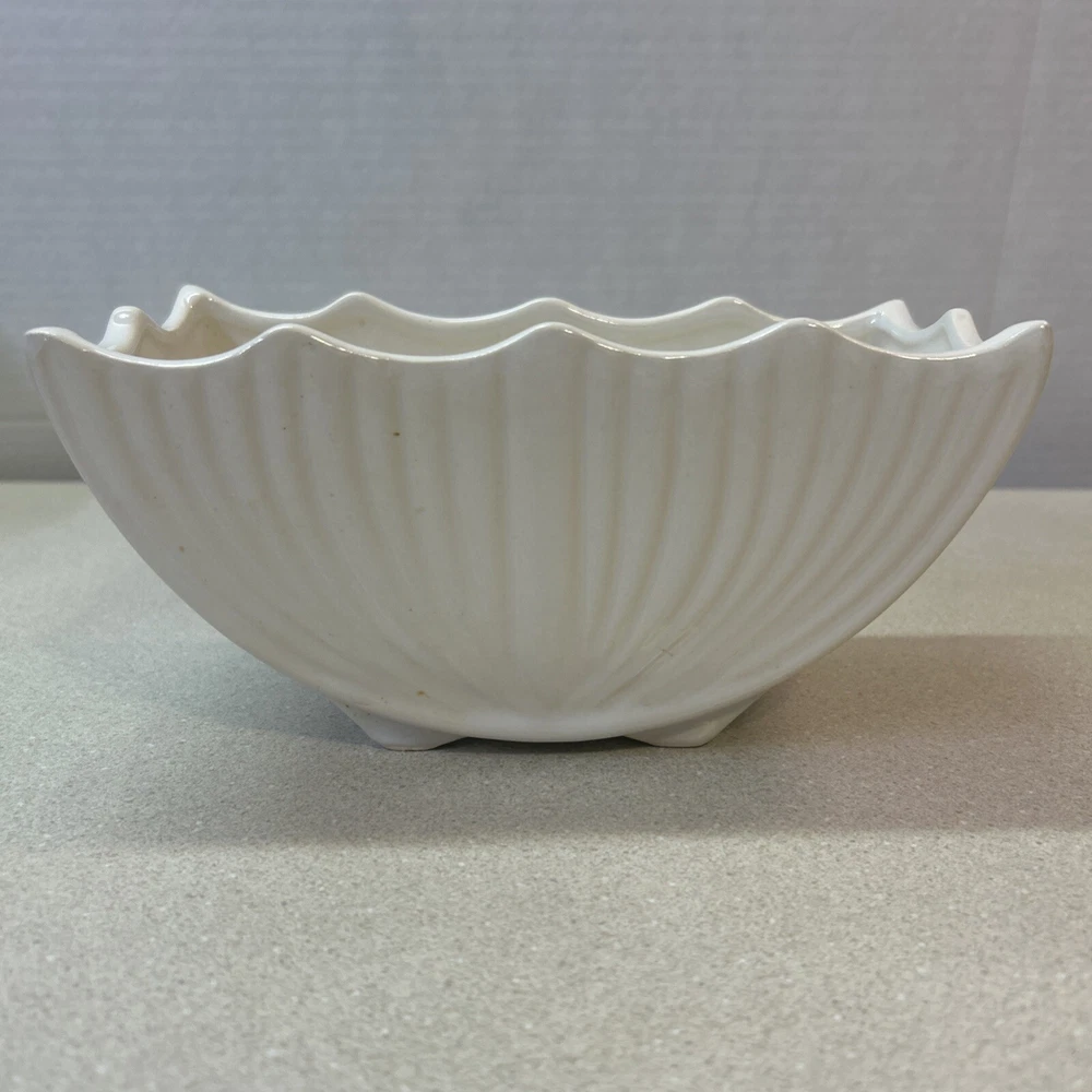 Pattern:ScallopedIndoor/Outdoor:IndoorSubject:DesignBrand:McCoyTime Period Manufactured:1940-1949Material:CeramicCountry/Region of Manufacture:United StatesColor:WhiteProduction Technique:PotteryYear Manufactured:1940Finish:GlossyShape:scallopedType:PlanterBackstamp:ImpressedTheme:scallopedVintage:YesOriginal/Licensed Reproduction:Original
