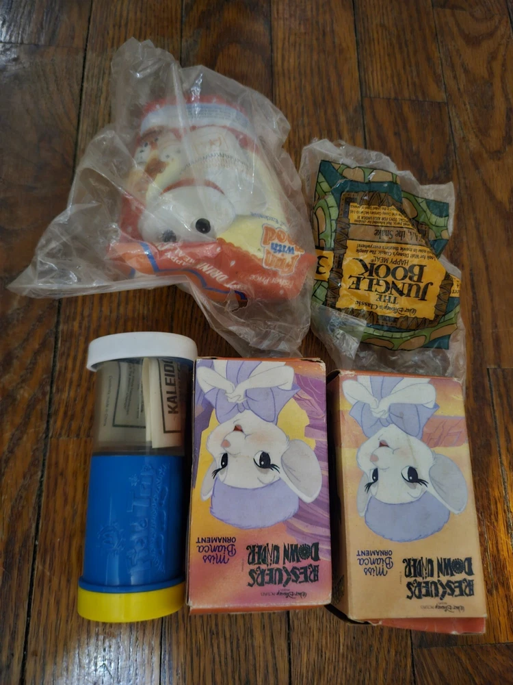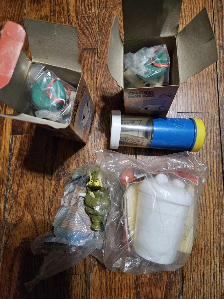 Vintage McDonald's Happy Meal Toys Some New In Box. 5 Toys in total. Two Rescue Rangers new in Box, one Fun with Food new in bag, one field trip toy and one jungle book toy that the bag has ripped on.