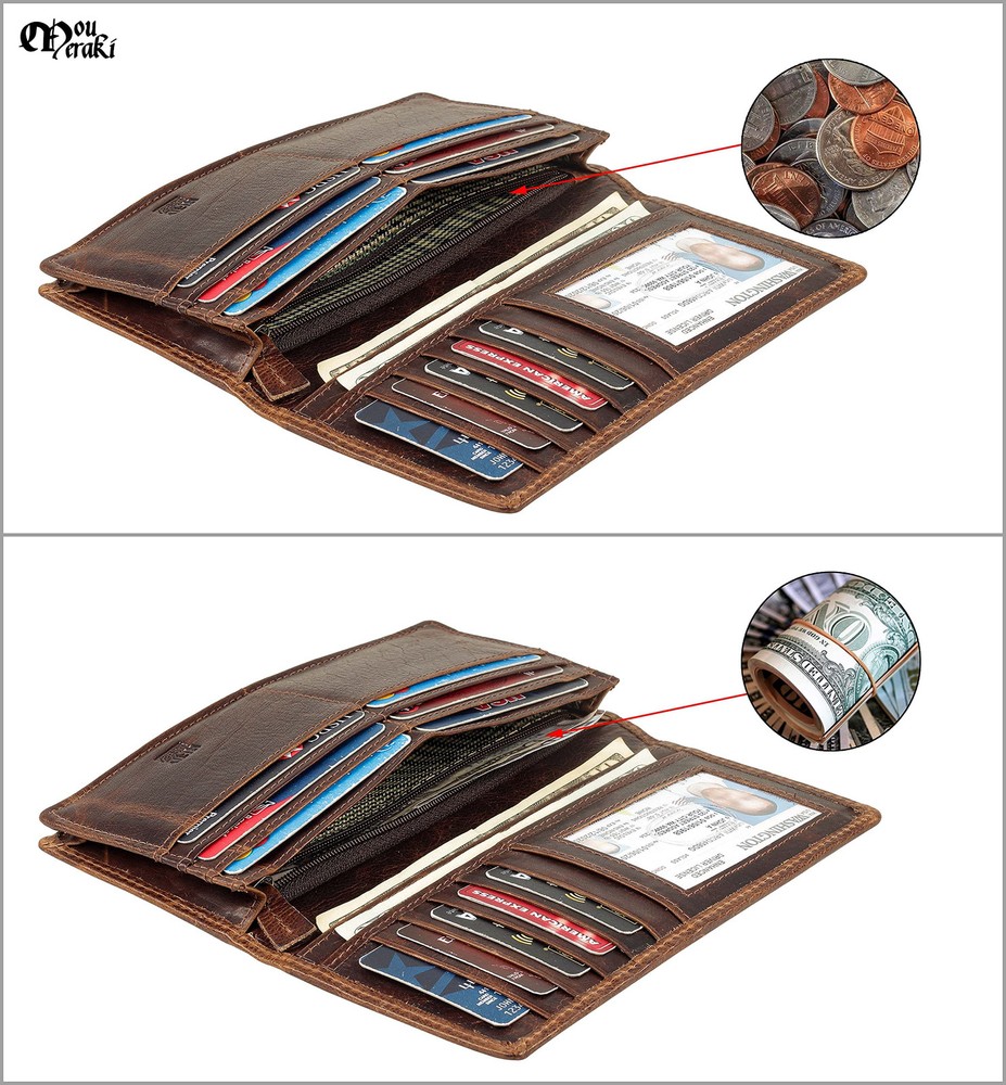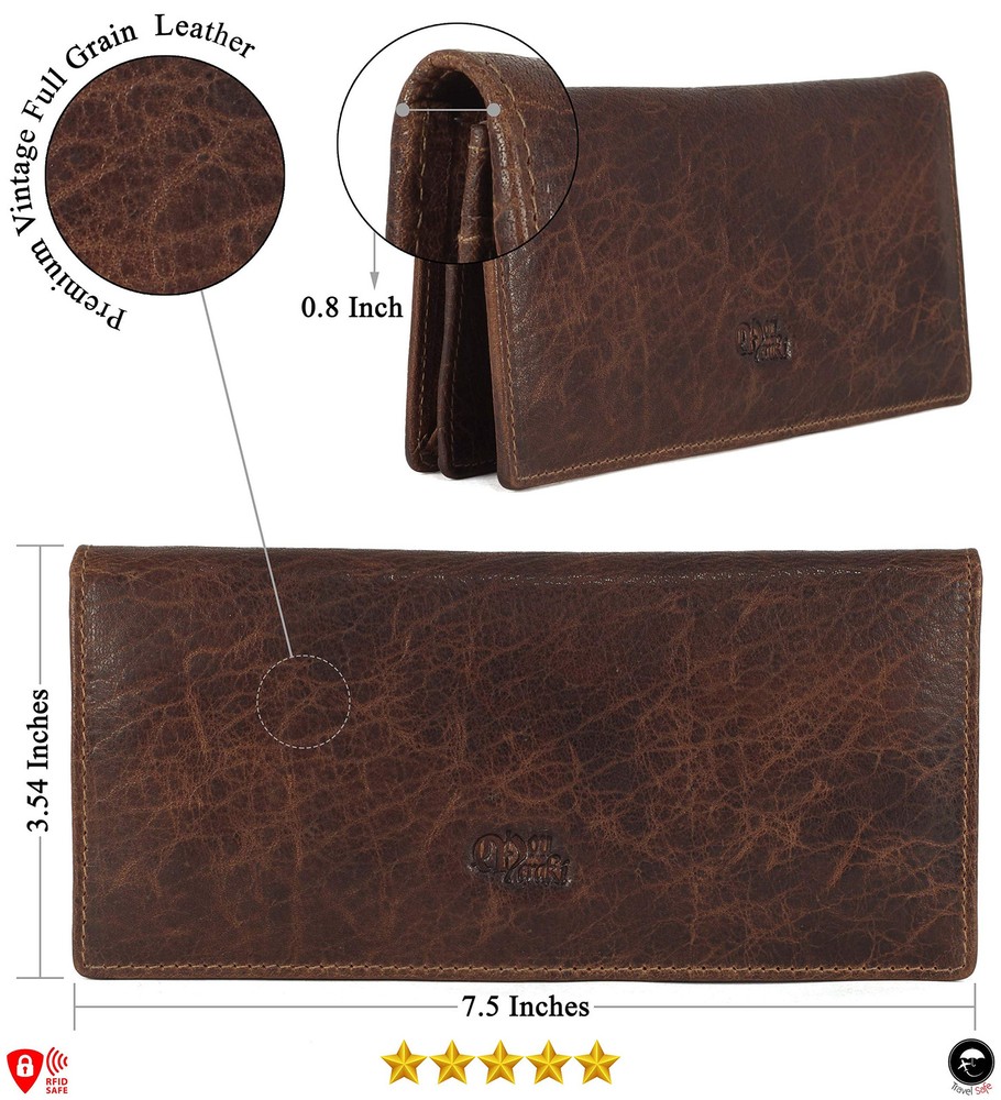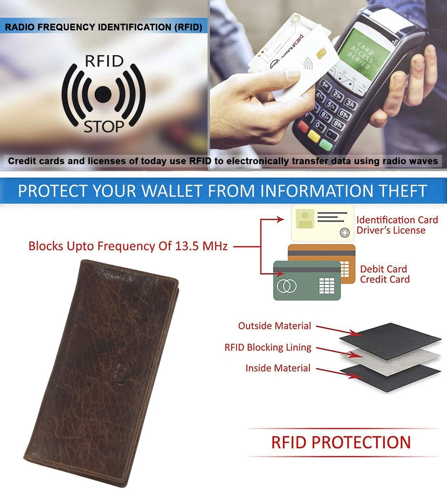 SUPER SPACIOUS : SIZE : 7.5" X 3.54" X 0.8" . 100% GENUINE LEATHER: soft and durable FUNCTIONALITY: 11 card slots, 1 id window, 3 bill / currency compartment . RFID BLOCKING TESTED & APPROVED BY INDEPENDENT LAB TESTS: Our wallets for men have been tested for 13.56 MHz Frequency in which our credit cards, debit cards, driver license and ID cards operate GIFT BOX PACKING PACK: Our Long Wallets for Men is a perfect gift idea for your beloved man for birthday, valentine, Christmas and anniversary This beautiful and elegant wallet for men will make the perfect gift for every gentleman in your life. The leather tall wallet has a smooth finish for maximum elegance and it is extremely durable so that you will never have to worry about tearing it