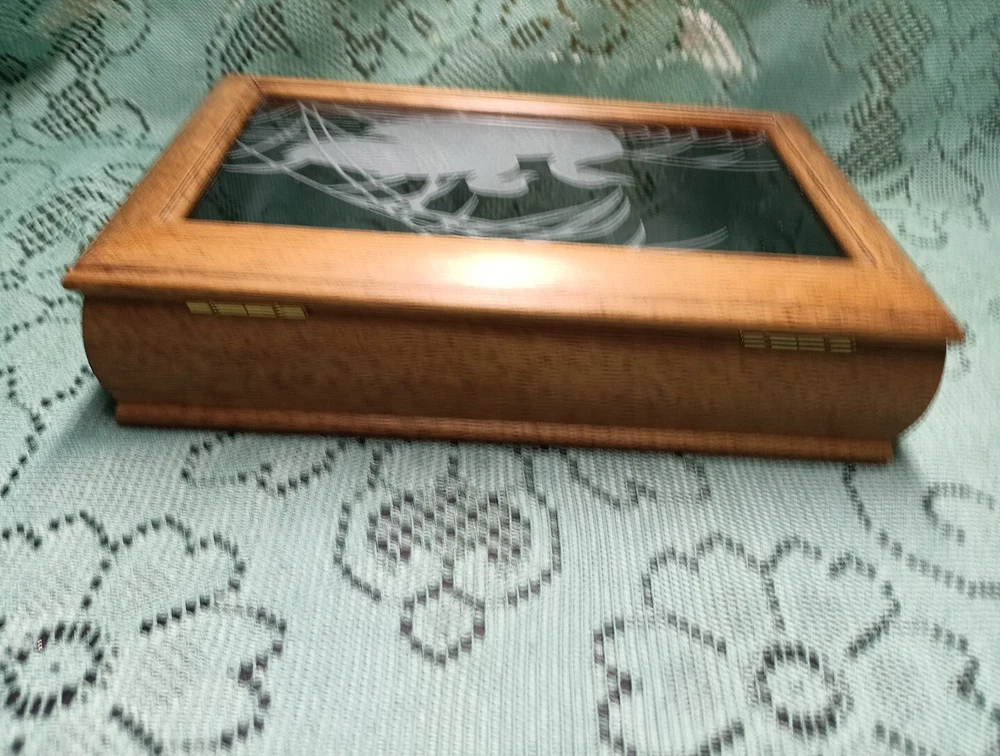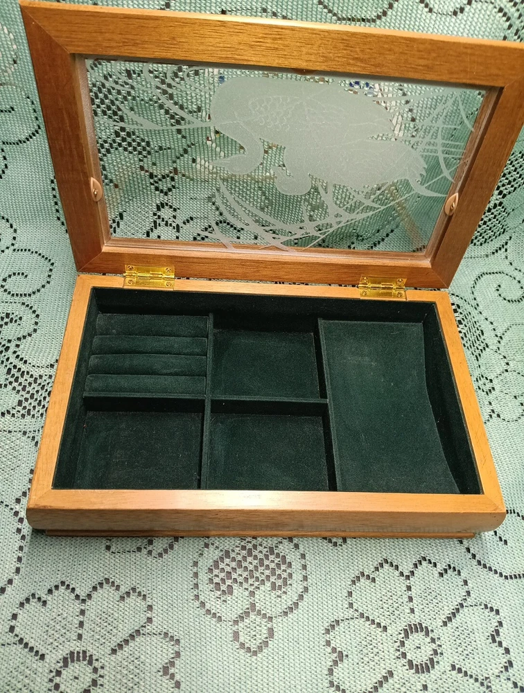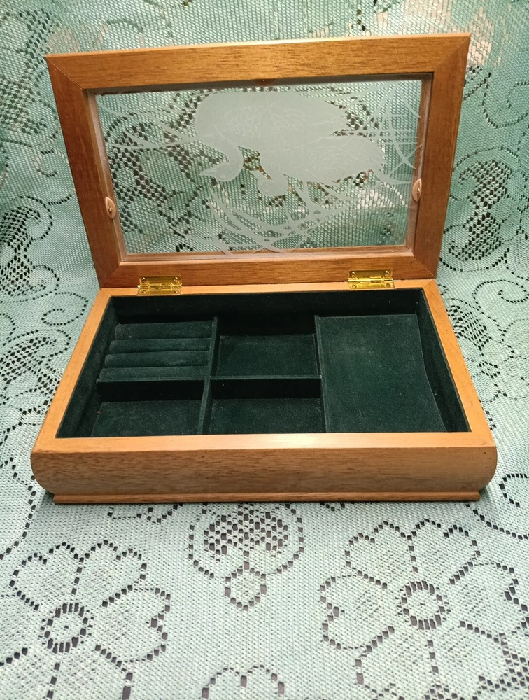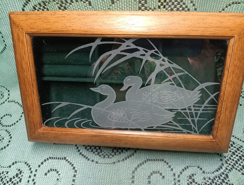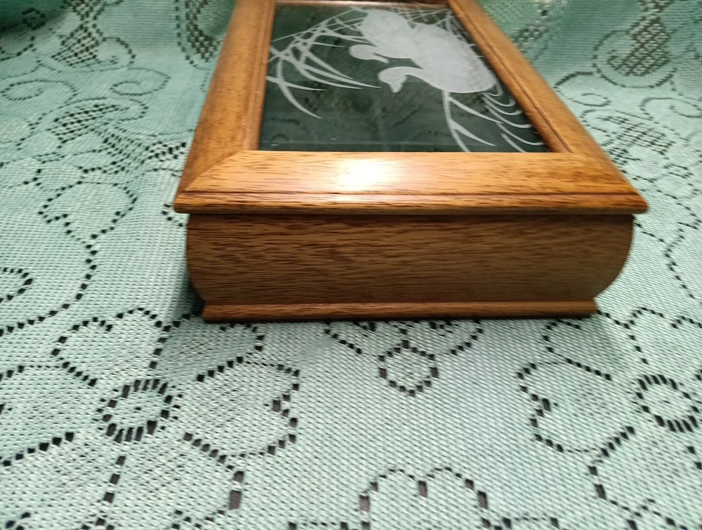 Vintage Men's Wooden Jewelry Storage Box Etched Glass Top Lid Ducks on Pond