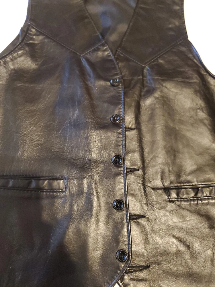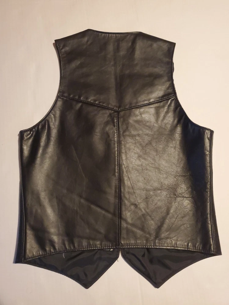 Up for sale is a classic black leather vest from The Leather Shop, perfect for any occasion, be it travel, casual, formal or workwear. The vest is made of high-quality leather and features a solid pattern with a button closure. It is a short-length vest with a regular fit and is available in size 36. This vintage vest has accents of button and is lined with lightweight nylon material. It is perfect for riding in any season, be it winter, summer, fall or spring. The vest also has pockets to carry your essentials. The vest is a perfect addition to your wardrobe if you love Western, motorcycle or cowboy-themed outfits. Fast Shipping!