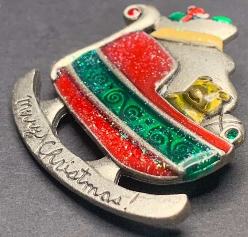 Vintage Merry Christmas Sleigh Santa Brooch Pin Green Red Silver