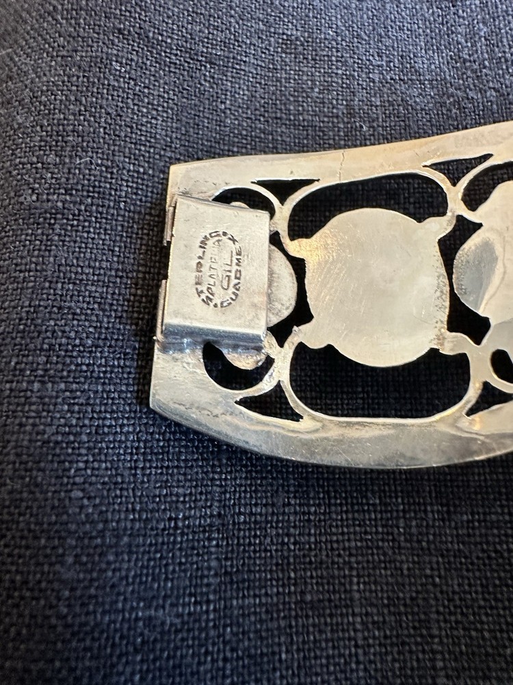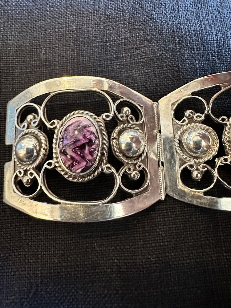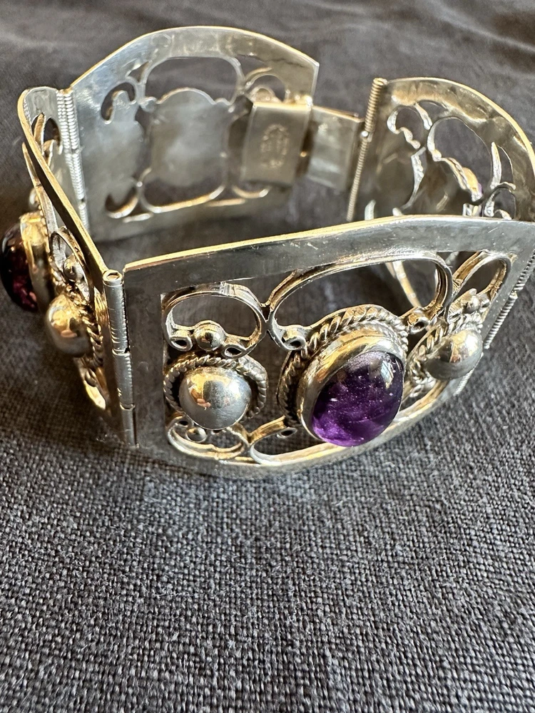 The Vintage Mexico Sterling Silver Bracelet by Plateria GIL is a unique and handmade piece of fine jewelry. Crafted in Mexico, this original link style bracelet features a bezel setting and is signed by the brand. Made with 925 sterling silver, this bracelet showcases a purple stone creation and is perfect for anyone looking for a beautiful and vintage accessory to add to their collection. With its intricate design and craftsmanship, this bracelet is a timeless piece that is sure to make a statement.