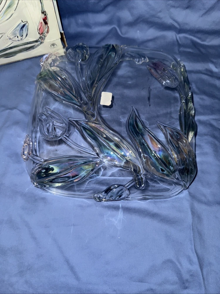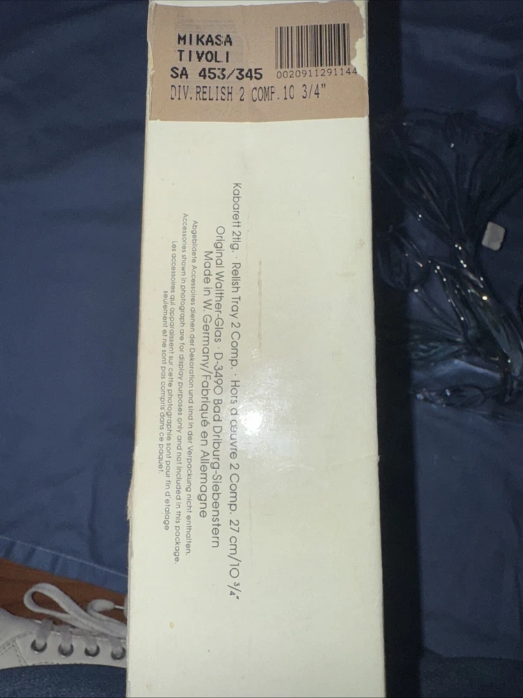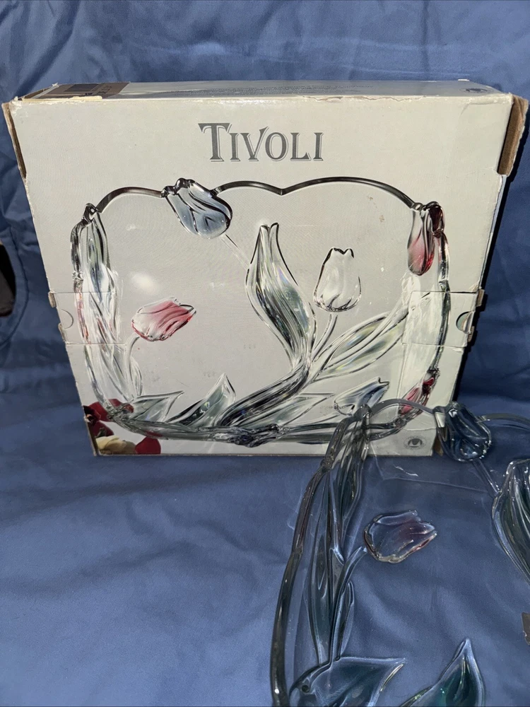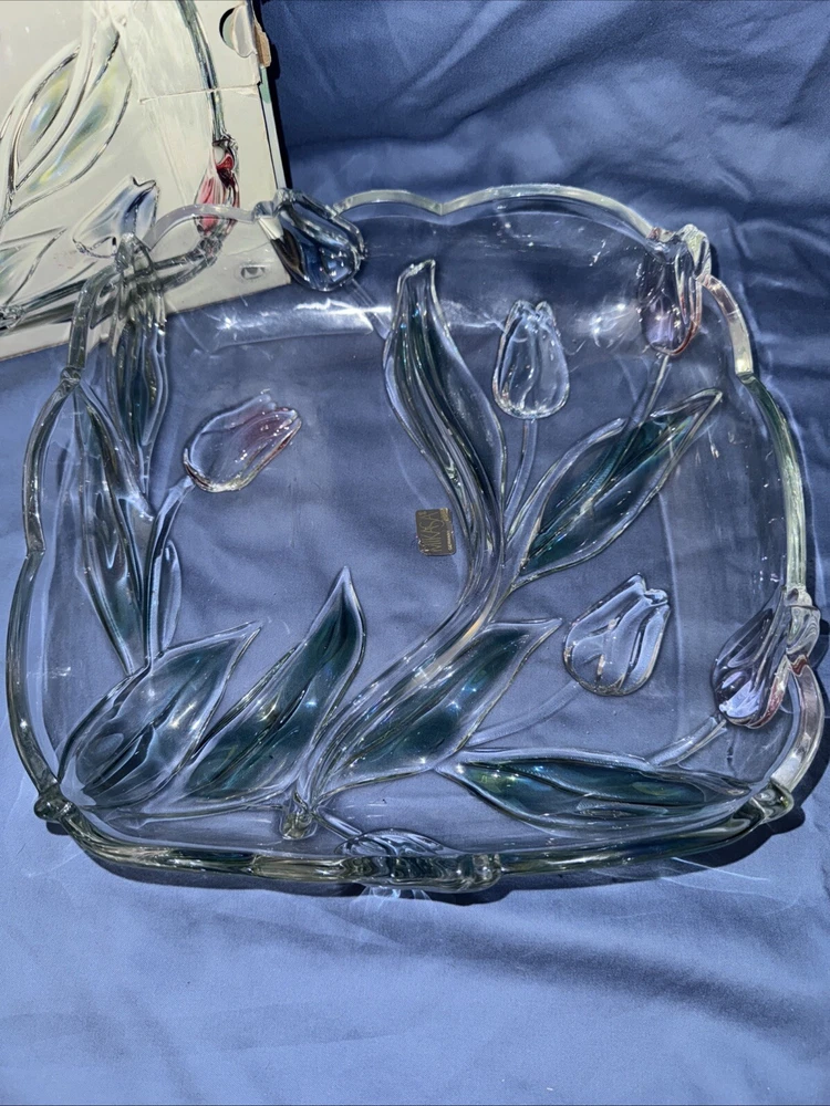 This is a vintage Mikasa Tivoli Walther crystal relish dish featuring a flower theme. The large divided dish is made of clear crystal and is in excellent used condition. It is designed for serving relishes and has a decorative appeal perfect for dinnerware and serveware collections.sold as is