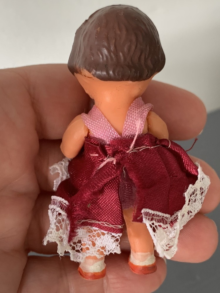 Miniature Rubber German Jtd Doll Dollhouse about 2”Condition is "Used" as shown tiny bit of age wear but so sweet. Shipped with USPS First Class.