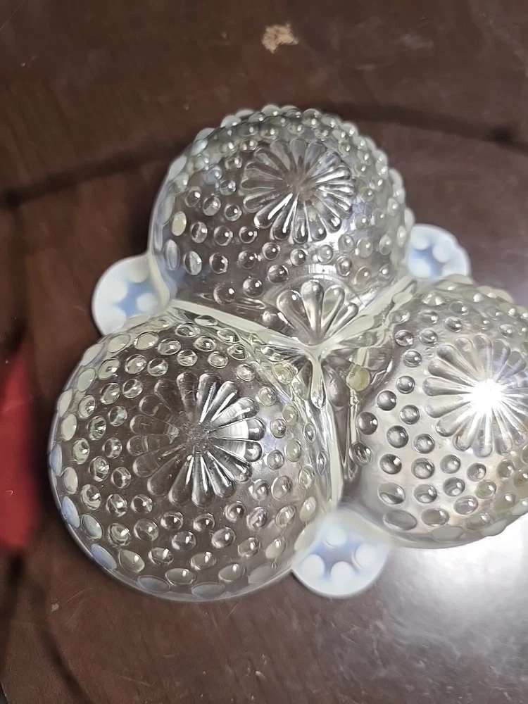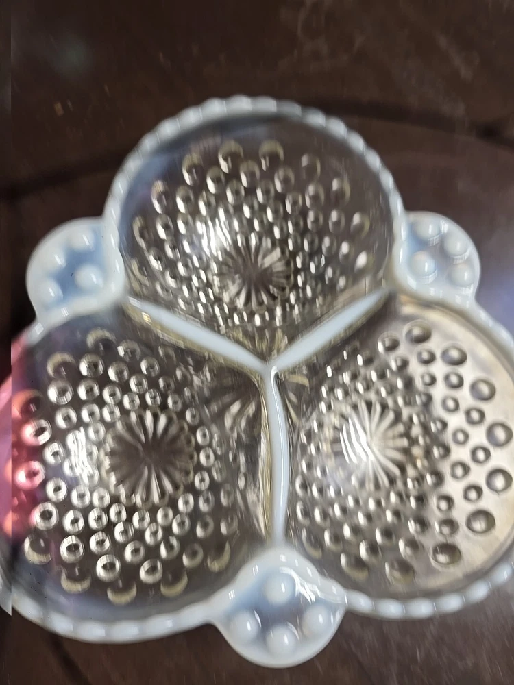 This vintage candy dish is a beautiful example of Moonstone Opalescent glassware. The dish features a triangular shape with three compartments, perfect for serving relish or candy. The clear and white glass is adorned with a Hobnail pattern, adding a touch of elegance to any table setting. This divided dish is a charming piece of decorative cookware that would be a lovely addition to any collection of vintage glassware.
