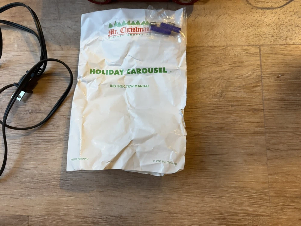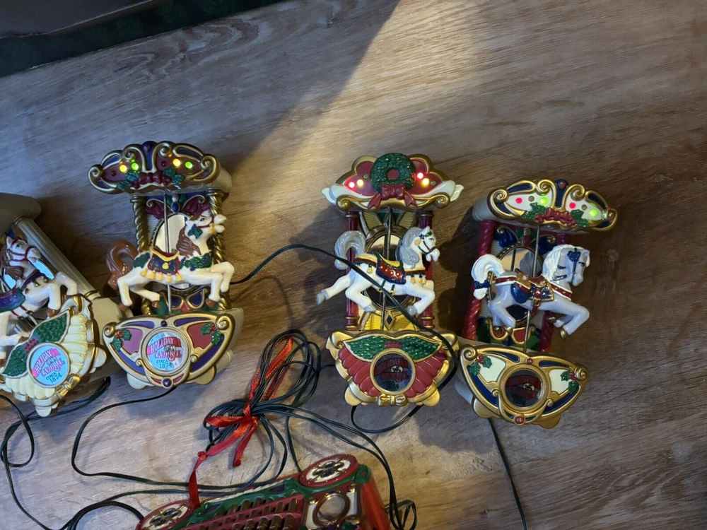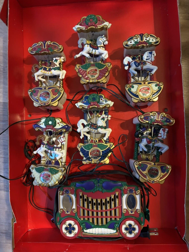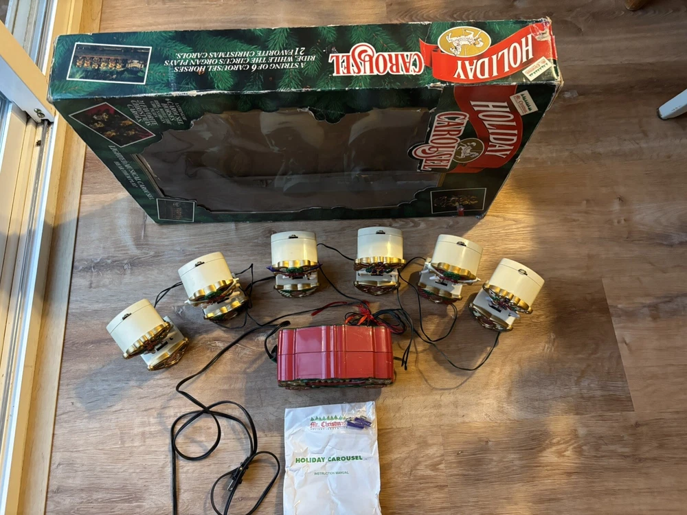 Original Vintage Mr. Christmas Holiday Carousel Lighted Musical Horses that works as designed. a set of 6 carousel horses ride while the circus organ plays 21 favorite Christmas carols with box--shows wear manual tested and in working condition We only accept returns if there has been an error in our listing.