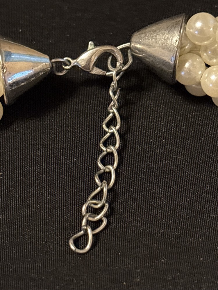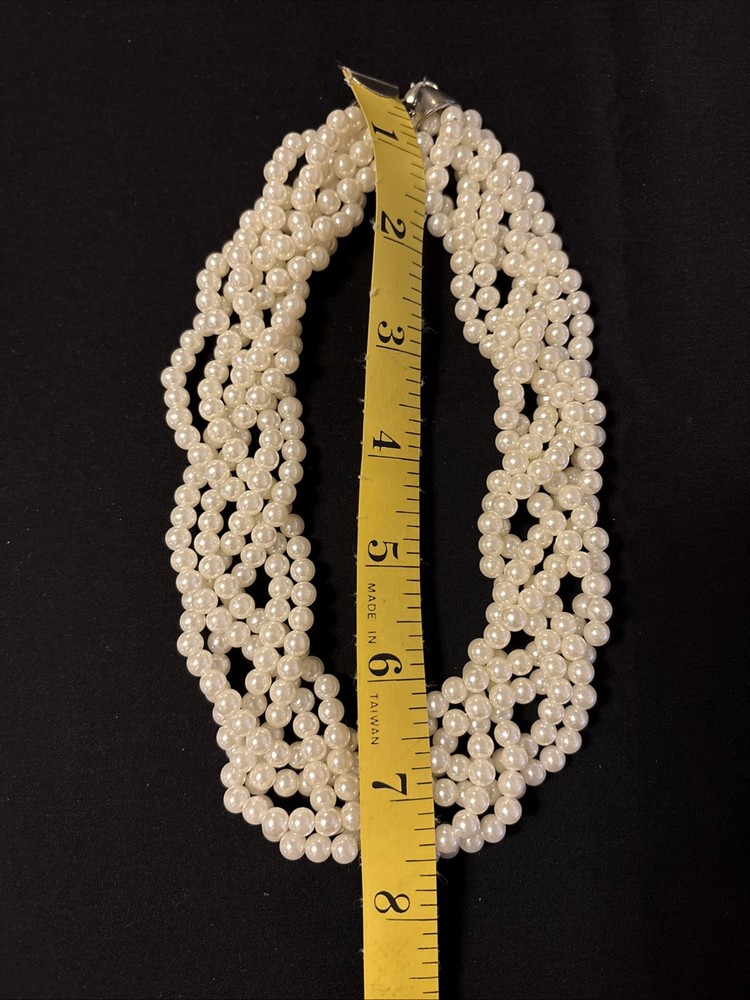 Elevate your jewelry collection with the timeless elegance of this Vintage Multi Strand Faux Pearl and Silver Choker Necklace. At 8 inches in length, it sits perfectly around the neck, offering a classic and sophisticated touch to any outfit. The unbranded nature of this piece adds a unique element to its charm, catering to those who appreciate understated beauty without the distraction of visible logos. Crafted with meticulous attention to detail, the necklace features multiple strands of white acrylic faux pearls, creating a luxurious and graceful appearance. Ideal for all occasions, its versatile style ensures it complements both formal wear and casual attire. Embrace the simplicity of this fine jewelry piece, a true testament to the beauty of classic accessorizing.