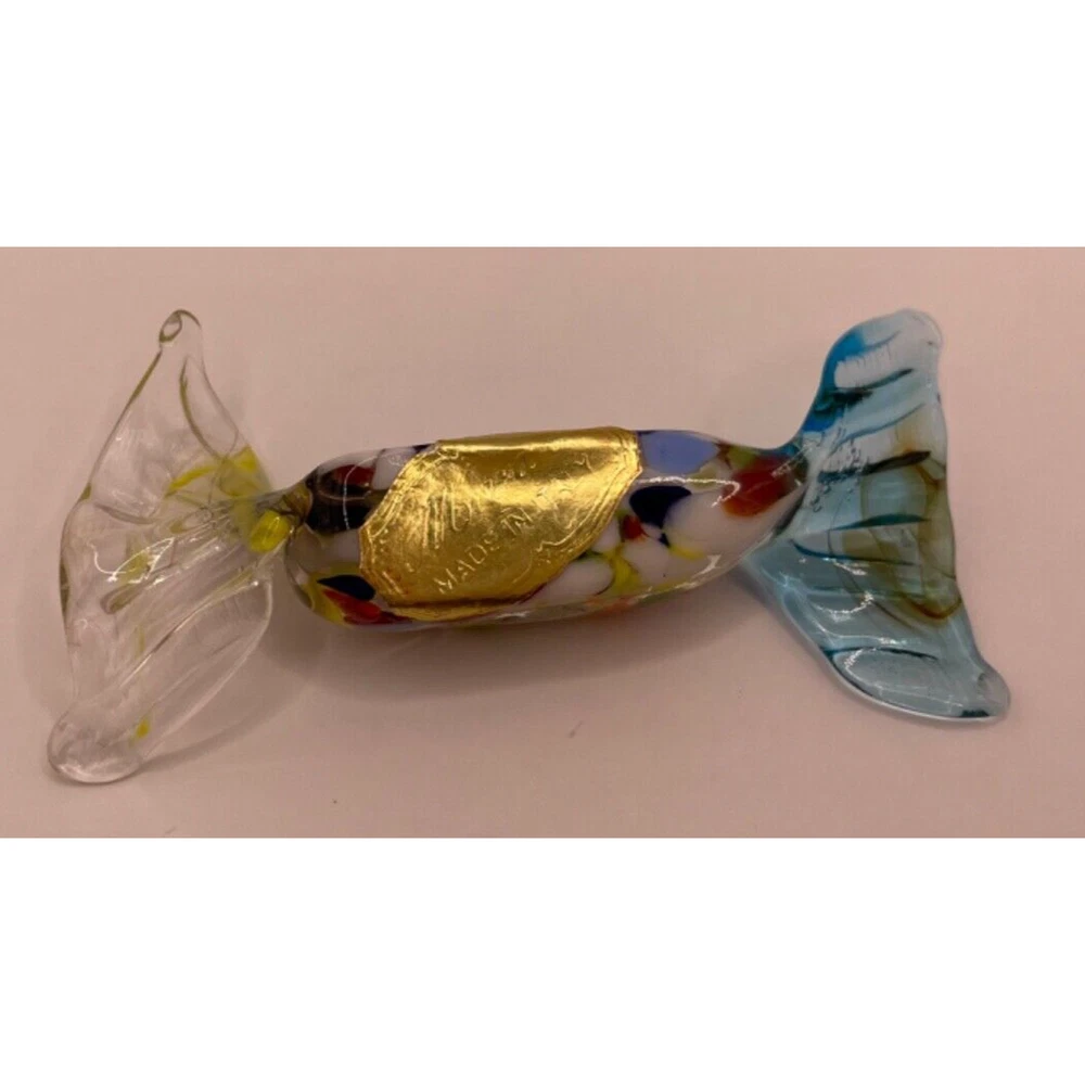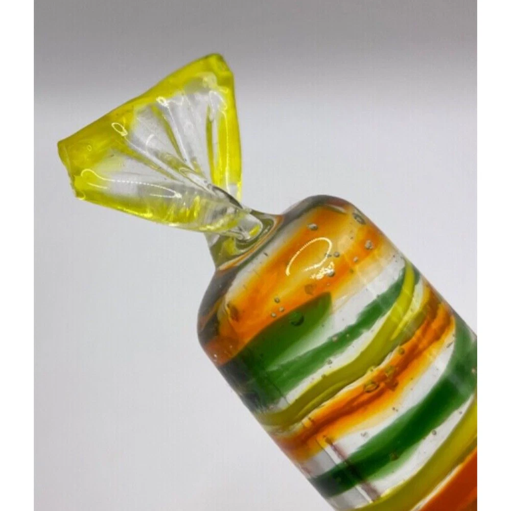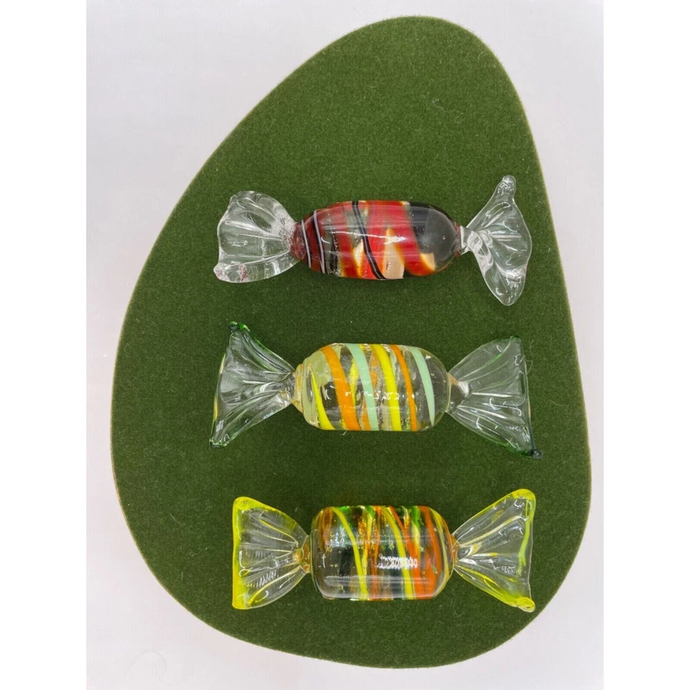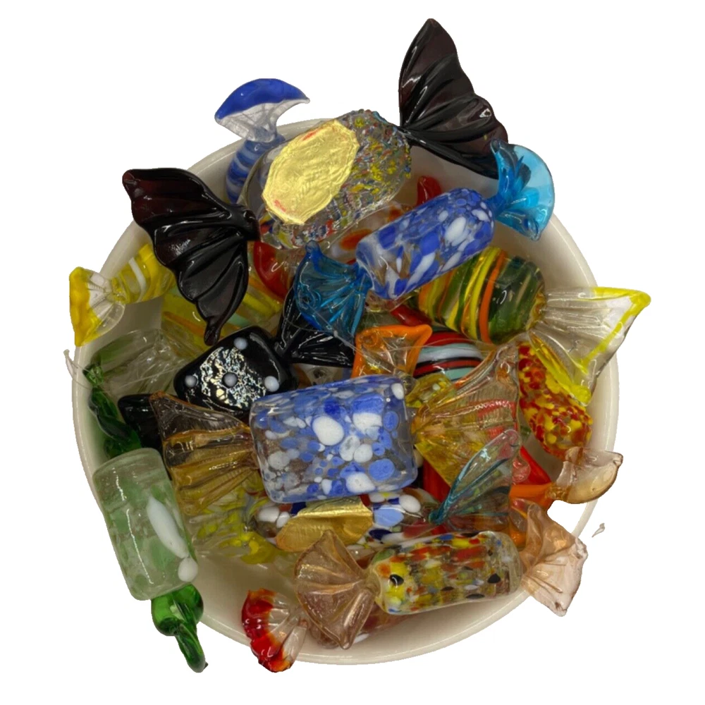 This is a vintage collection of 22 hand-blown candy pieces made of glass by Murano, Italy. The candies come in different sizes, ranging from 3 inches to 2 inches, and are multicolored, some are textured and others have a clear string for hanging. Two come with original Murano sticker. They feature carvings, a 3D effect, high gloss, translucent, and some have a textured finish. The candies are bright and have a total weight of 1 lb 10 oz. They are perfect for all occasions and are ideal for adults who love art. Set only includes 22 candies. These exquisite set of Original Murano are in overall good condition. However, two pieces have chipped corners. Some have clear strings attached for hanging. Please refer to pictures.