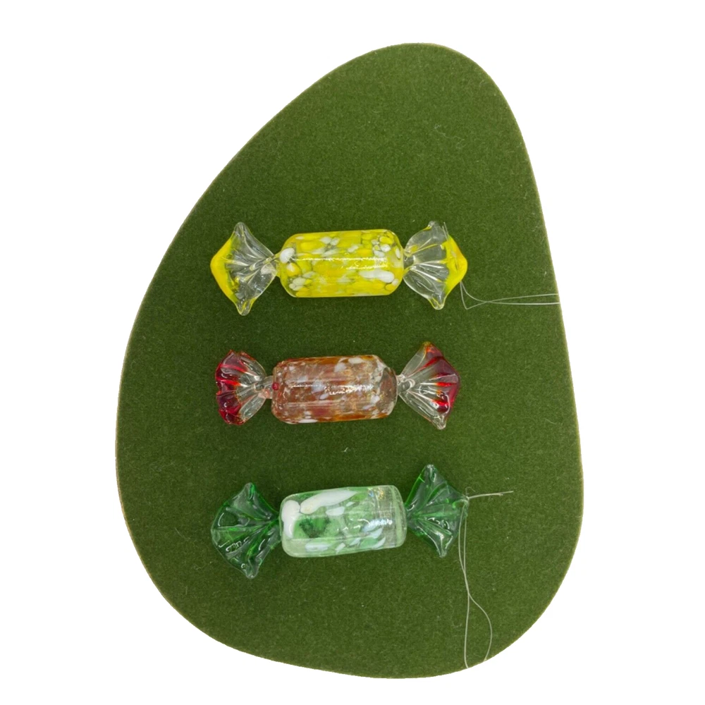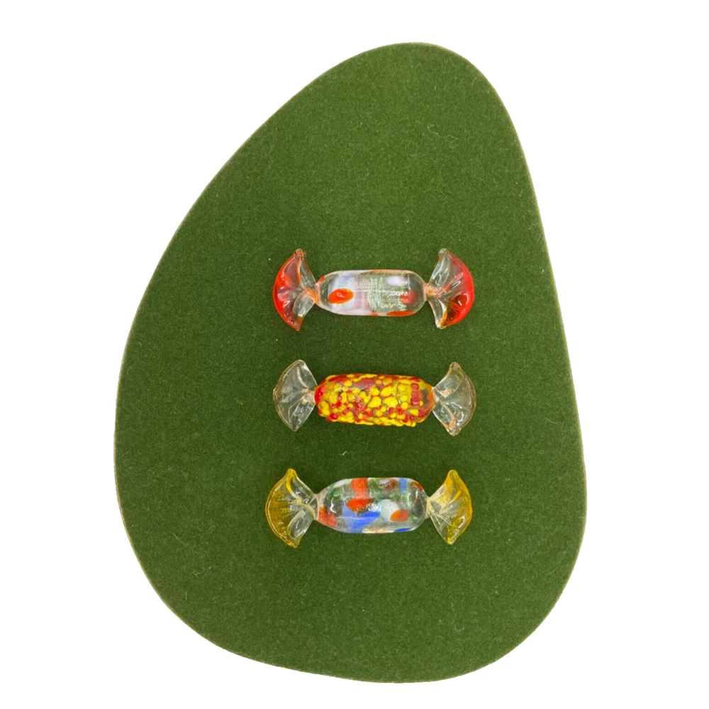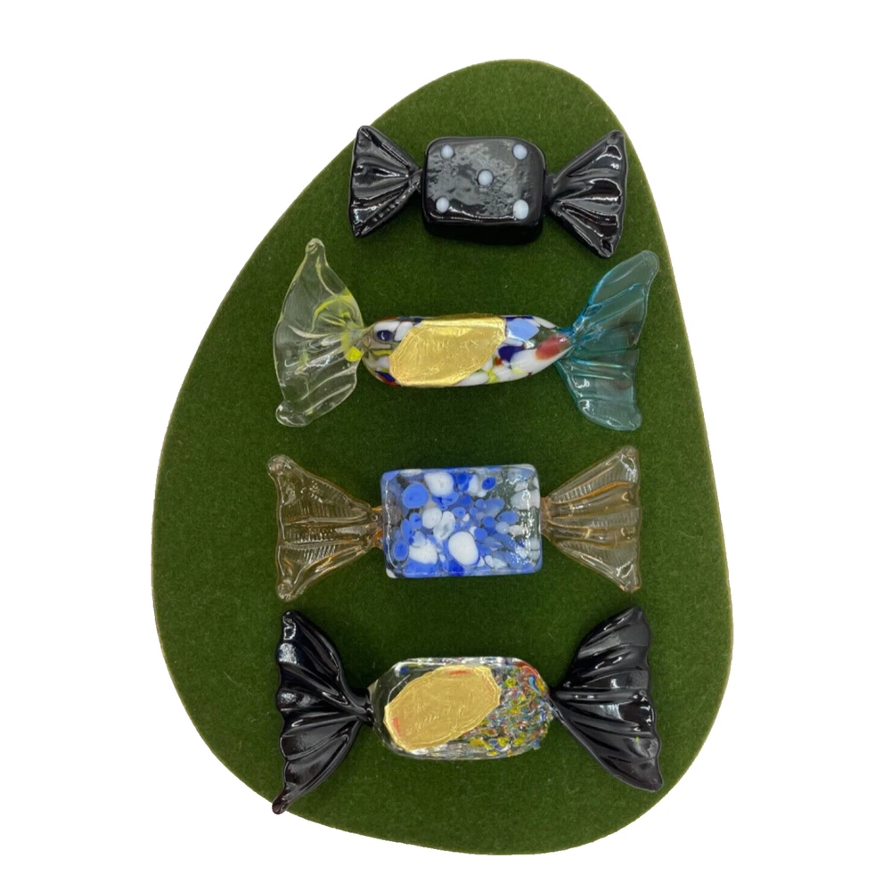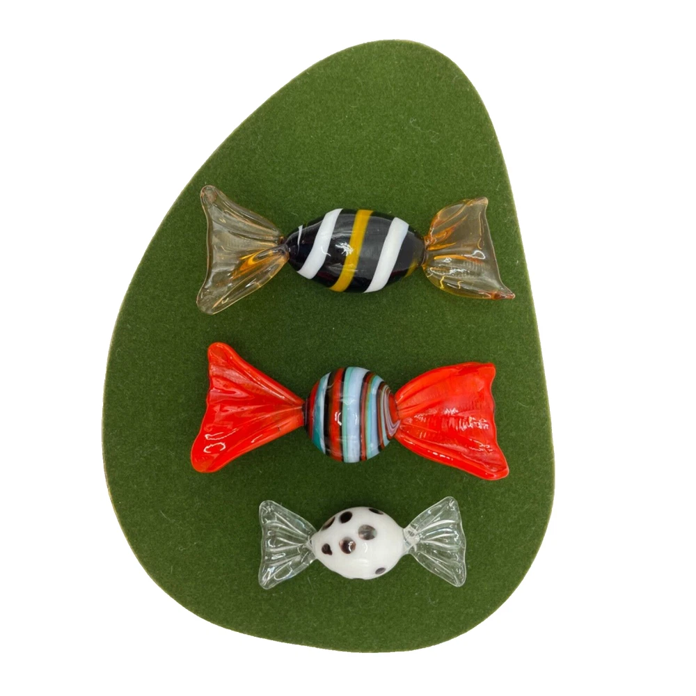 This is a vintage collection of 22 hand-blown candy pieces made of glass by Murano, Italy. The candies come in different sizes, ranging from 3 inches to 2 inches, and are multicolored, some are textured and others have a clear string for hanging. Two come with original Murano sticker. They feature carvings, a 3D effect, high gloss, translucent, and some have a textured finish. The candies are bright and have a total weight of 1 lb 10 oz. They are perfect for all occasions and are ideal for adults who love art. Set only includes 22 candies. These exquisite set of Original Murano are in overall good condition. However, two pieces have chipped corners. Some have clear strings attached for hanging. Please refer to pictures.